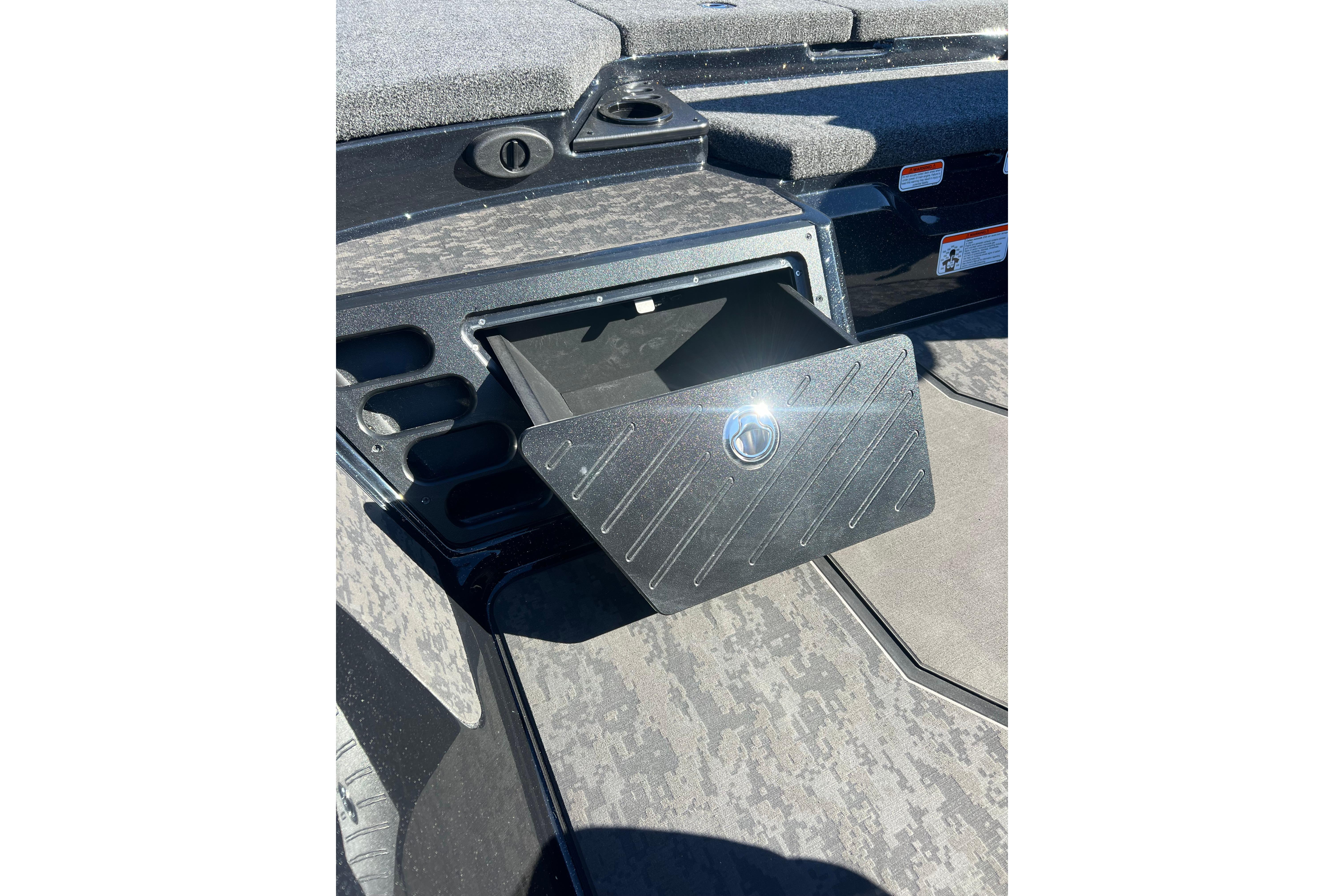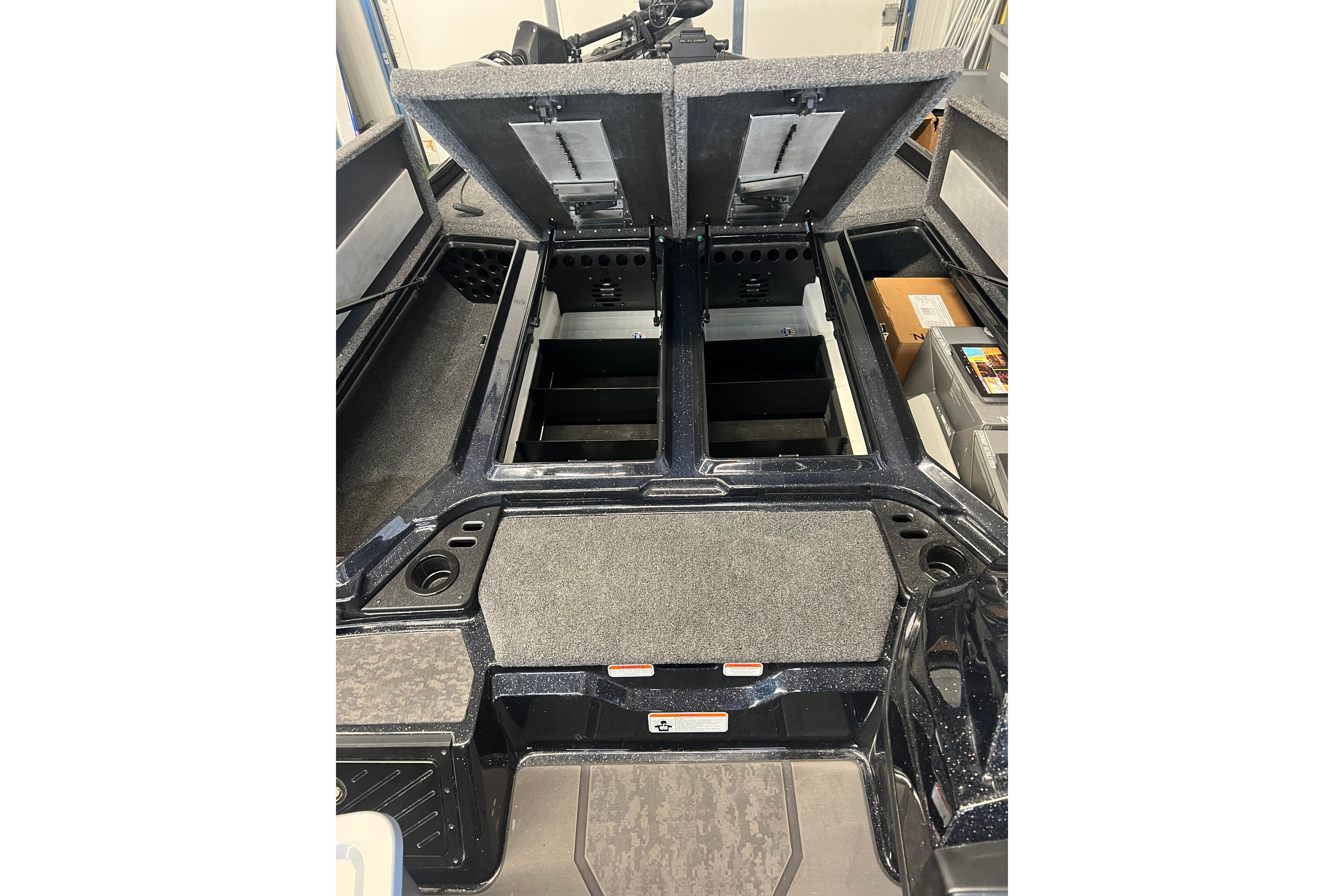 • Oversized, lockable bow port & starboard rod lockers w/lift assists for rods up to 8' (2.44 m) & 23 tapered tubes in port locker