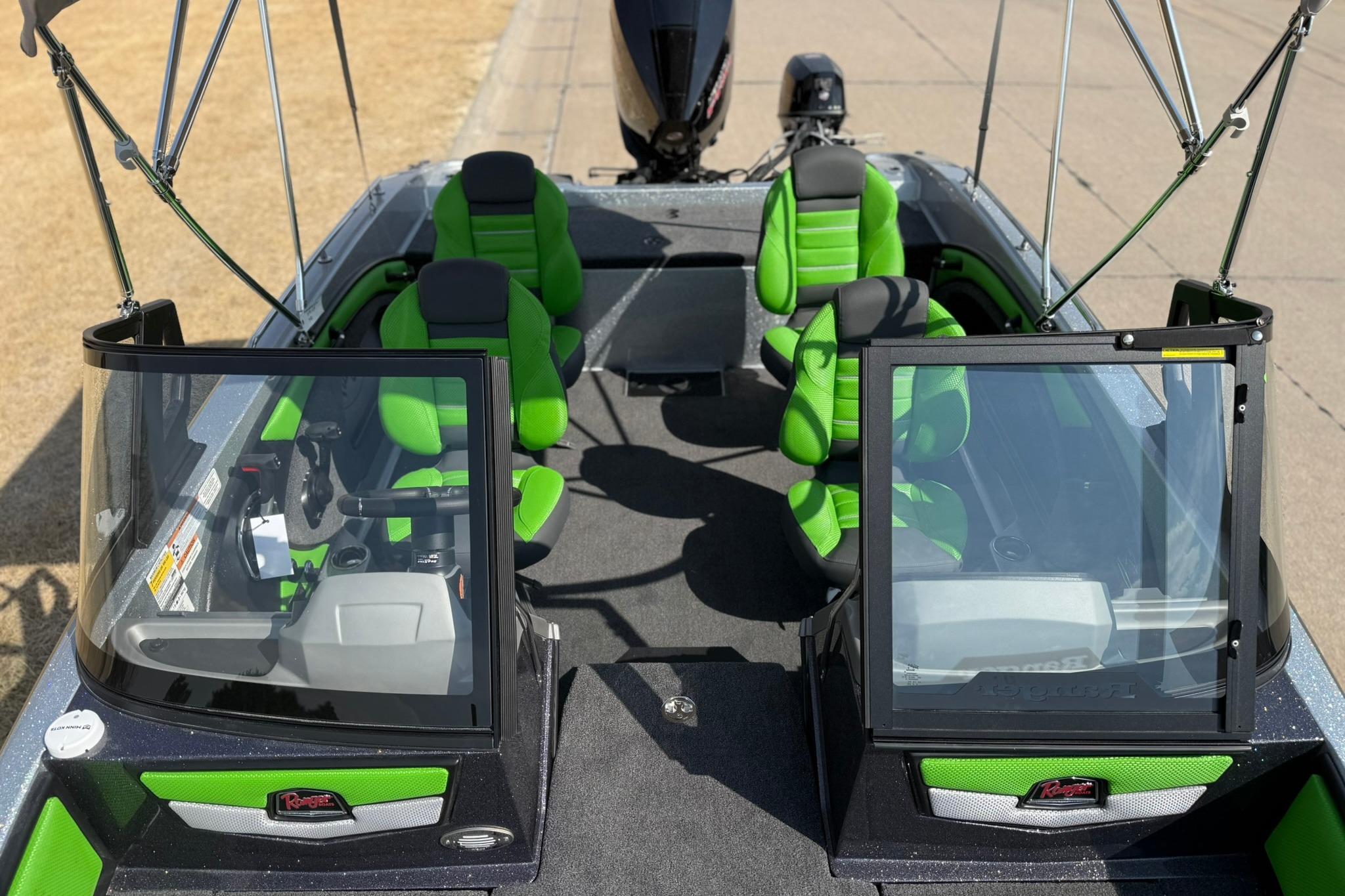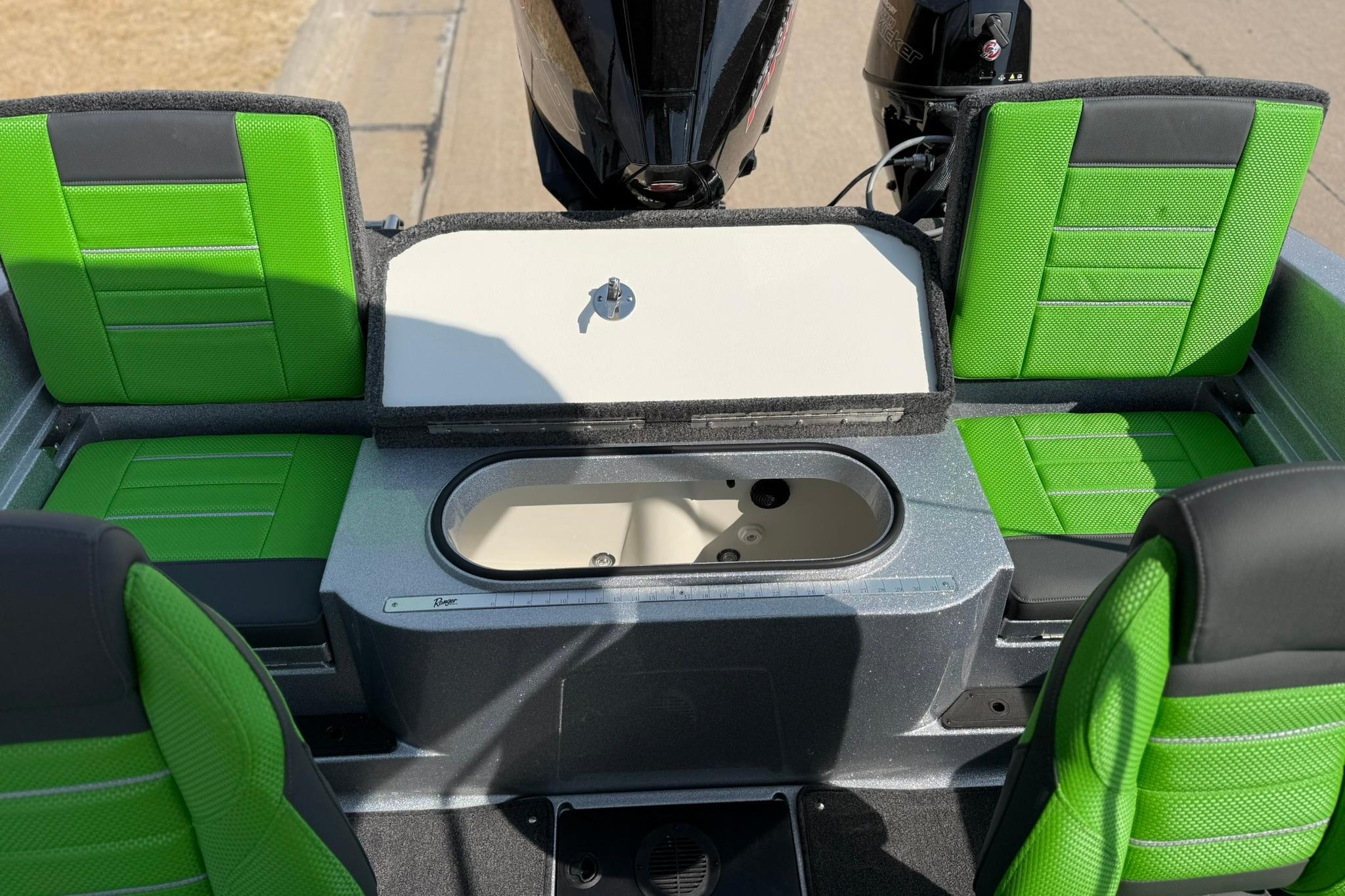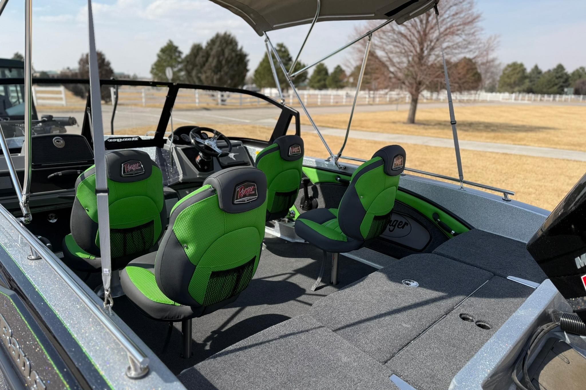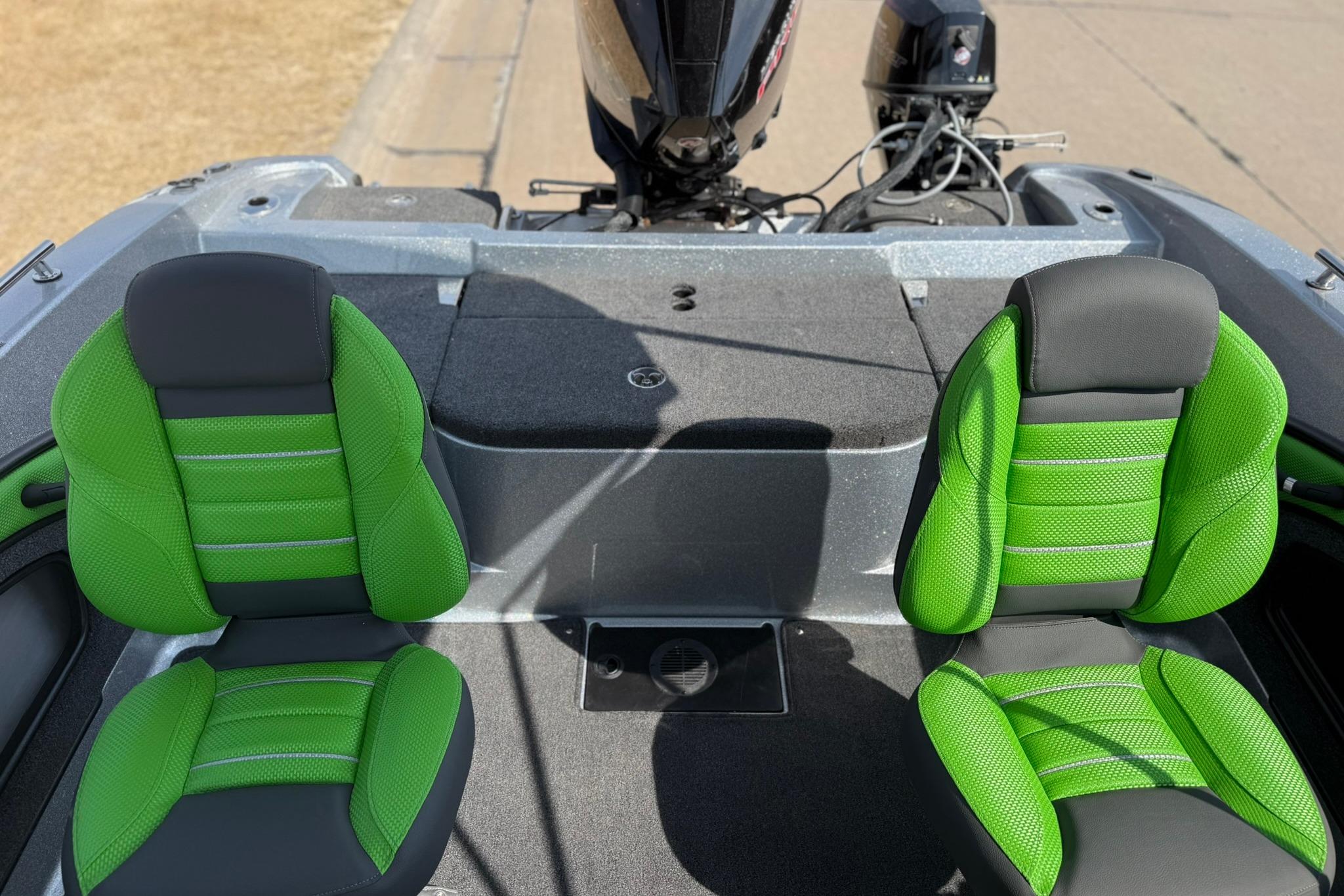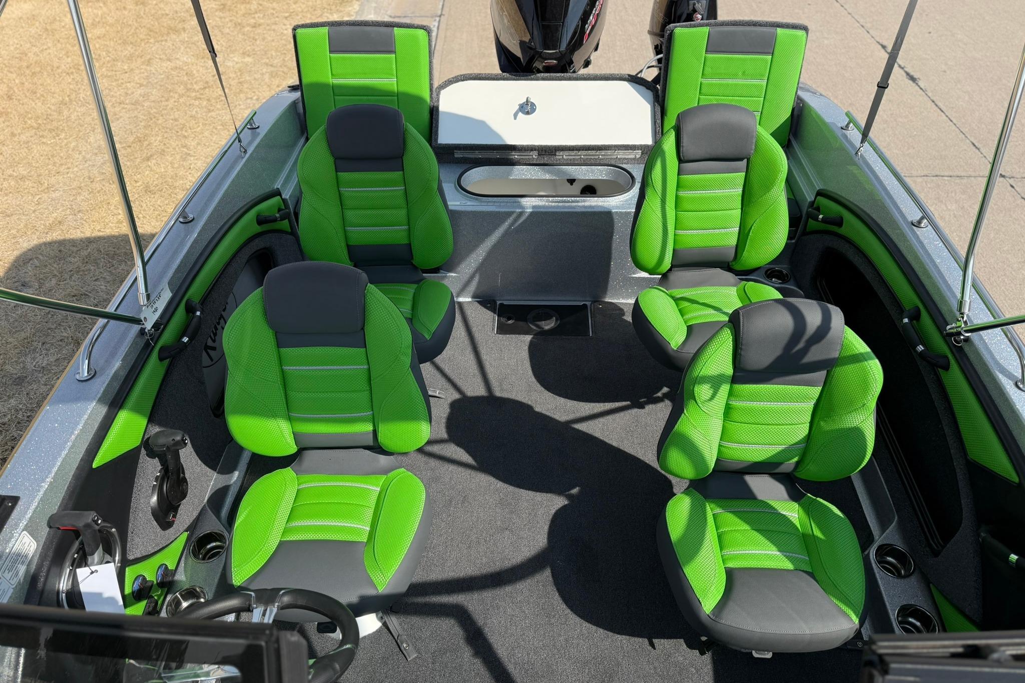 • Custom-fitted premium marine upholstery - (4) Soft Ride Seating (SRS) fold-downs w/ (2) bell pedestal with adjustable slide and (2) 15" non-adjustable posts
