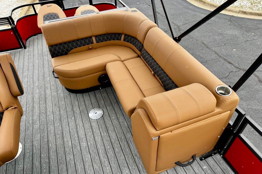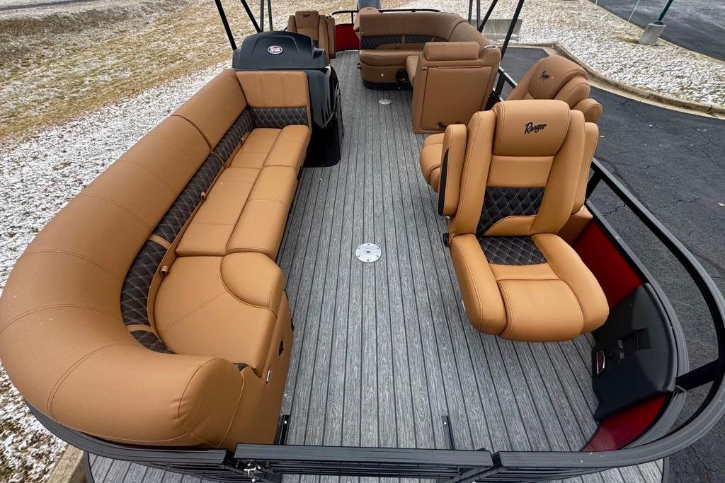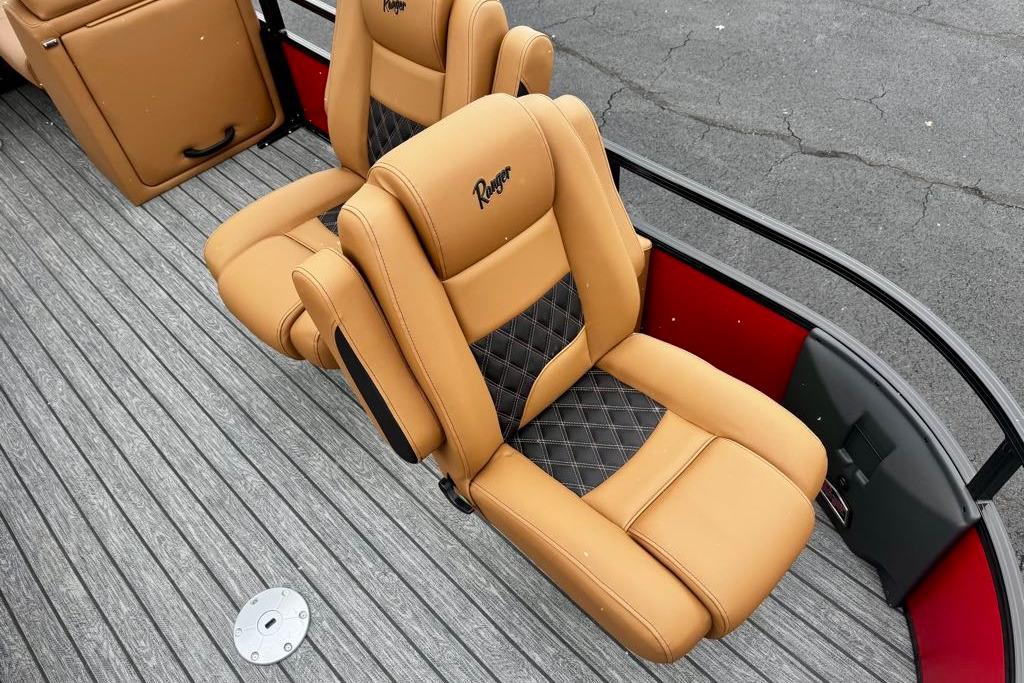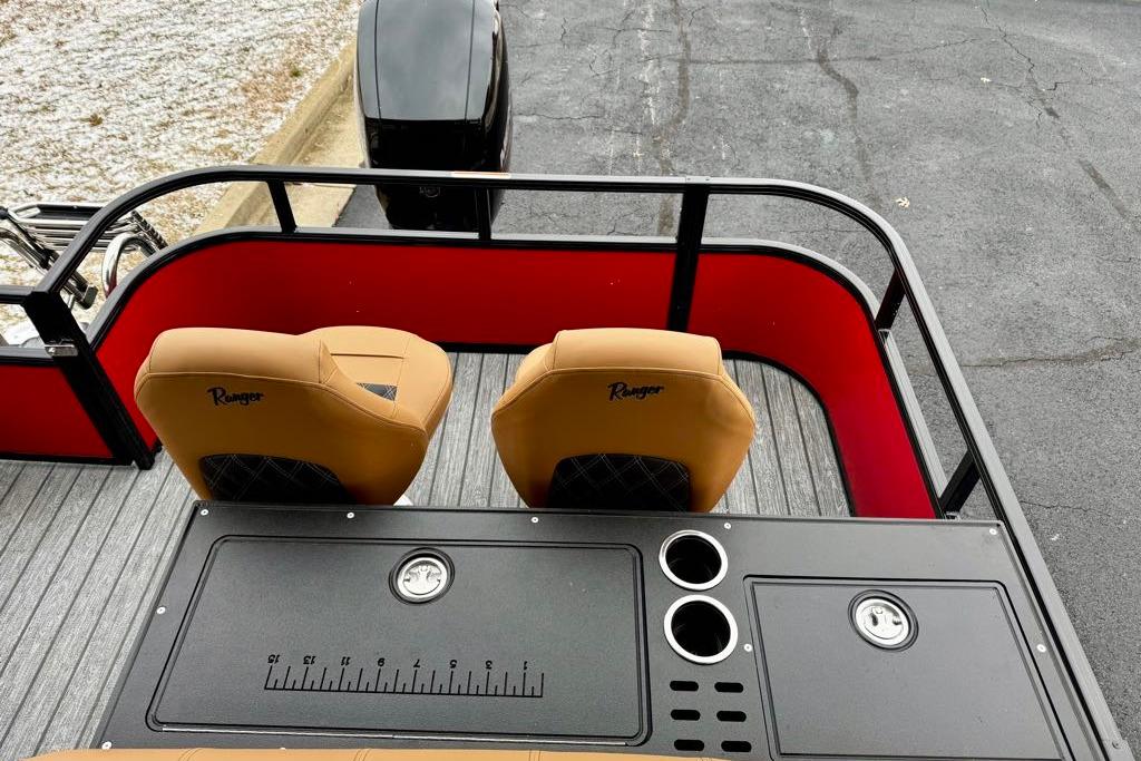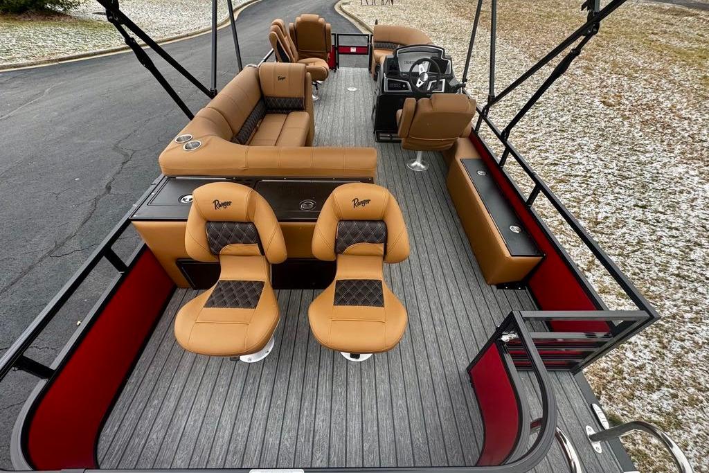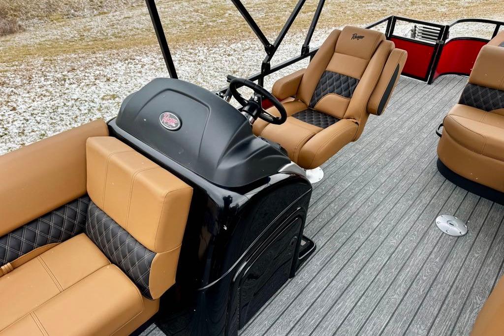 The helm carries a full array of switching and gauges, including the Ranger System Monitor that lets you keep an eye on critical engine parameters and more. An optional fishfinder is the centerpiece of the functional masterpiece, and the overstuffed seat swivels to take in all the action. A huge 10’ Bimini top with LED lights keeps things cool and adds ambiance at dusk and nighttime.