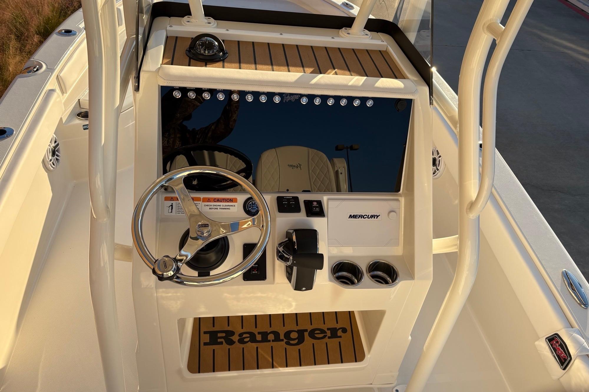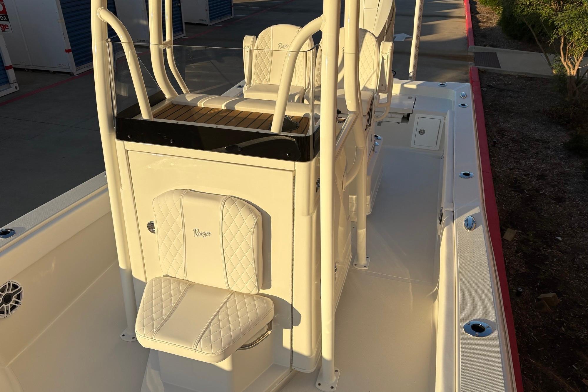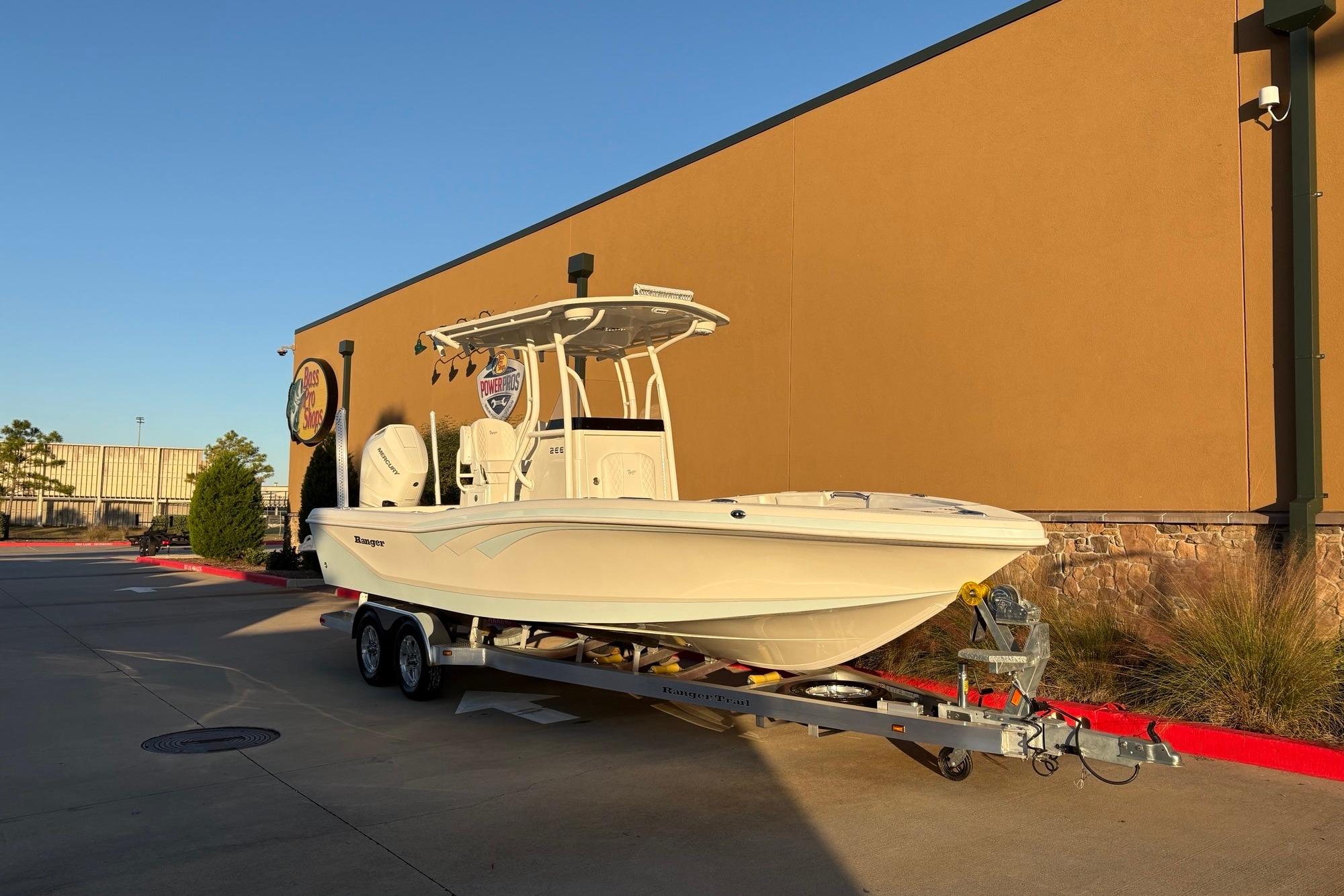 The 2660 Bay Ranger builds on Ranger’s sterling lineup of bay boats with a new hull, expanded capability and an extreme attention to detail to deliver incredible performance and fishability to pursue saltwater species around the globe. Twin rod storages and a massive fish box highlight the angler-centric front deck that is ideal for casting jigs or nets. Live bait rides behind the helm seat and/or in the front deck step for quick access to keep the bite going while rod holders throughout keep your gear handy. A rear swim platform and optional front-deck cushions add versatility to the 2660 for a family-oriented outing, but when it’s time to get after the fish the 400-horsepower rating offers excitement on demand. The Ranger 2660 boasts ample muscle for all of your blue water quests.