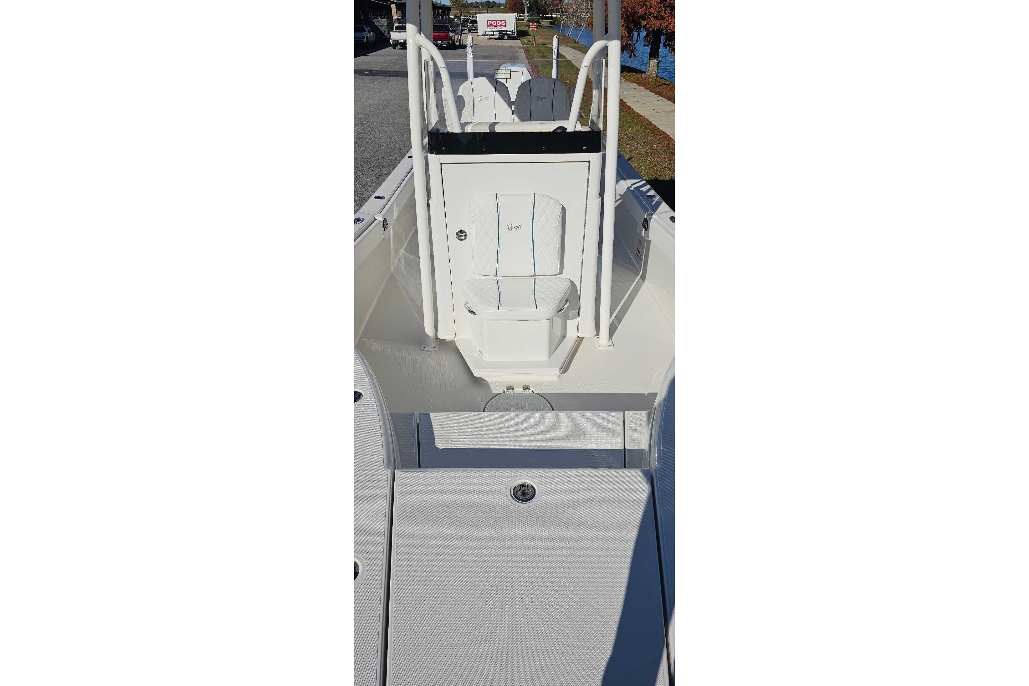 The 2660 Bay Ranger builds on Ranger’s sterling lineup of bay boats with a new hull, expanded capability and an extreme attention to detail to deliver incredible performance and fishability to pursue saltwater species around the globe. Twin rod storages and a massive fish box highlight the angler-centric front deck that is ideal for casting jigs or nets. Live bait rides behind the helm seat and/or in the front deck step for quick access to keep the bite going while rod holders throughout keep your gear handy. A rear swim platform and optional front-deck cushions add versatility to the 2660 for a family-oriented outing, but when it’s time to get after the fish the 400-horsepower rating offers excitement on demand. The Ranger 2660 boasts ample muscle for all of your blue water quests.