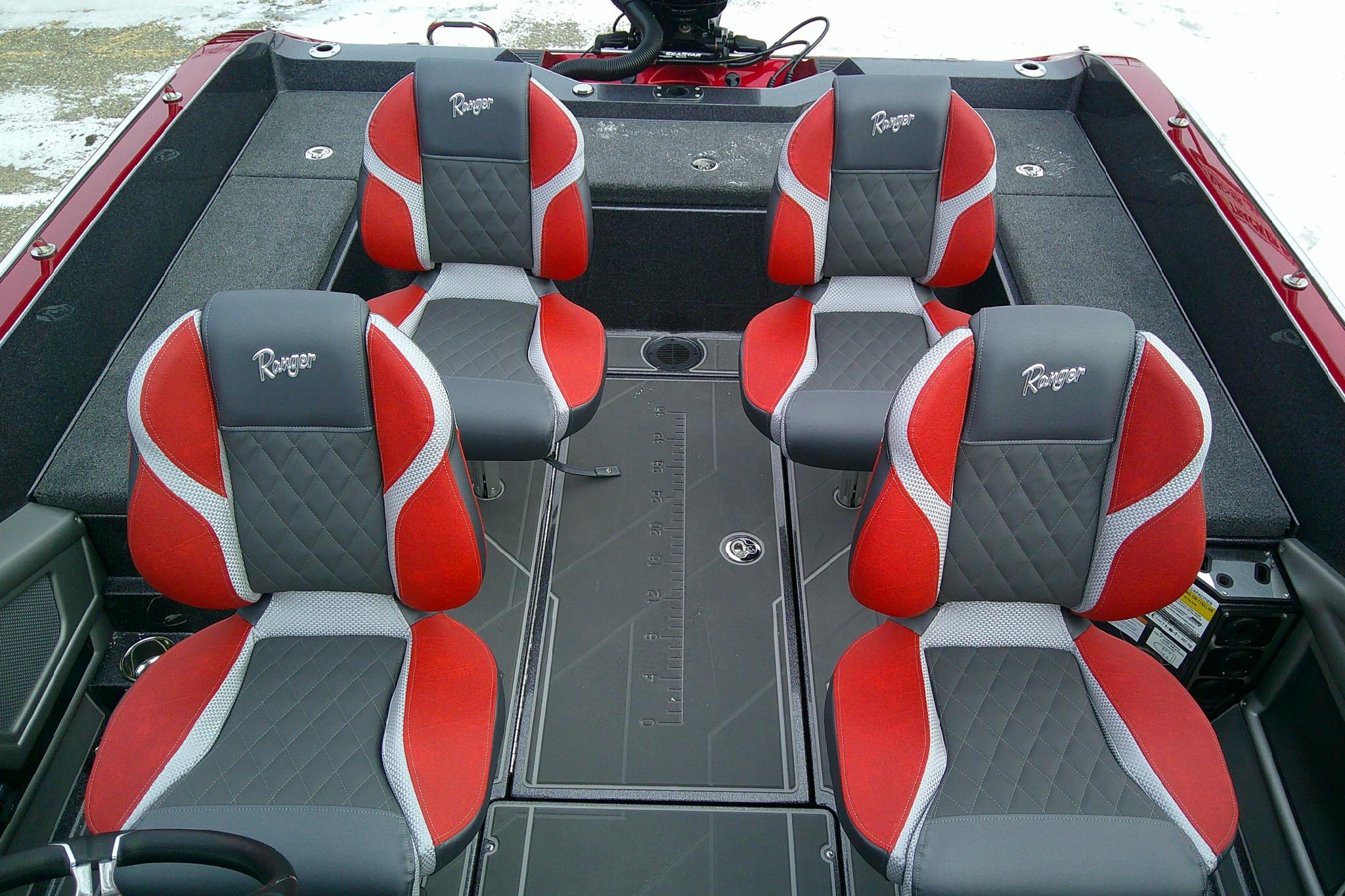 • Custom fitted premium marine upholstery - (2) driver/passenger tall-back Soft Ride Seating (SRS) fold-downs w/ (2) adjustable slides and (2) soft-ride bell pedestals and (2) SRS fold-downs w/ power pedestals