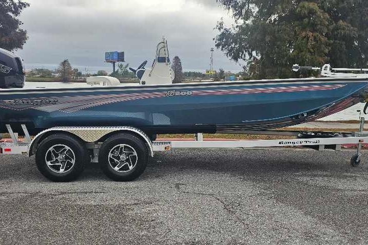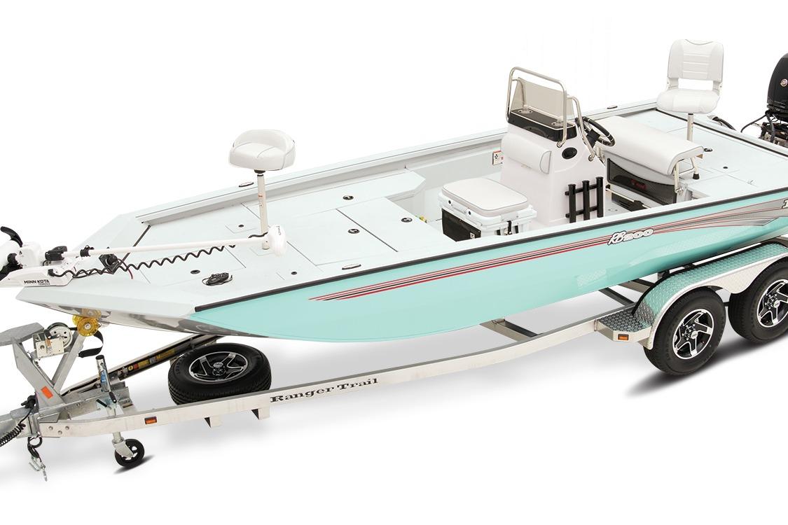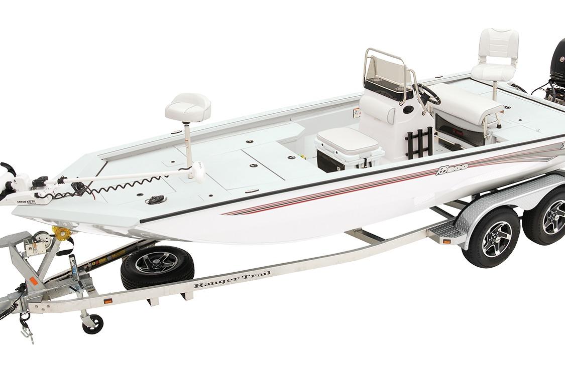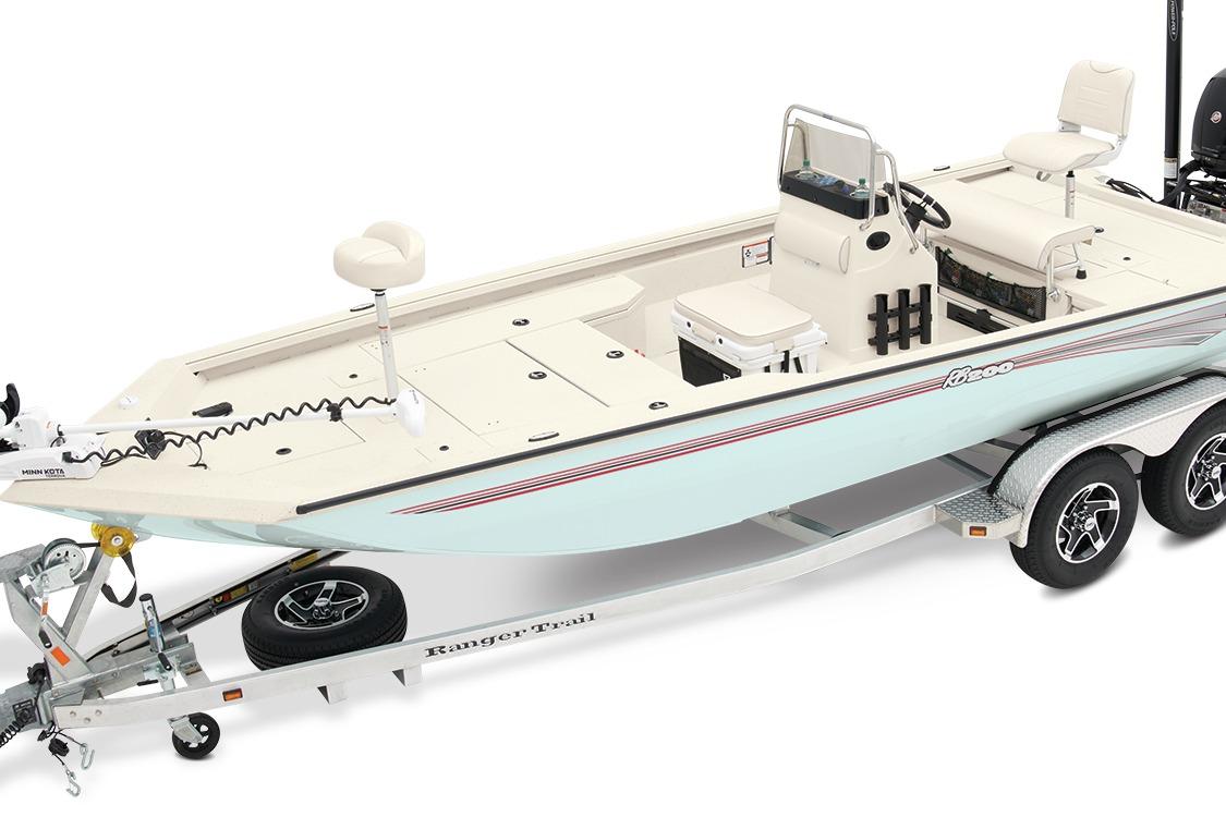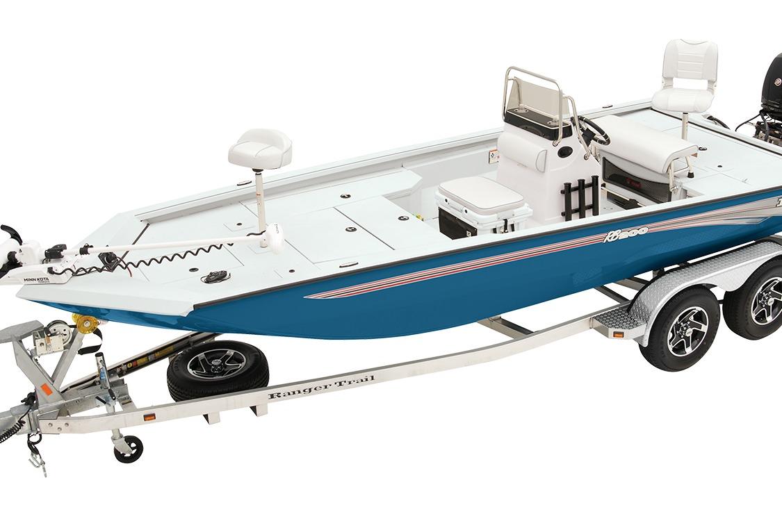 The RB200 packs more muscle in a bigger hull for greater performance, stability and capability to take you further than ever. The pad-bottom hull is designed for a dry ride that planes in a hurry, even in the shallows. The all-welded hull delivers strength in chop while precision steering and throttle control give you the ultimate in command. The wide, stable front casting deck delivers huge room for multiple anglers, and the interior is perfectly tailored for taking on inshore fisheries or a bass tournament with dual livewells and rod boxes, a huge in-deck storage and storage under the rear jump seats. At the helm, electronics up to 9" may be flush mounted and membrane-style switching delivers convenient simplicity. The ruggedized Ranger Trail® trailer is constructed with all-welded aluminum for the utmost in corrosion-resistant strength. Diamond plate fenders offer a step up and protection from road debris. A new camo version is more than just a paint scheme, this special rig features blacked-out badging, matte black closures and console railing, along with an all-black steering wheel for maximum concealment. No matter where your quarry swims, the enhanced capability of the RB200 is designed to Dominate Inshore and Nearshore.
