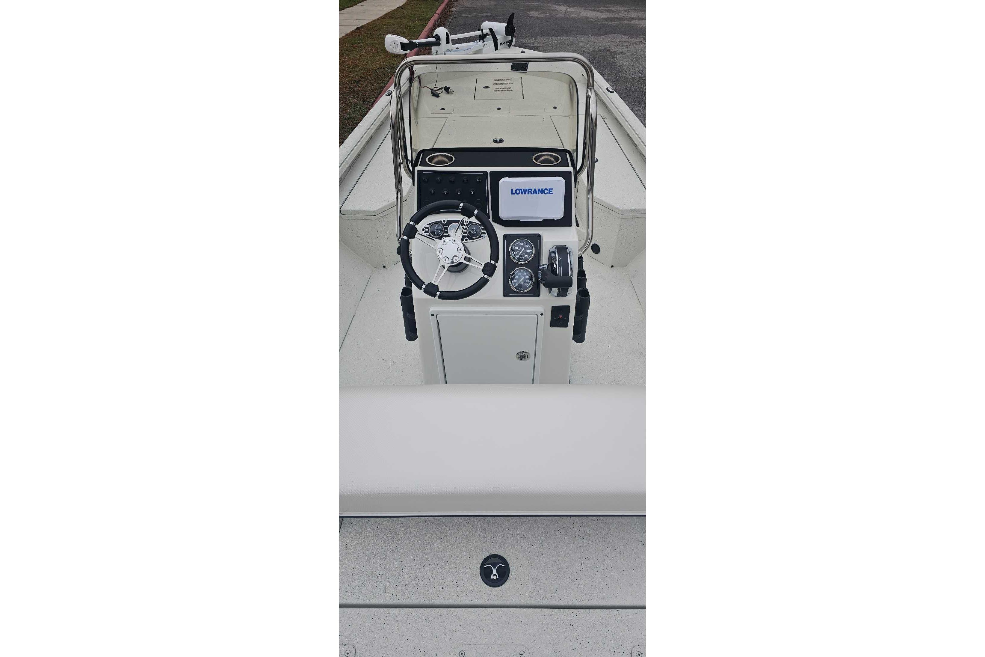 • Custom fiberglass console w/ tach, speed, fuel, trim gauges & easy touch switching