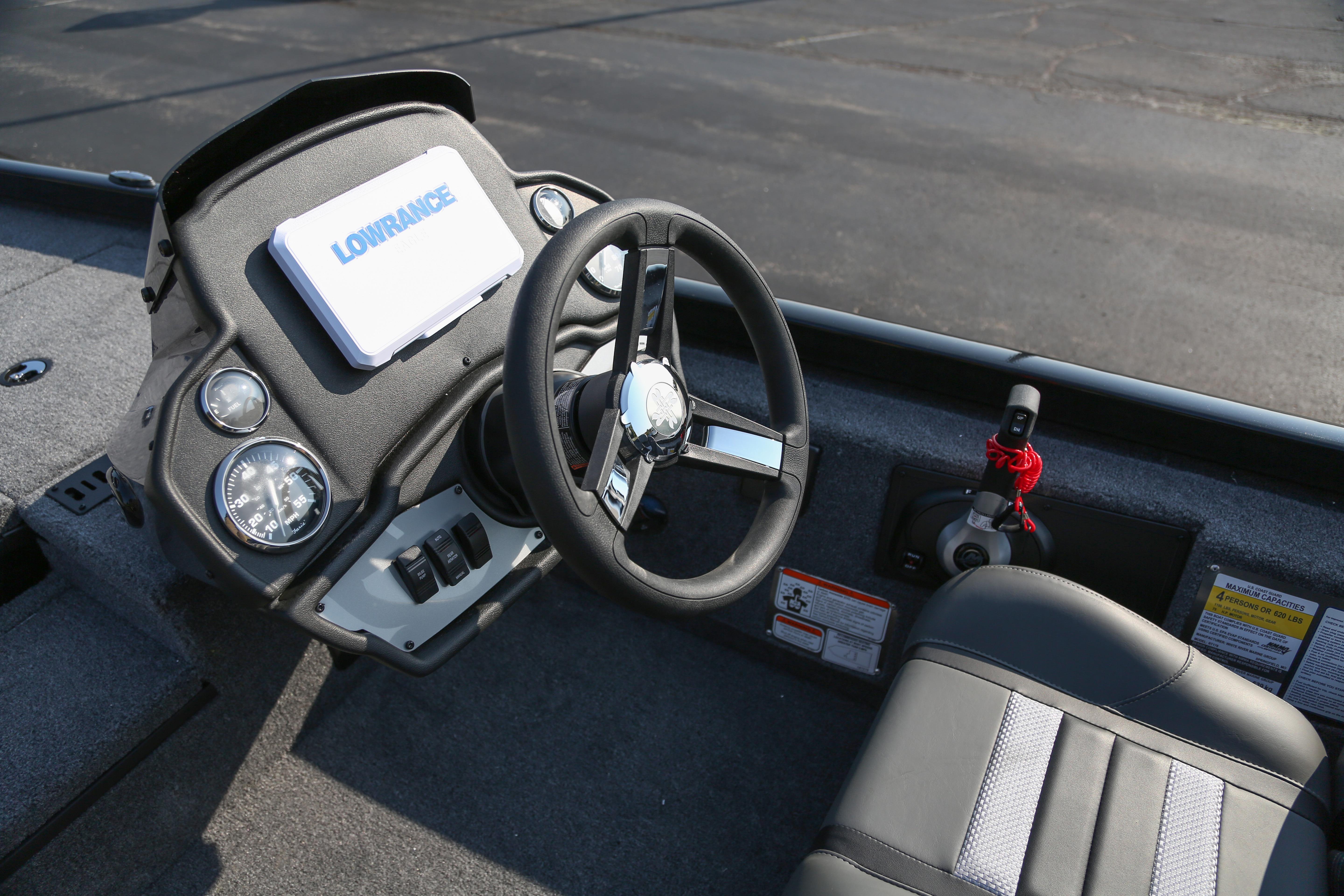• Custom fiberglass console w/ flush-mounted depthfinder, tach, speed, fuel, trim gauge & easy touch switching