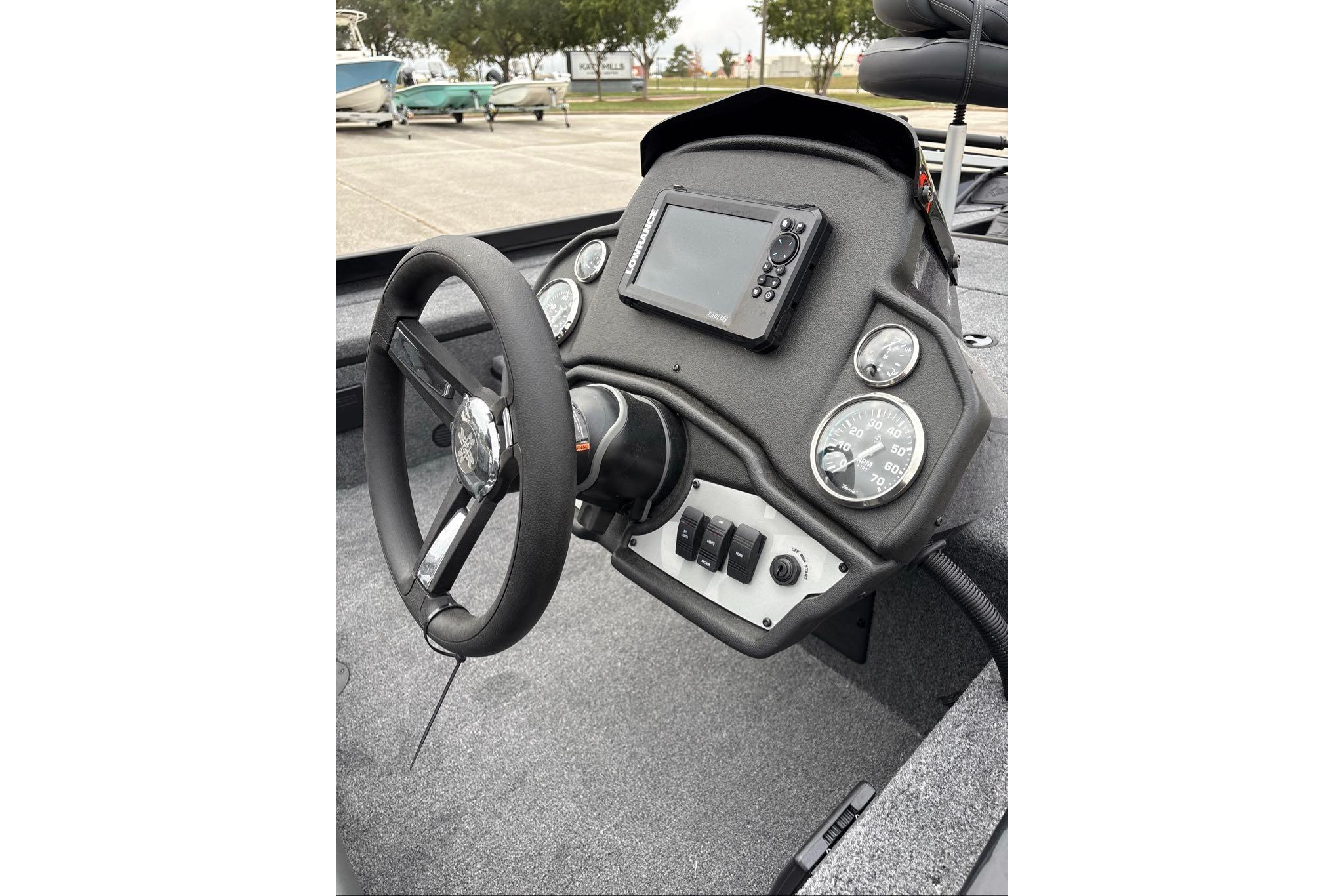 • Custom fiberglass console w/ flush-mounted depthfinder, tach, speed, fuel, trim gauge & easy touch switching