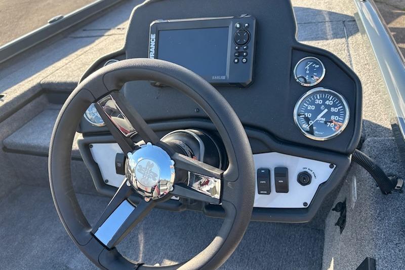 • Custom fiberglass console w/ flush-mounted depthfinder, tach, speed, fuel, trim gauge & easy touch switching