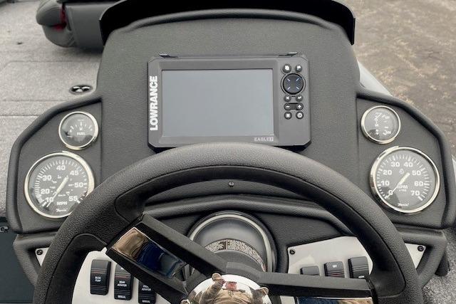 • Custom fiberglass console w/ flush-mounted depthfinder, tach, speed, fuel, trim gauge & easy touch switching