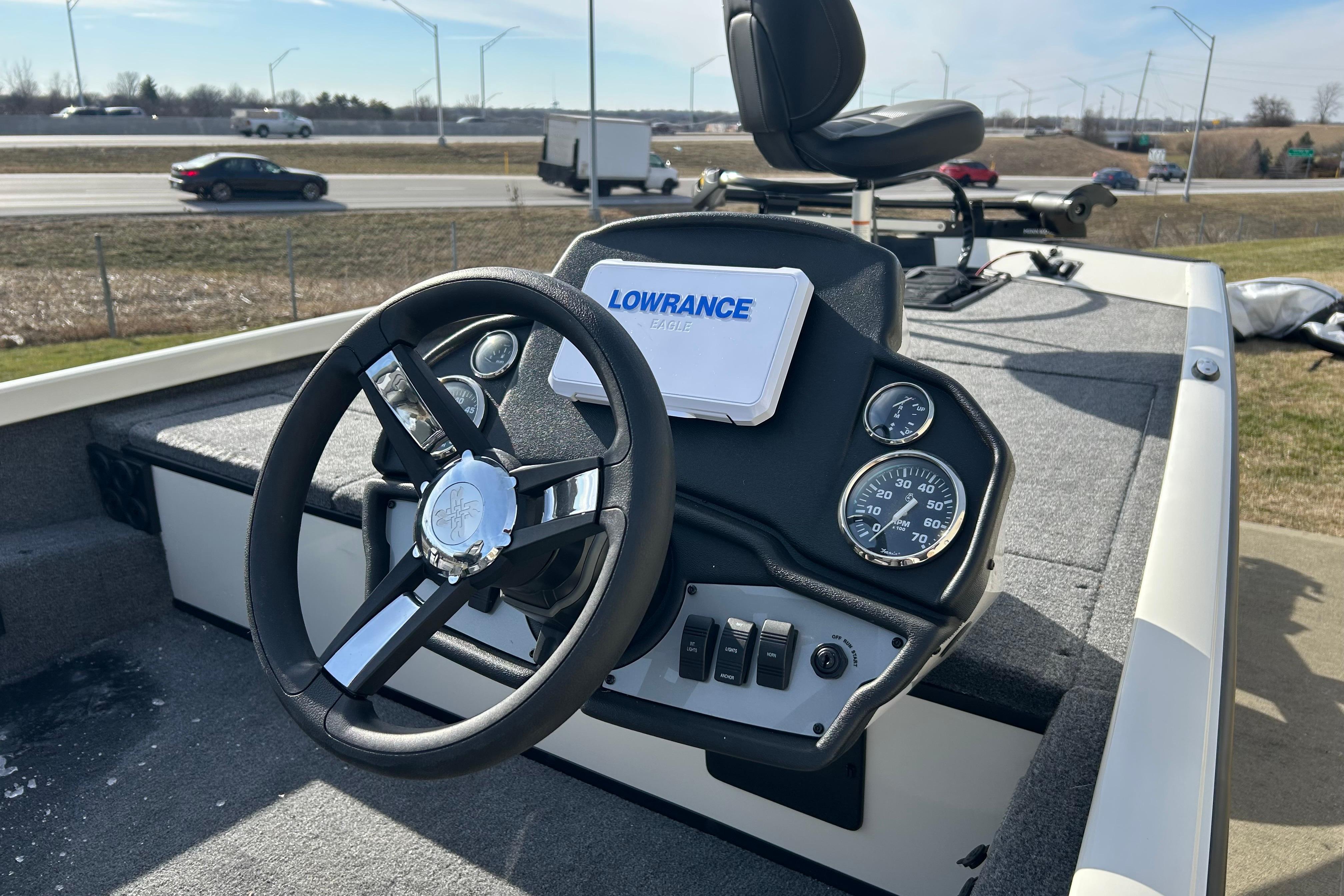 • Custom fiberglass console w/ flush-mounted depthfinder, tach, speed, fuel, trim gauge & easy touch switching