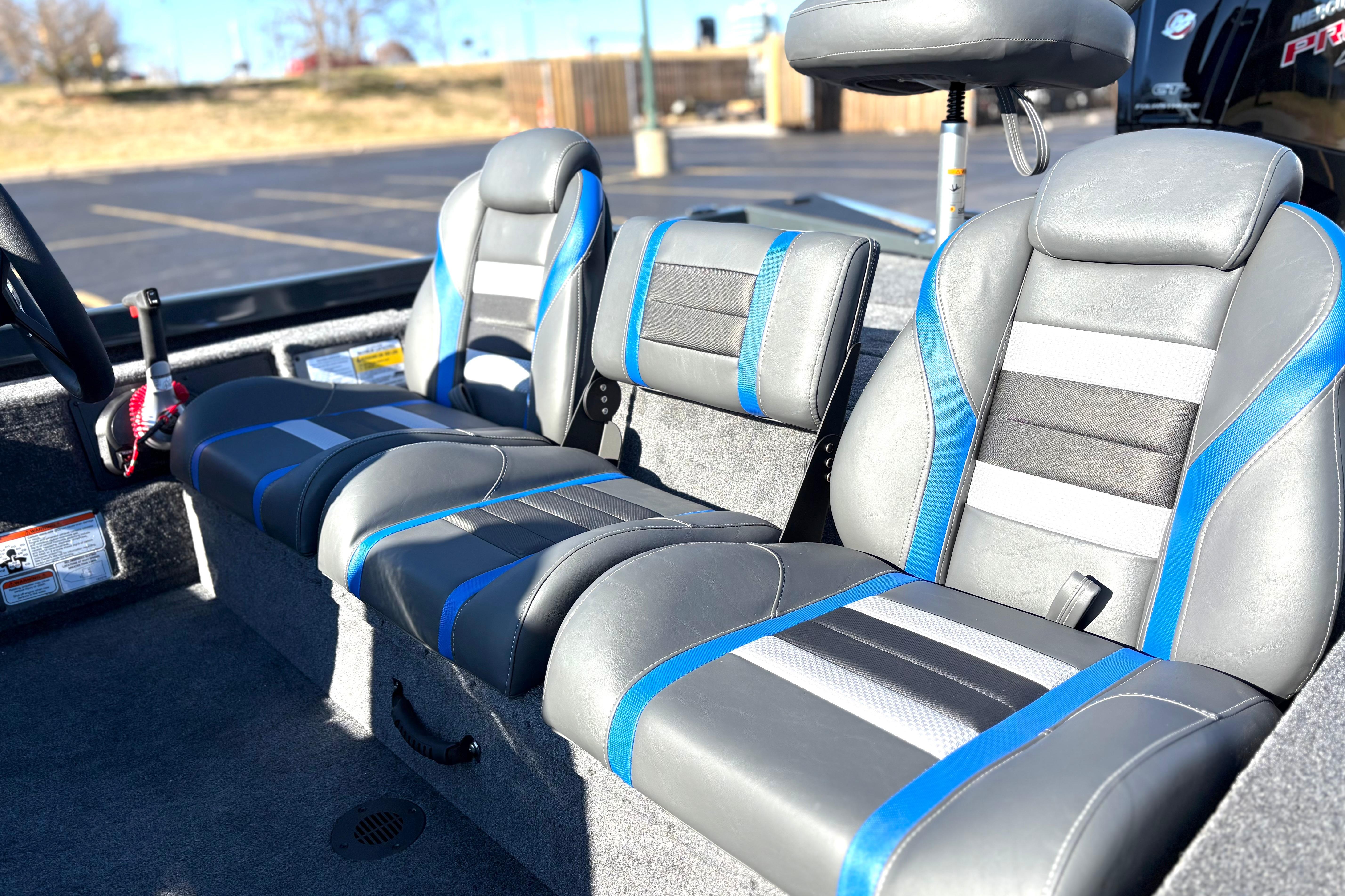 • Custom fitted marine upholstery- driver/passenger bucket seating w/ center fold down & two matching fishing seats