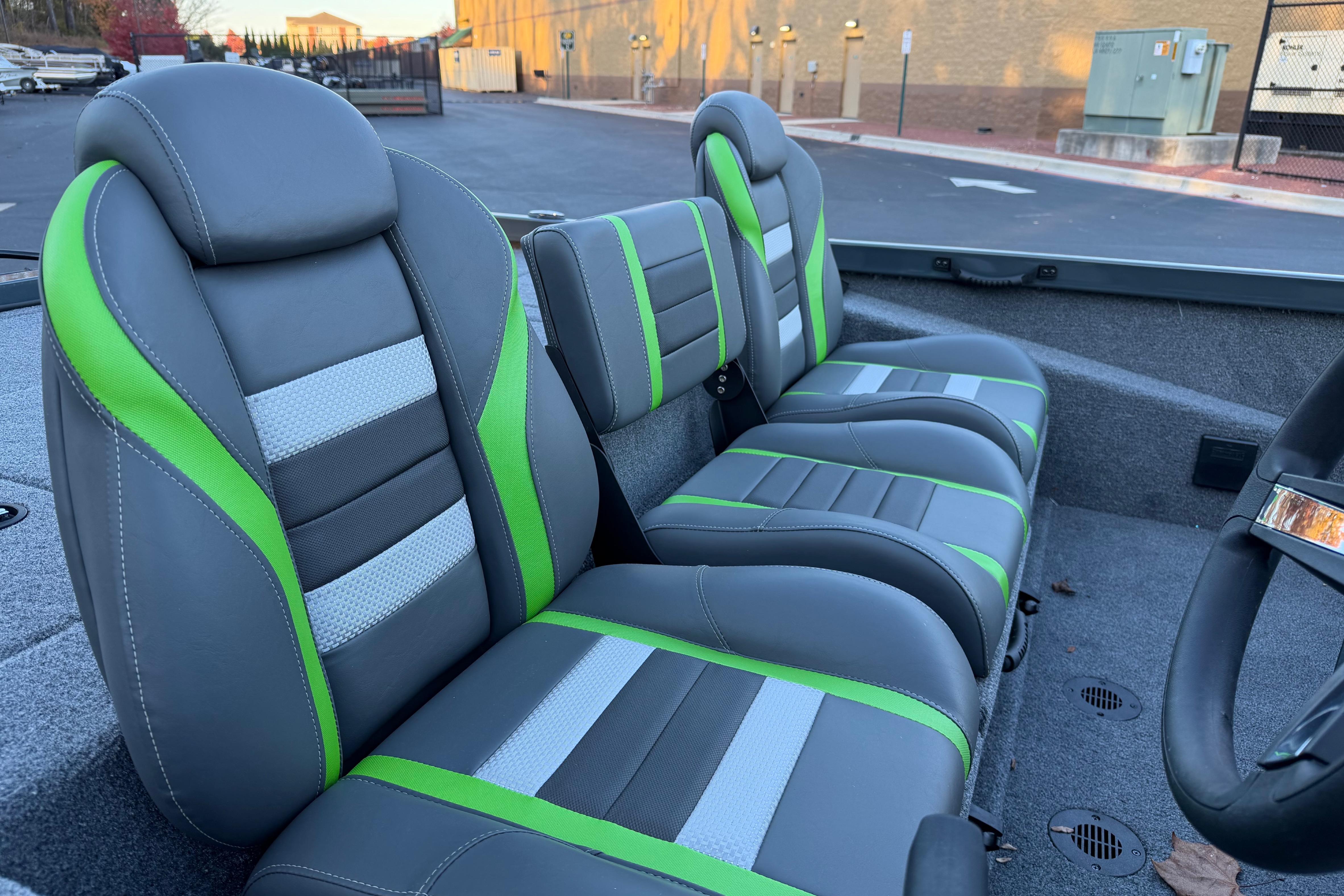 • Custom fitted marine upholstery- driver/passenger bucket seating w/ center fold down & two matching fishing seats
