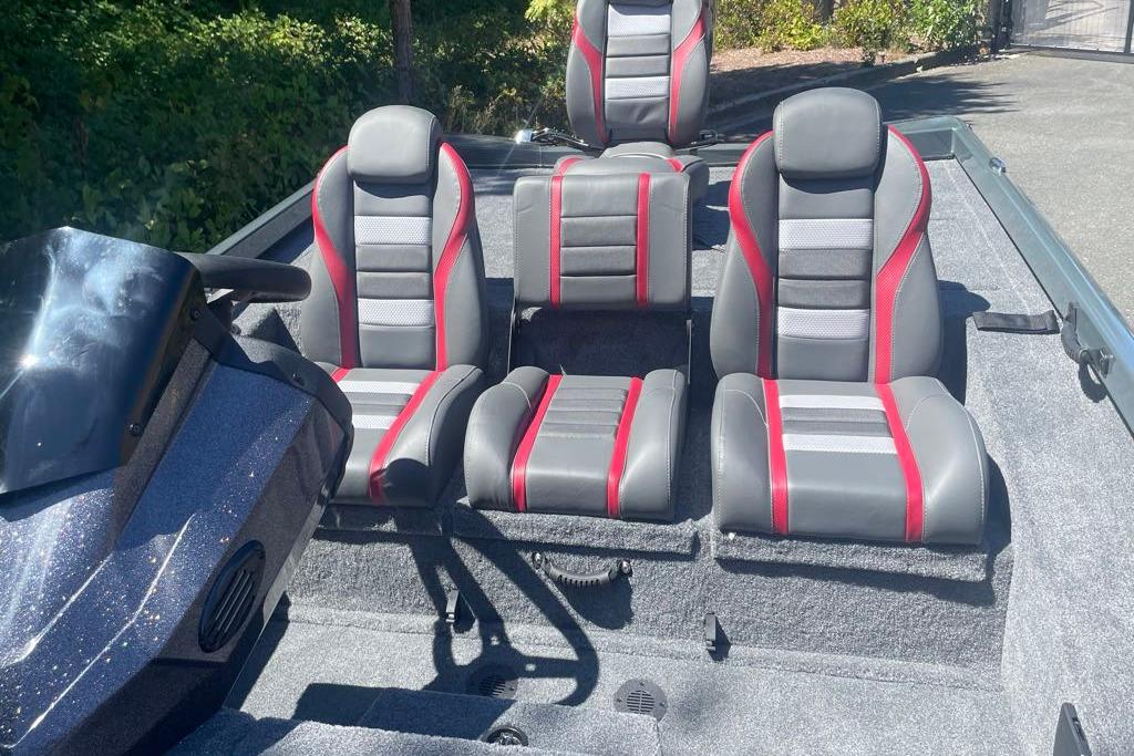 • Custom fitted marine upholstery- driver/passenger bucket seating w/ center fold down & two matching fishing seats