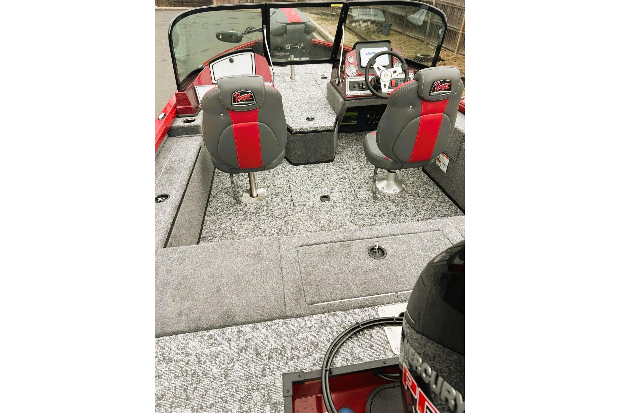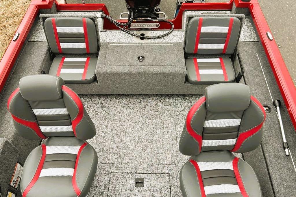 • Custom fitted marine upholstery- (3) matching fishing seats, driver seat slides