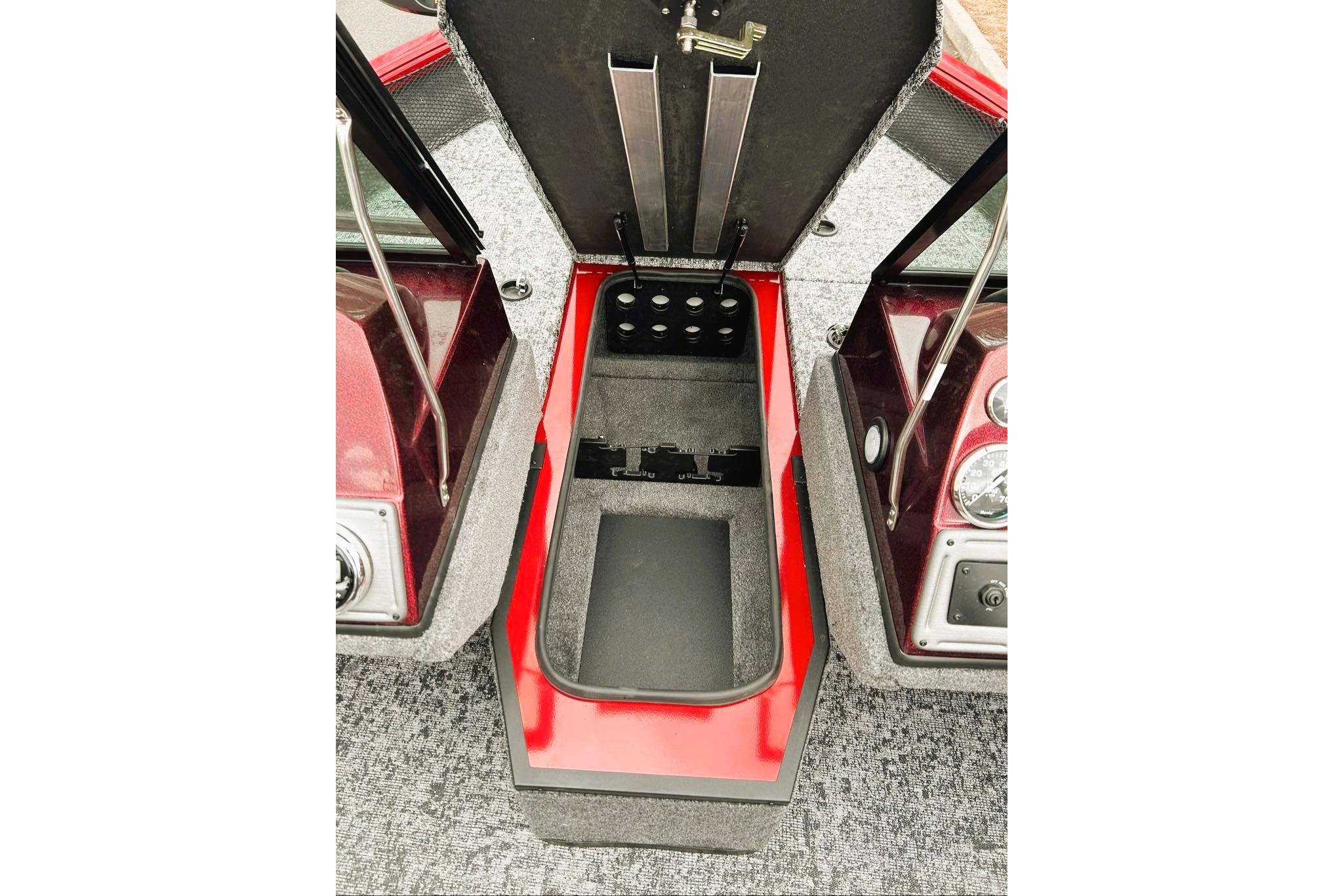 • Custom fiberglass console w/ flush mounted depthfinder, tach, speed, fuel, trim gauges & easy touch switching