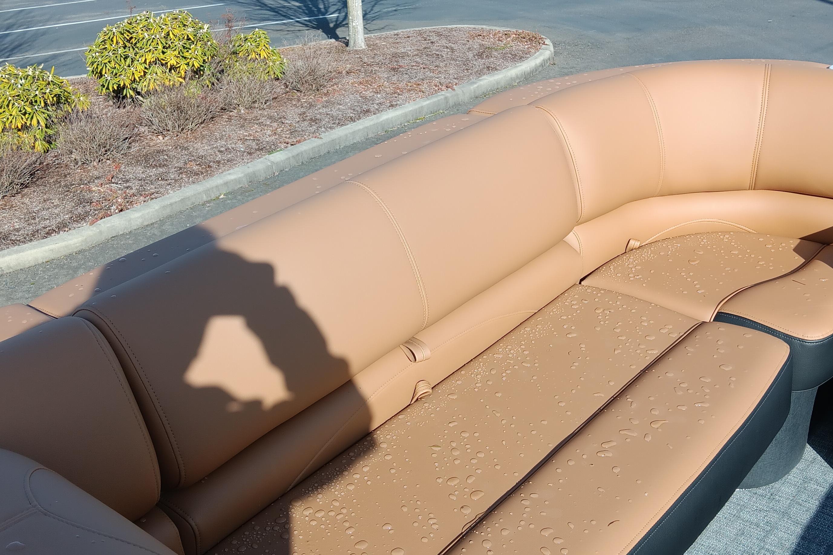 • Wraparound bow port & starboard lounges w/extra-deep cushions, pillowtop backs, lumbar support & lockable storage