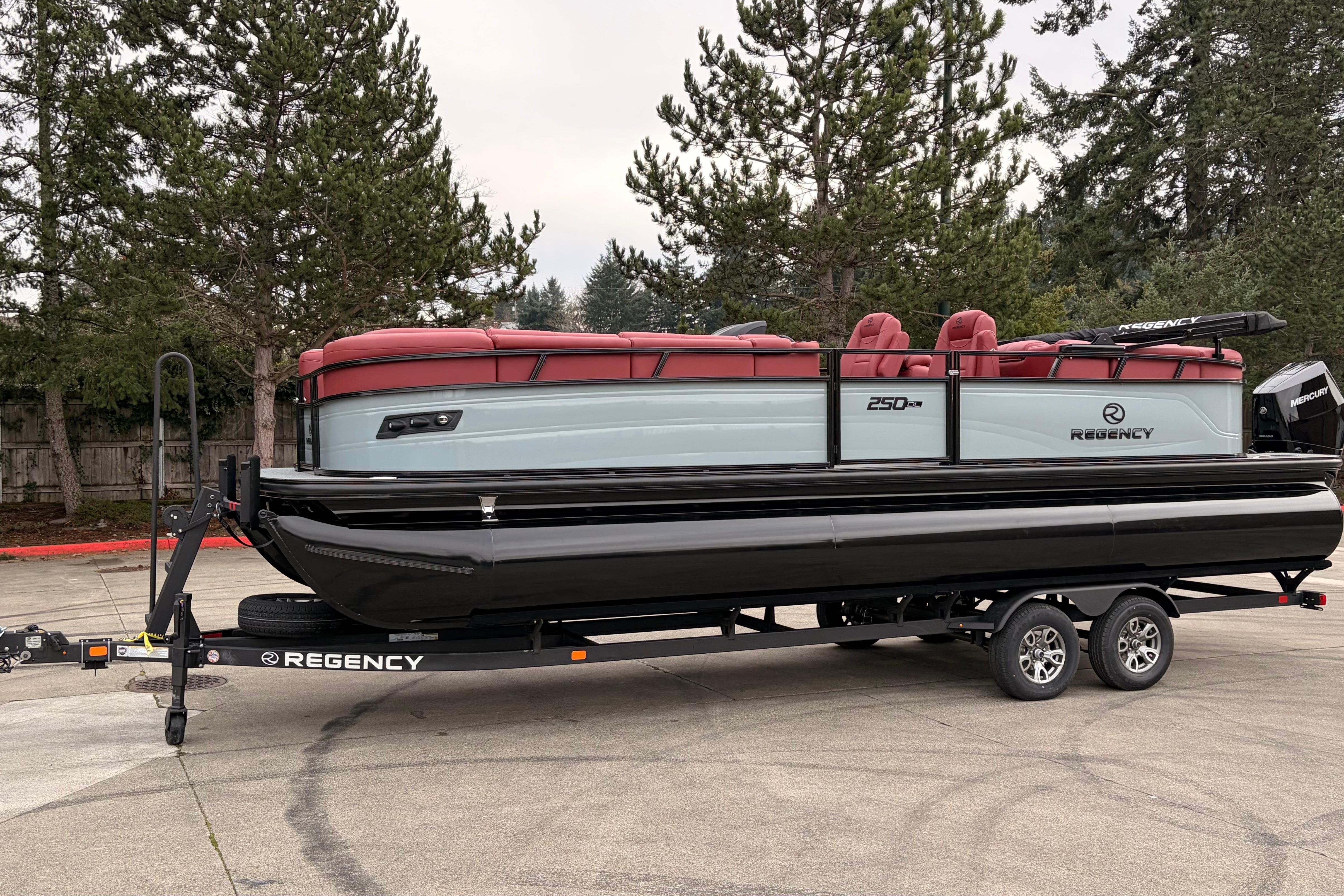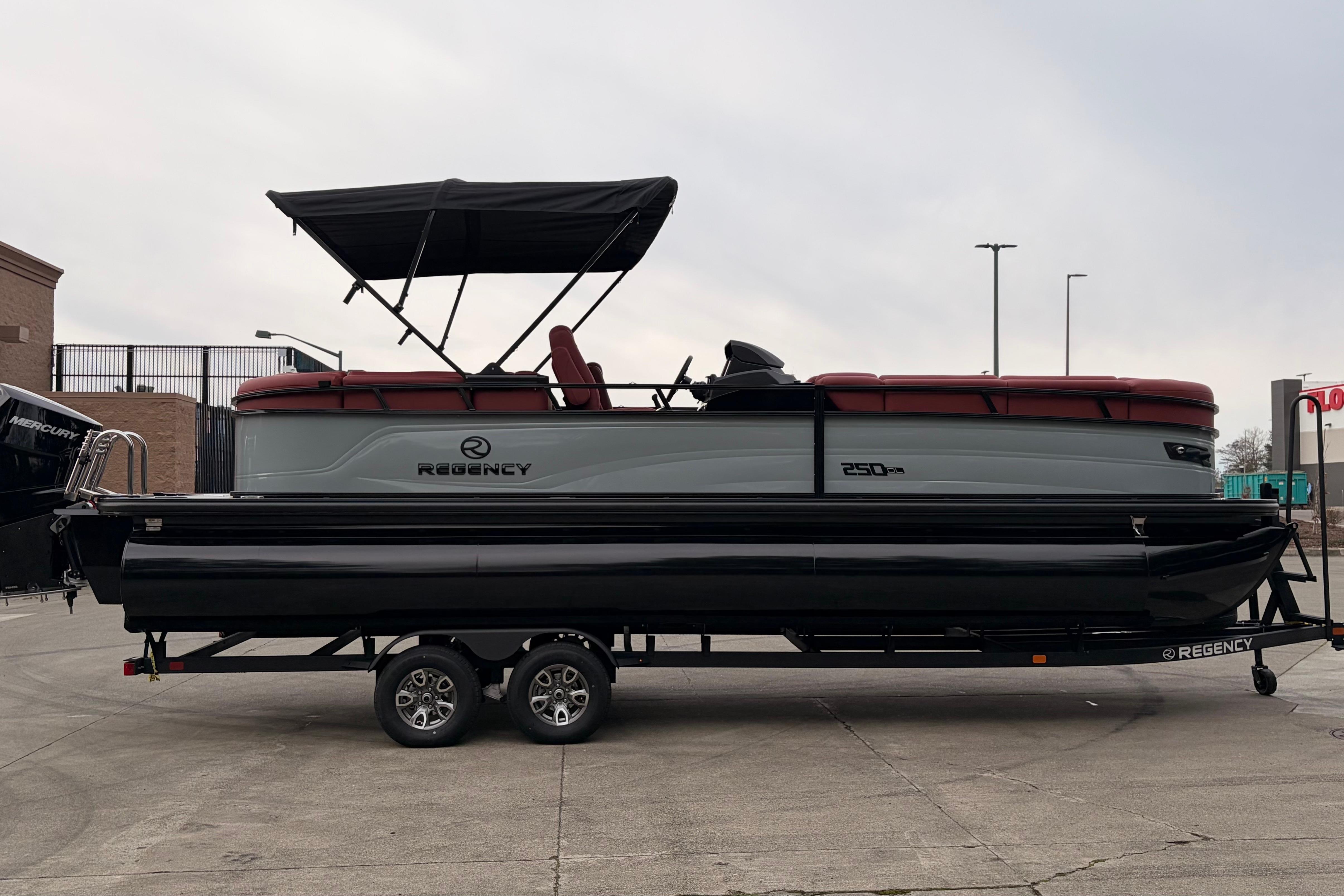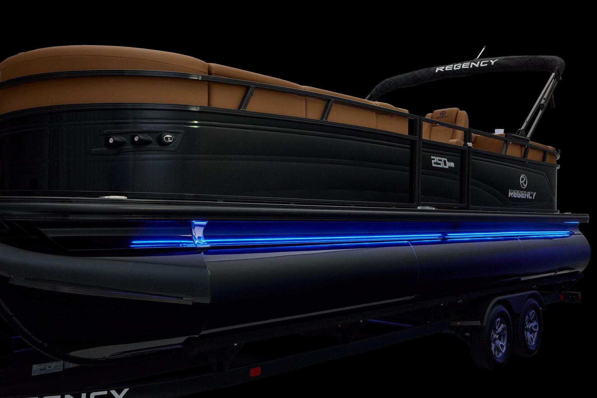 Discover the pinnacle of on-water luxury with the 2026 REGENCY® 250 DL. Designed for those who demand more, this pontoon fuses bold styling, advanced technology, and uncompromising performance. Its signature TRACK FORMED® fencing and DIAMOND COAT™ 3.0 finish set the stage, while a full RGB lighting system—illuminating cup holders, speakers, and exterior accents—creates an atmosphere that moves with your music. Step inside and relax into plush lounges with pillowtop backs, lumbar support, and lockable storage, all complemented by premium woven vinyl flooring and STOW MORE™ quiet-close hinges. Command your experience from the raised helm featuring the REGENCY® omni2™ 12" touchscreen, Bluetooth® connectivity, Wet Sounds® audio, and Scanstrut® wireless charging. Every seat offers USBcports for convenience, while the powered Bimini top and integrated bow/aft cameras deliver confidence and ease. Performance is engineered to thrill with three 26" multichambered logs, power-assisted hydraulic steering, and a removable ski tow pylon with dedicated storage. An extended aft swim platform, new telescoping wide step stainless steel ladder, and LED navigation lights complete a design built for both adventure and leisure. Luxury isn’t just a feature—it’s a feeling. Experience it with the REGENCY® 250 DL.