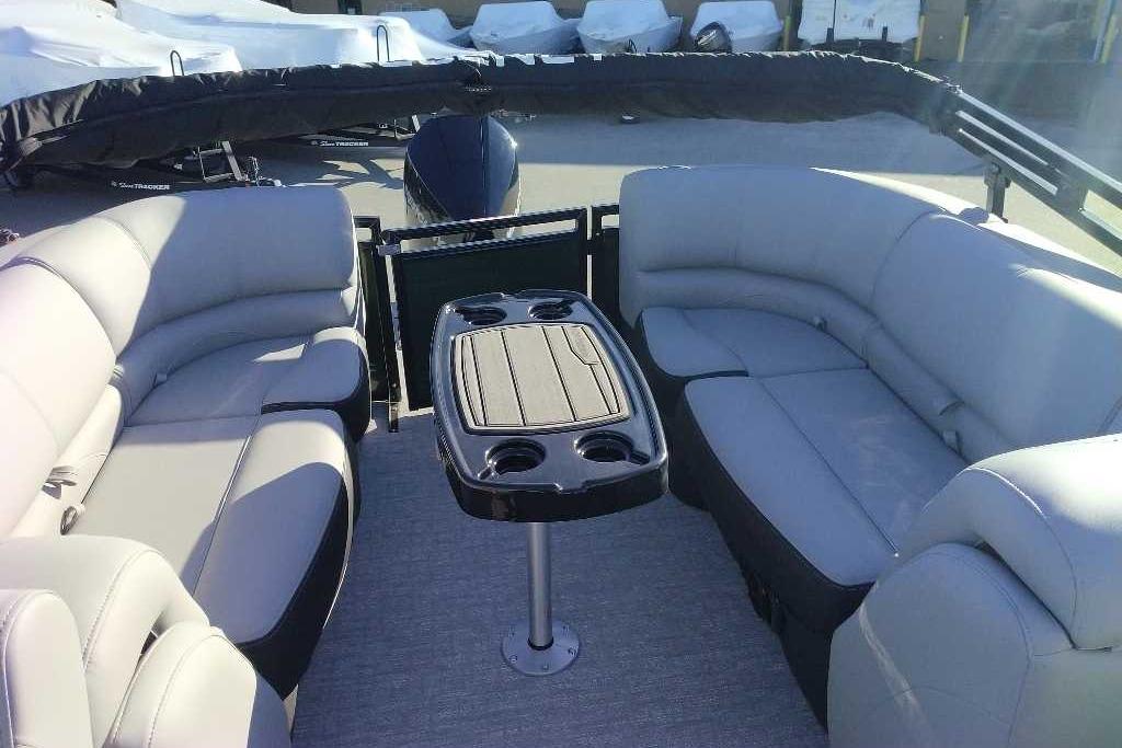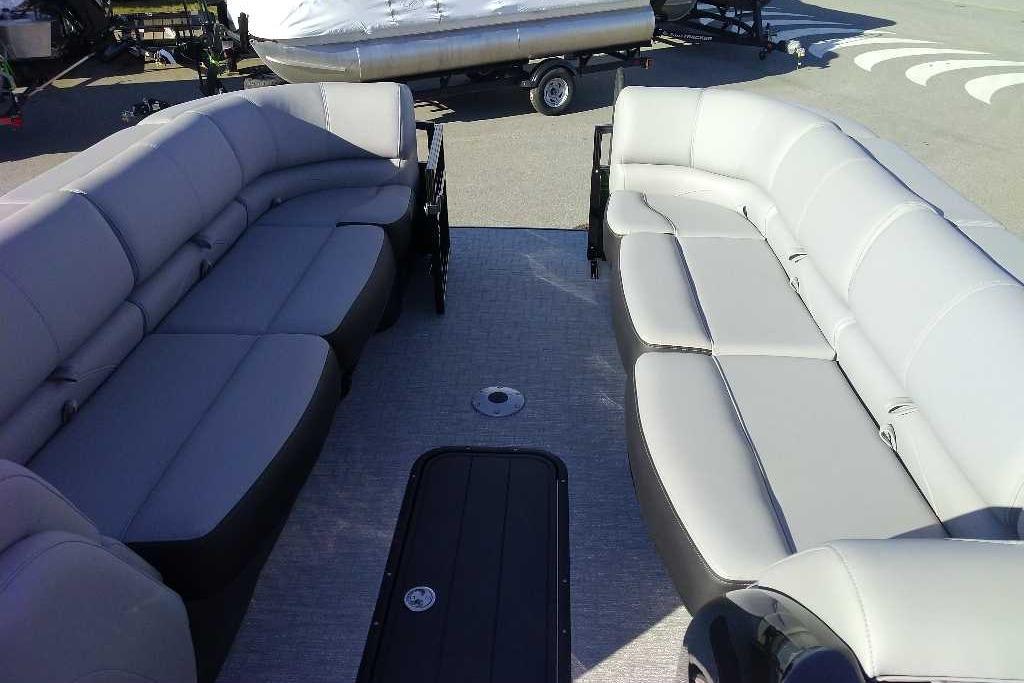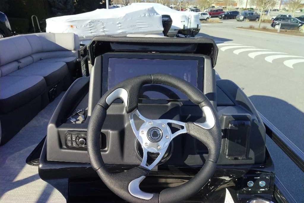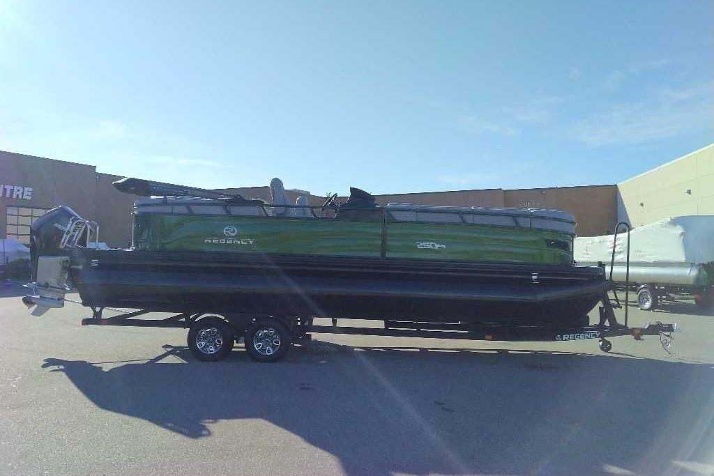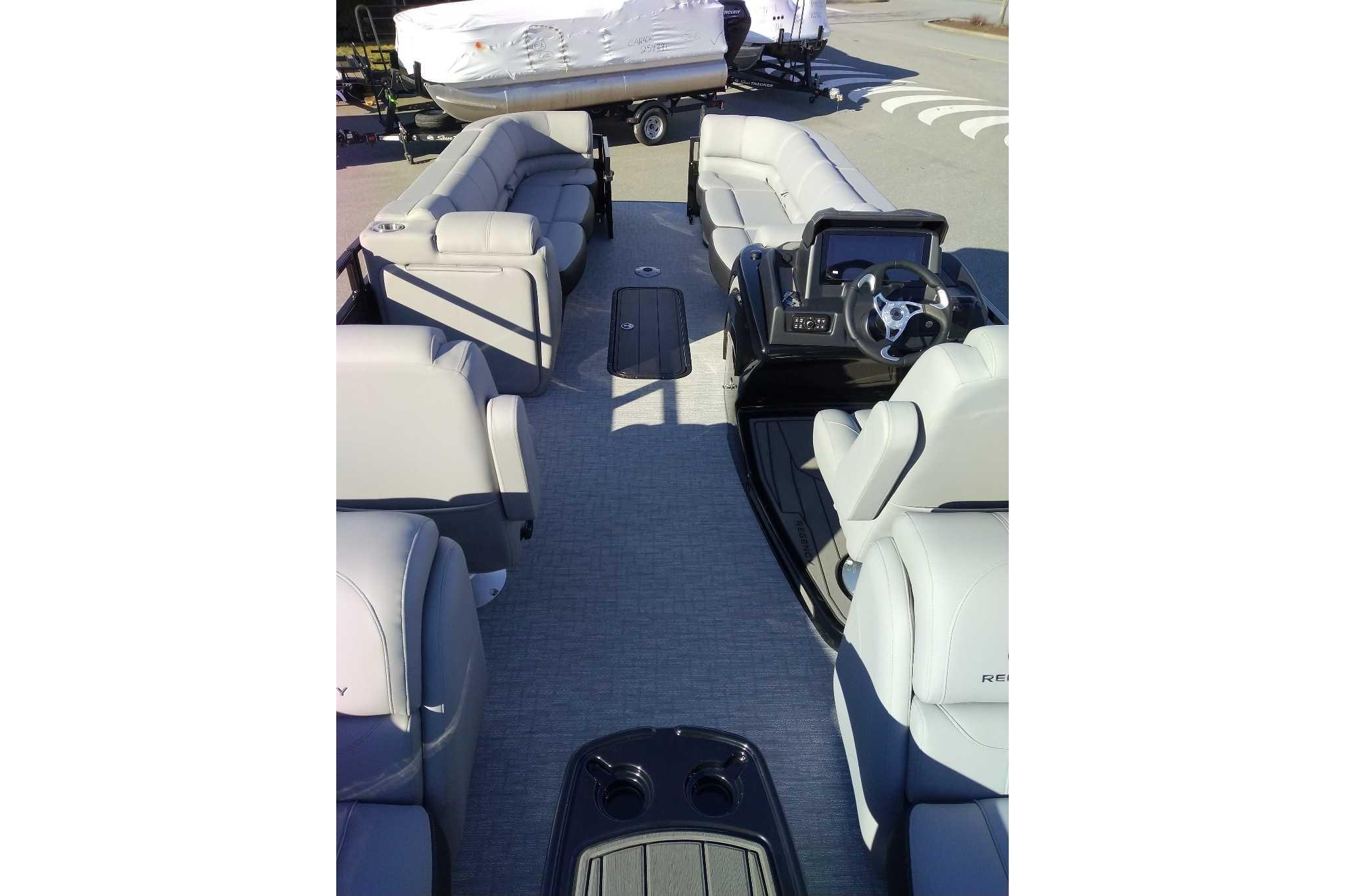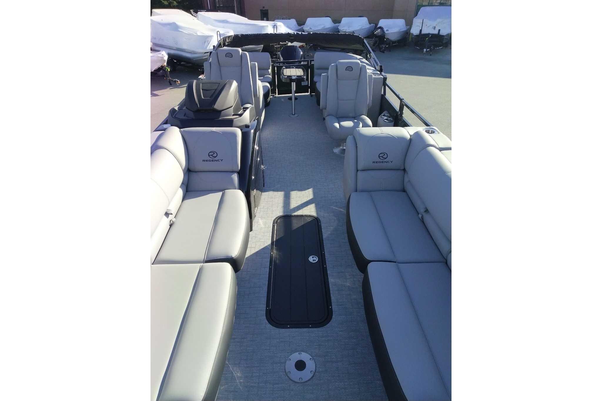 Discover the pinnacle of on-water luxury with the 2026 REGENCY® 250 DL. Designed for those who demand more, this pontoon fuses bold styling, advanced technology, and uncompromising performance. Its signature TRACK FORMED® fencing and DIAMOND COAT™ 3.0 finish set the stage, while a full RGB lighting system—illuminating cup holders, speakers, and exterior accents—creates an atmosphere that moves with your music. Step inside and relax into plush lounges with pillowtop backs, lumbar support, and lockable storage, all complemented by premium woven vinyl flooring and STOW MORE™ quiet-close hinges. Command your experience from the raised helm featuring the REGENCY® omni2™ 12" touchscreen, Bluetooth® connectivity, Wet Sounds® audio, and Scanstrut® wireless charging. Every seat offers USBcports for convenience, while the powered Bimini top and integrated bow/aft cameras deliver confidence and ease. Performance is engineered to thrill with three 26" multichambered logs, power-assisted hydraulic steering, and a removable ski tow pylon with dedicated storage. An extended aft swim platform, new telescoping wide step stainless steel ladder, and LED navigation lights complete a design built for both adventure and leisure. Luxury isn’t just a feature—it’s a feeling. Experience it with the REGENCY® 250 DL.