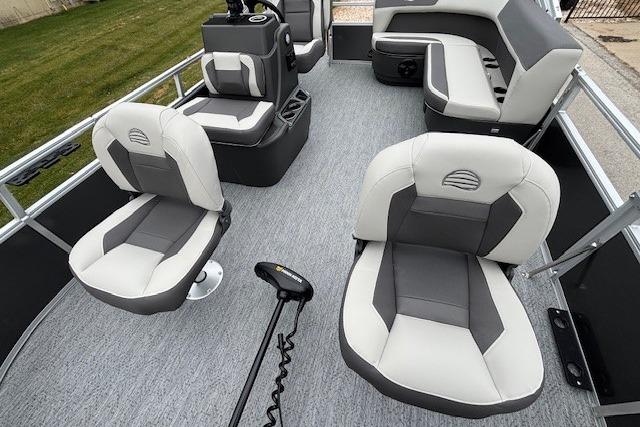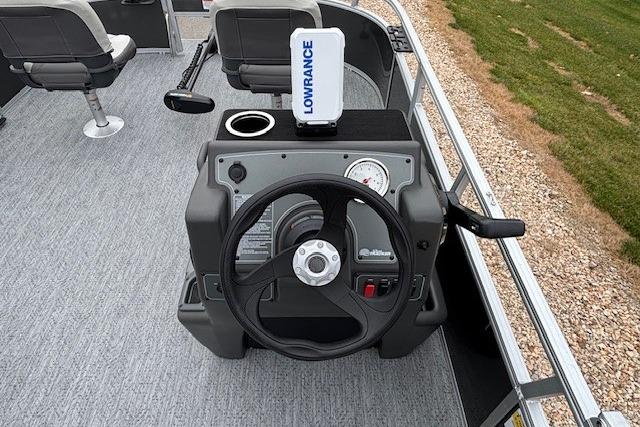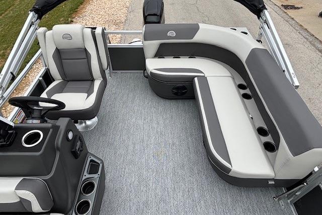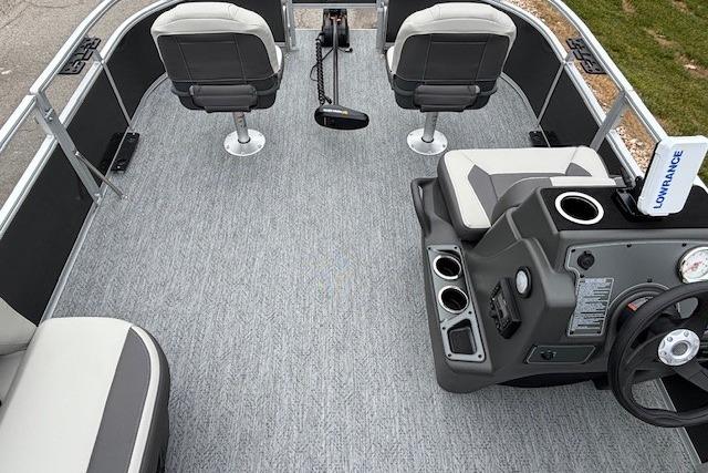 This seven-passenger fishing pontoon hits the water with new console and lounge designs. Get three extra cubic feet of storage thanks to clever backrest cut-outs. The redesign also adds a seat in front of the driver console, phone compartments, and four more cupholders. Cast from the shade of a standard 7' bimini top in one of the two folding fishing seats. Find your spot on the lake from the decked-out driver console, which comes with its own rod holder.