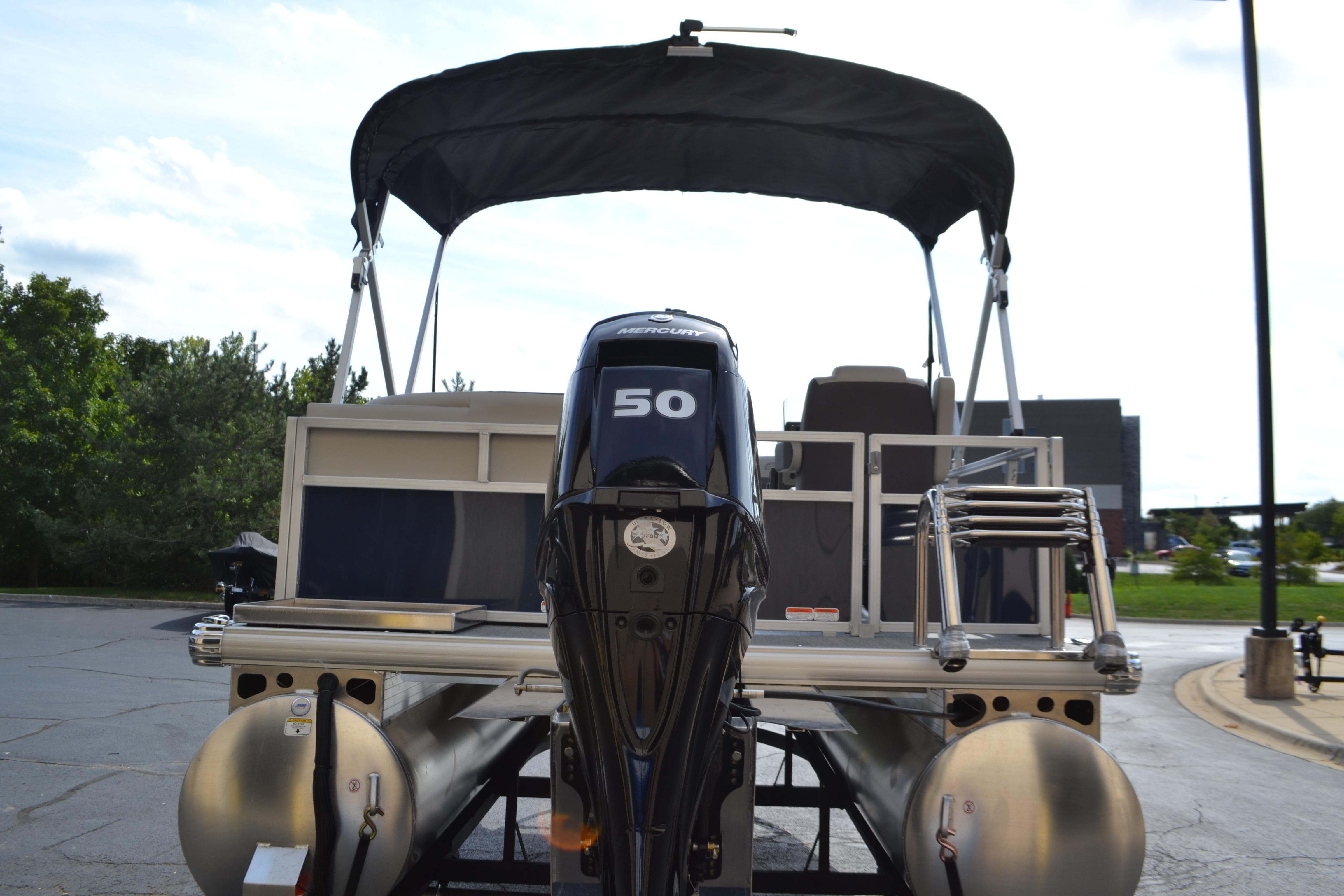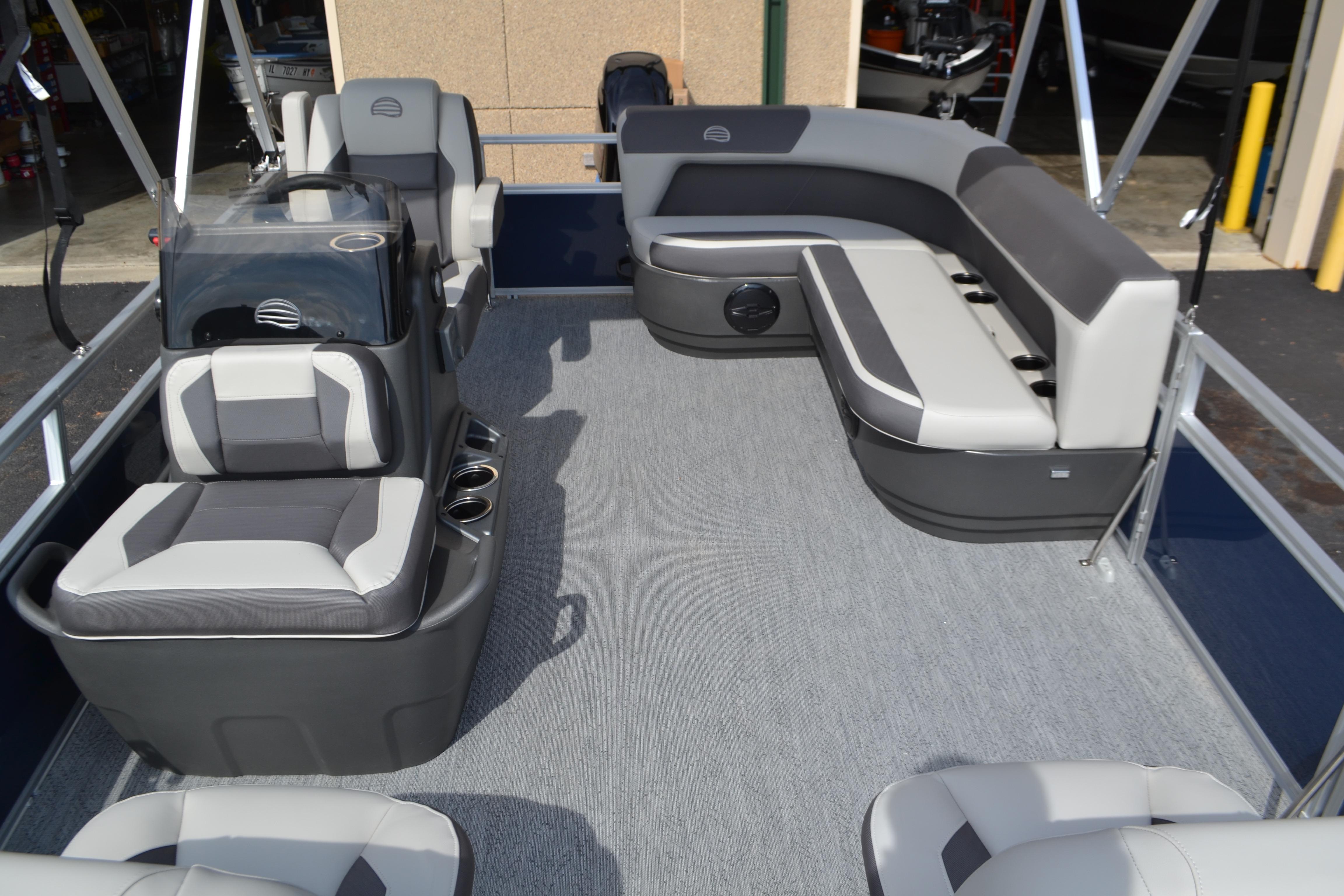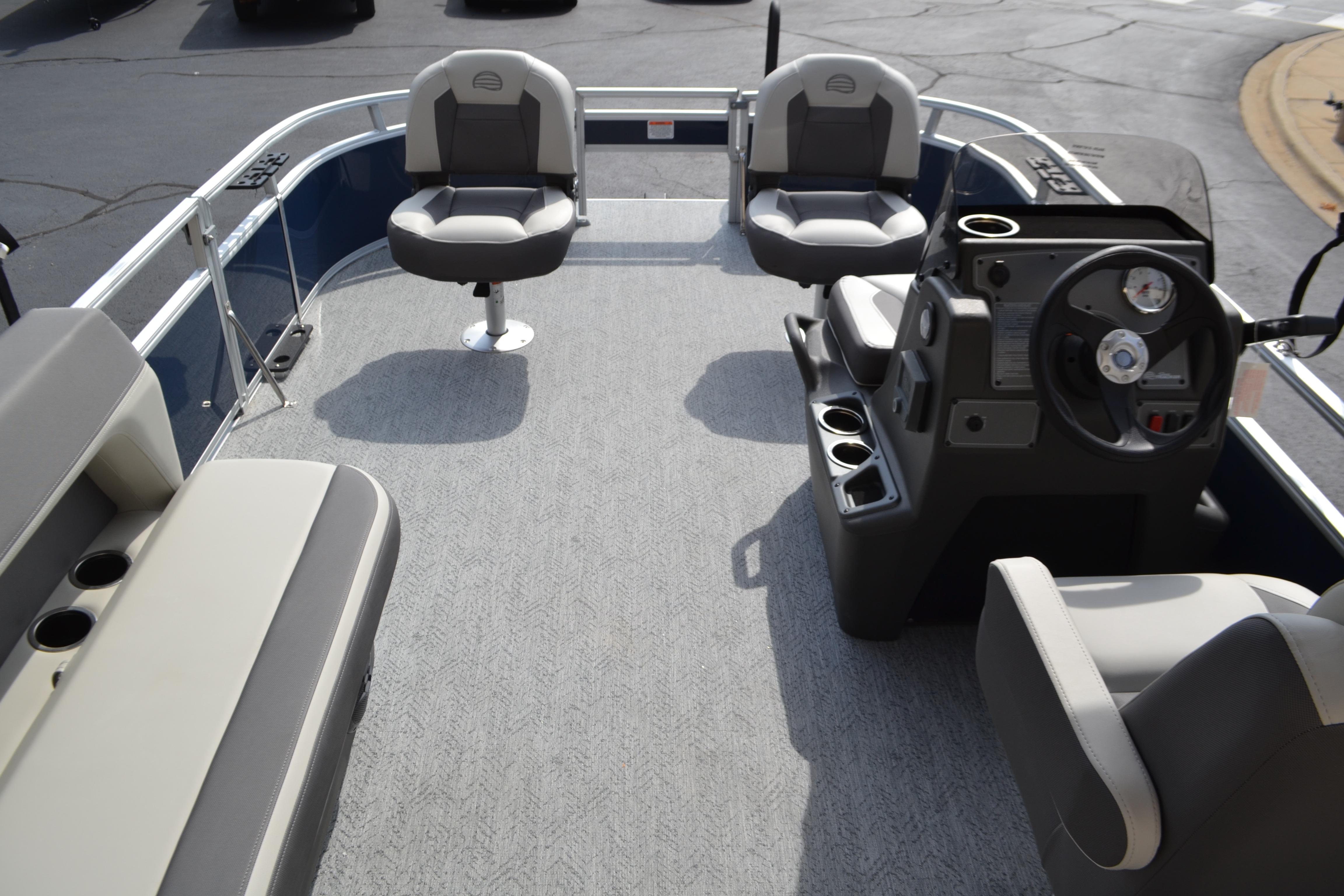 This seven-passenger fishing pontoon hits the water with new console and lounge designs. Get three extra cubic feet of storage thanks to clever backrest cut-outs. The redesign also adds a seat in front of the driver console, phone compartments, and four more cupholders. Cast from the shade of a standard 7' bimini top in one of the two folding fishing seats. Find your spot on the lake from the decked-out driver console, which comes with its own rod holder.