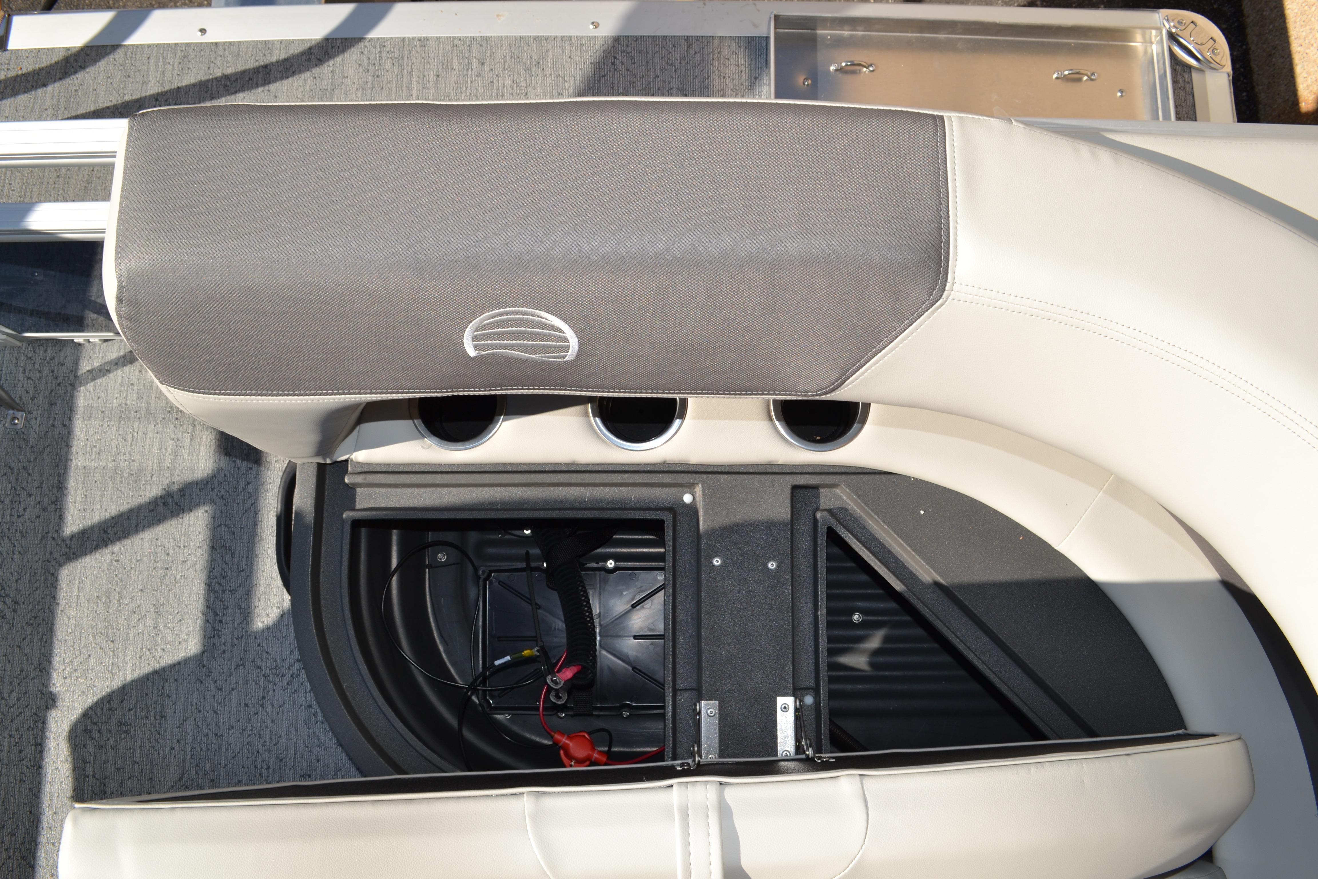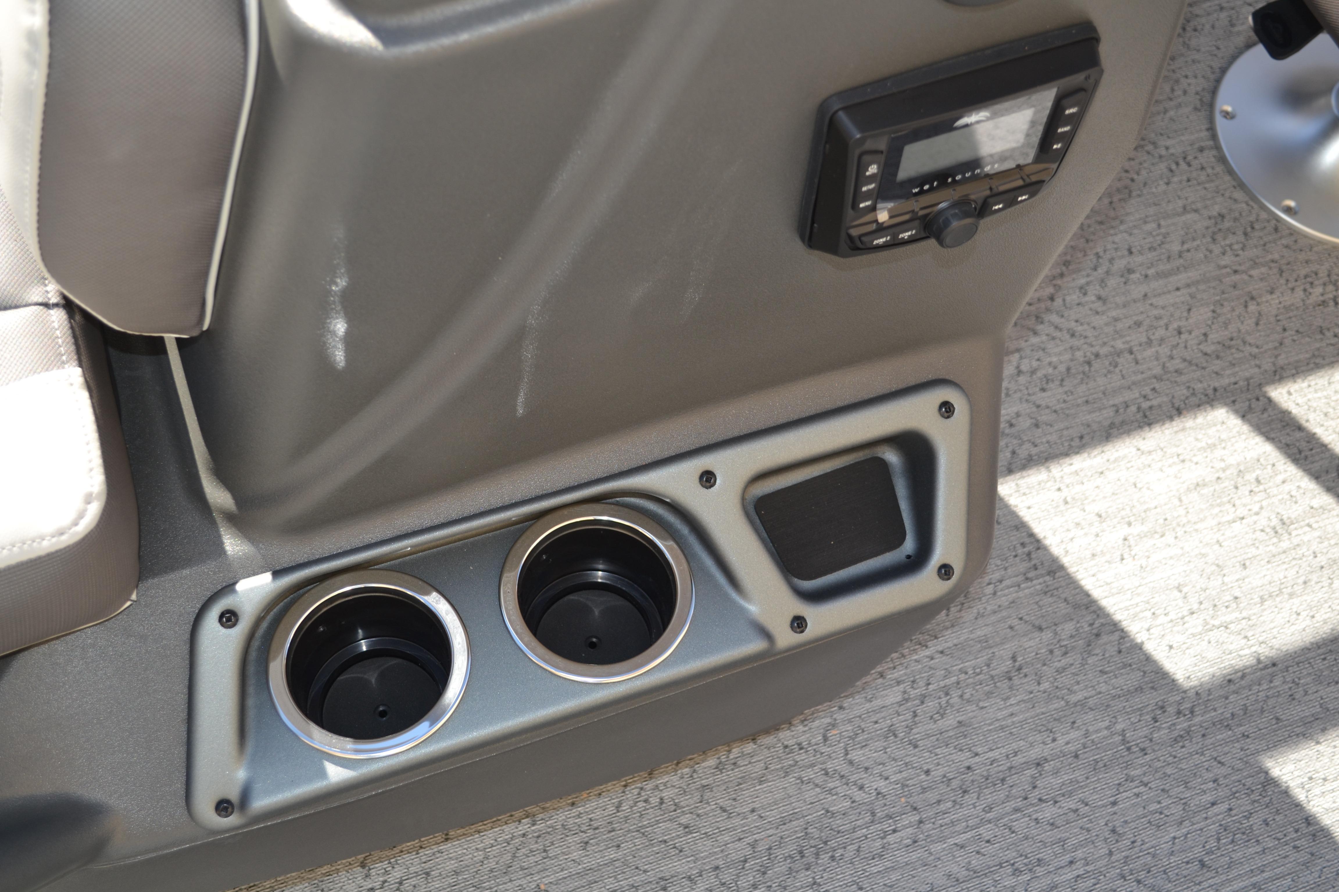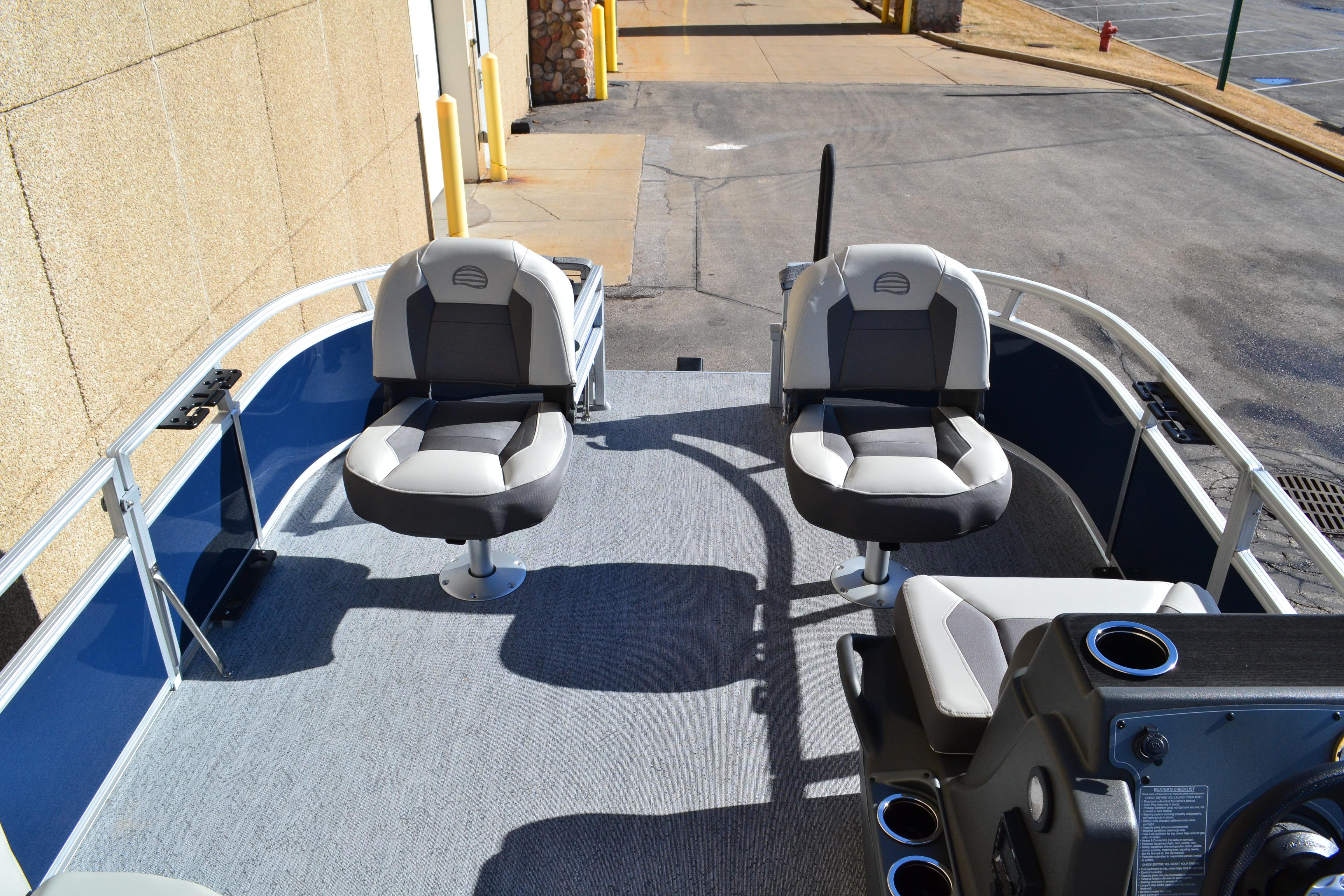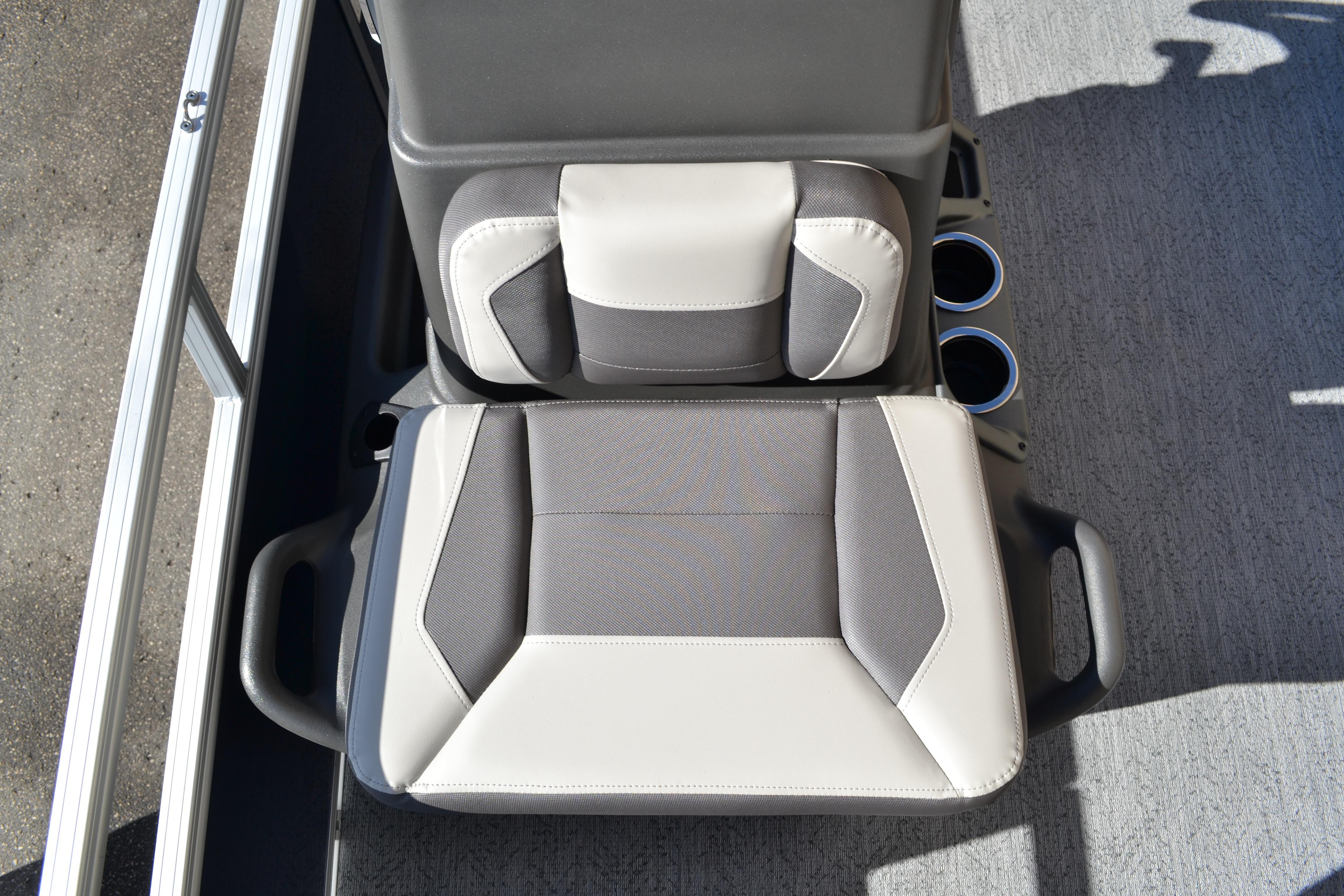 This seven-passenger fishing pontoon hits the water with new console and lounge designs. Get three extra cubic feet of storage thanks to clever backrest cut-outs. The redesign also adds a seat in front of the driver console, phone compartments, and four more cupholders. Cast from the shade of a standard 7' bimini top in one of the two folding fishing seats. Find your spot on the lake from the decked-out driver console, which comes with its own rod holder.