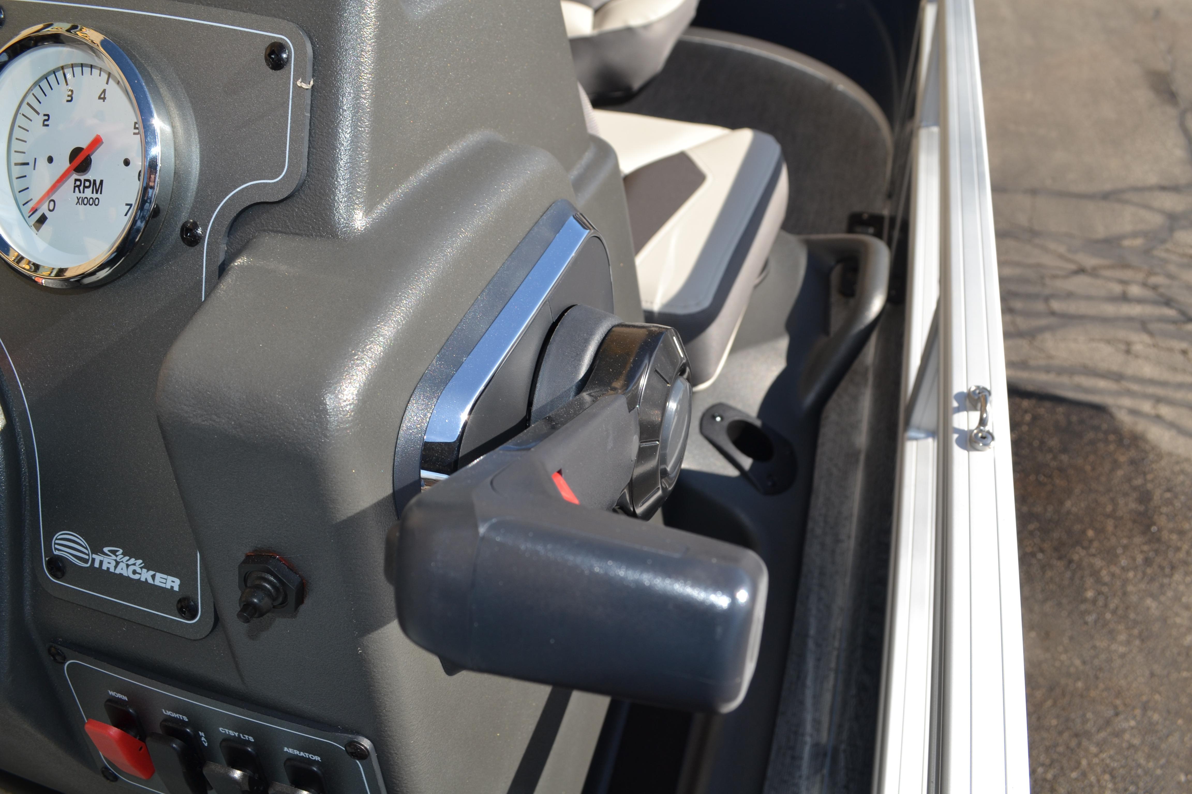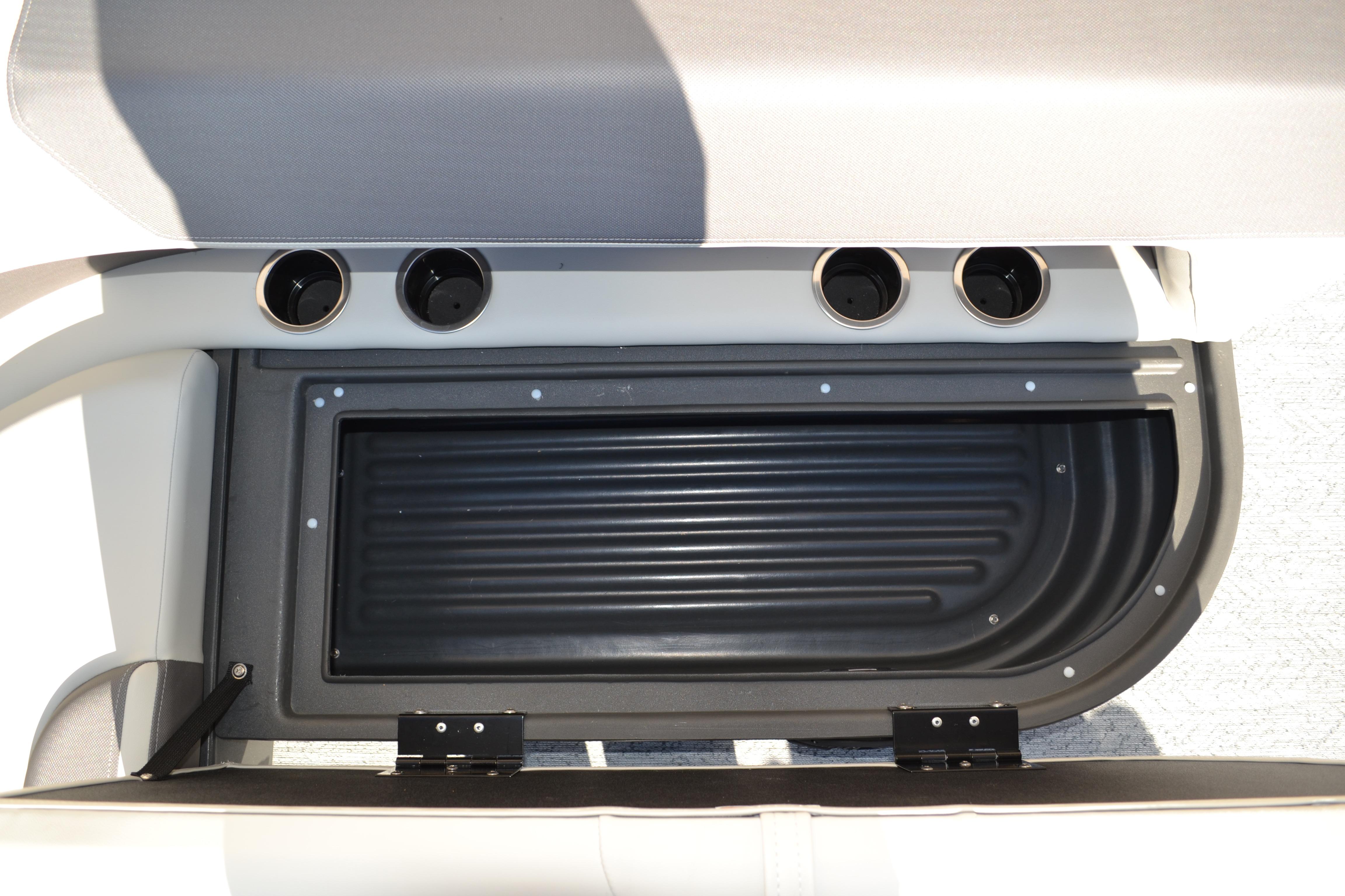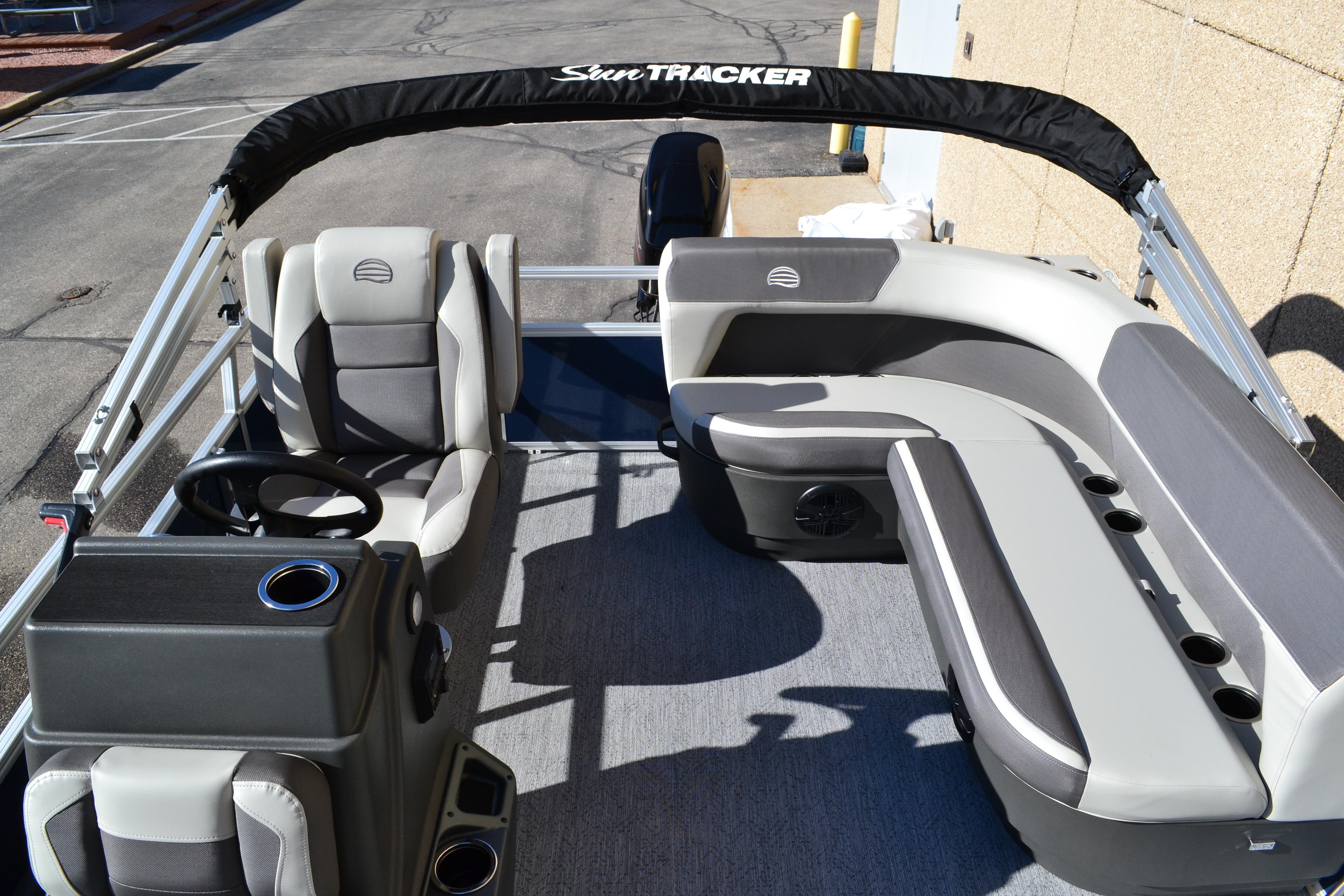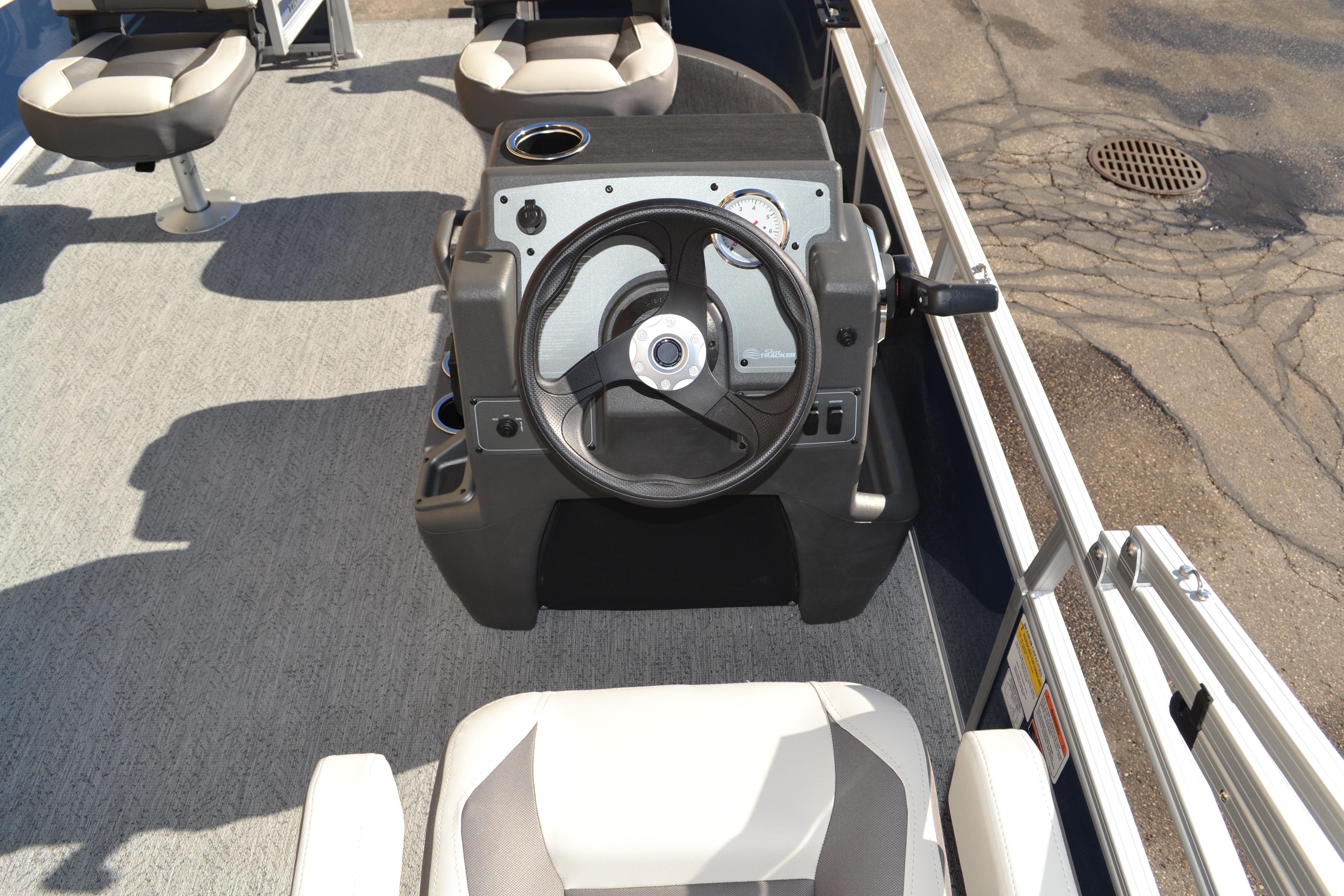 This seven-passenger fishing pontoon hits the water with new console and lounge designs. Get three extra cubic feet of storage thanks to clever backrest cut-outs. The redesign also adds a seat in front of the driver console, phone compartments, and four more cupholders. Cast from the shade of a standard 7' bimini top in one of the two folding fishing seats. Find your spot on the lake from the decked-out driver console, which comes with its own rod holder.
