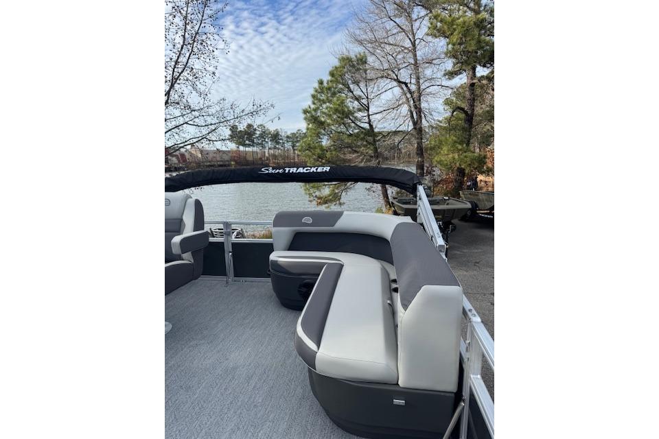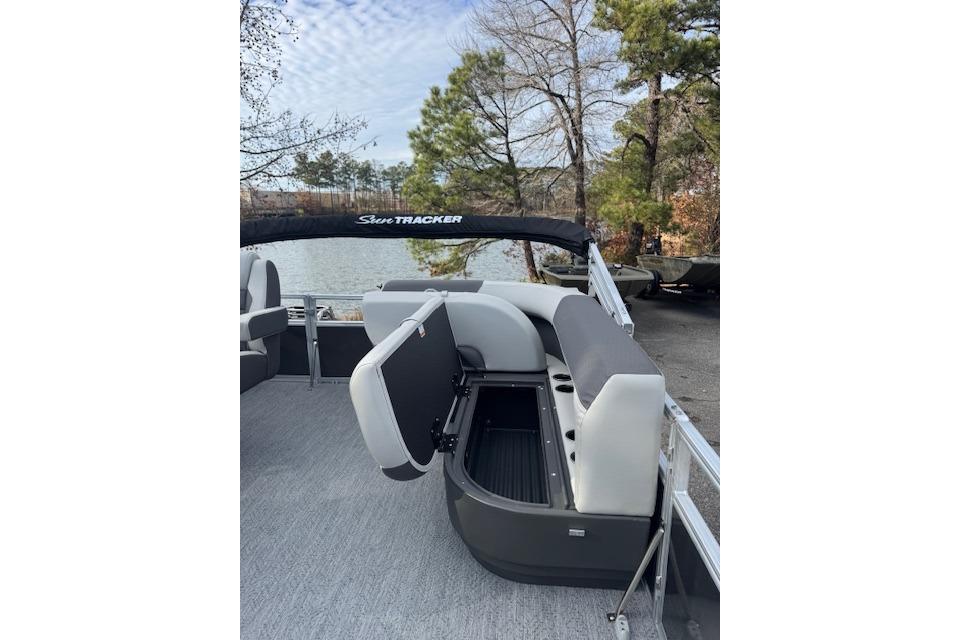 This seven-passenger fishing pontoon hits the water with new console and lounge designs. Get three extra cubic feet of storage thanks to clever backrest cut-outs. The redesign also adds a seat in front of the driver console, phone compartments, and four more cupholders. Cast from the shade of a standard 7' bimini top in one of the two folding fishing seats. Find your spot on the lake from the decked-out driver console, which comes with its own rod holder.