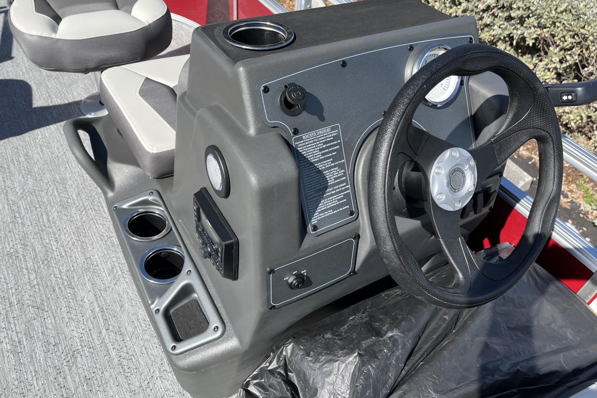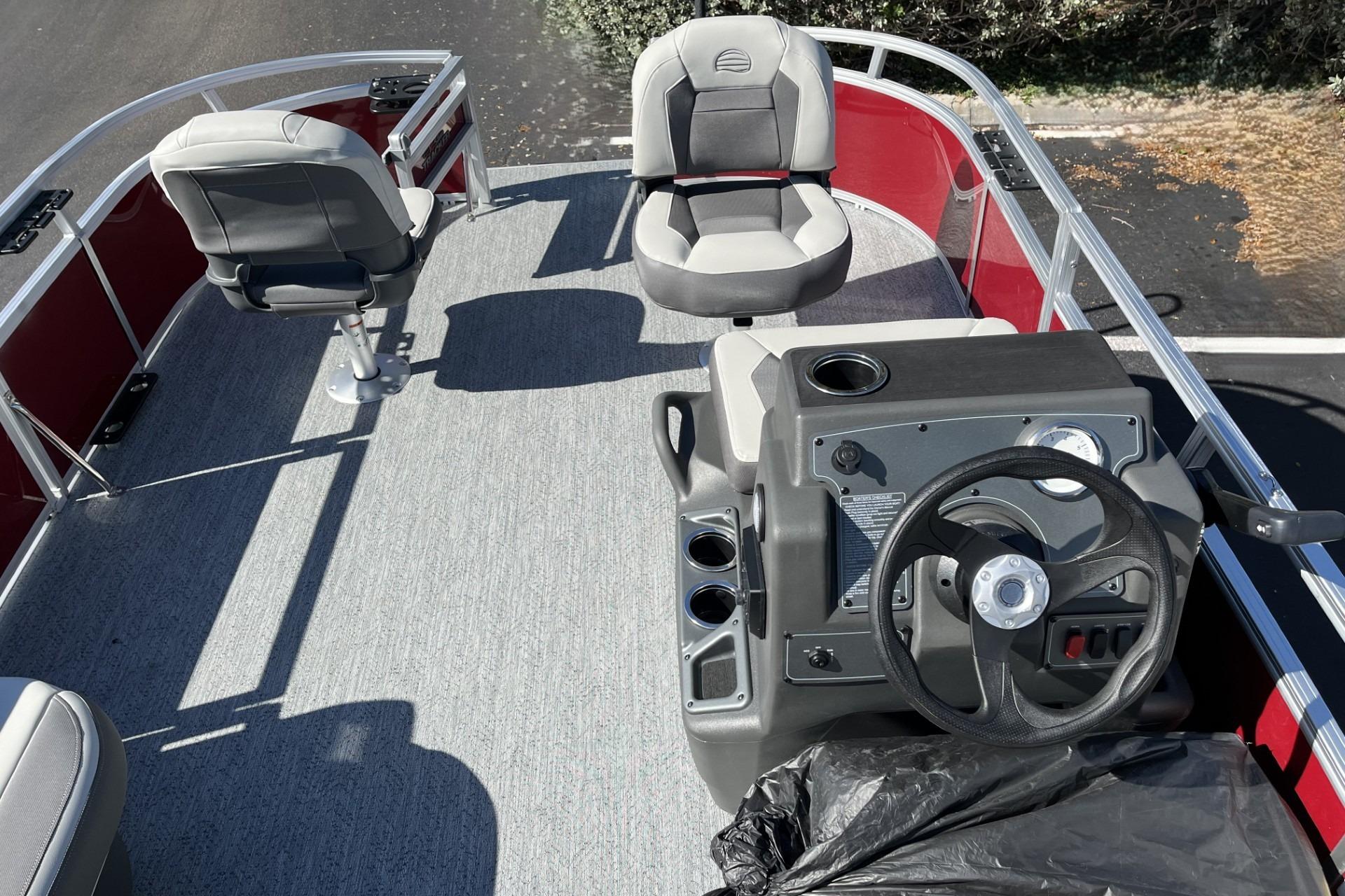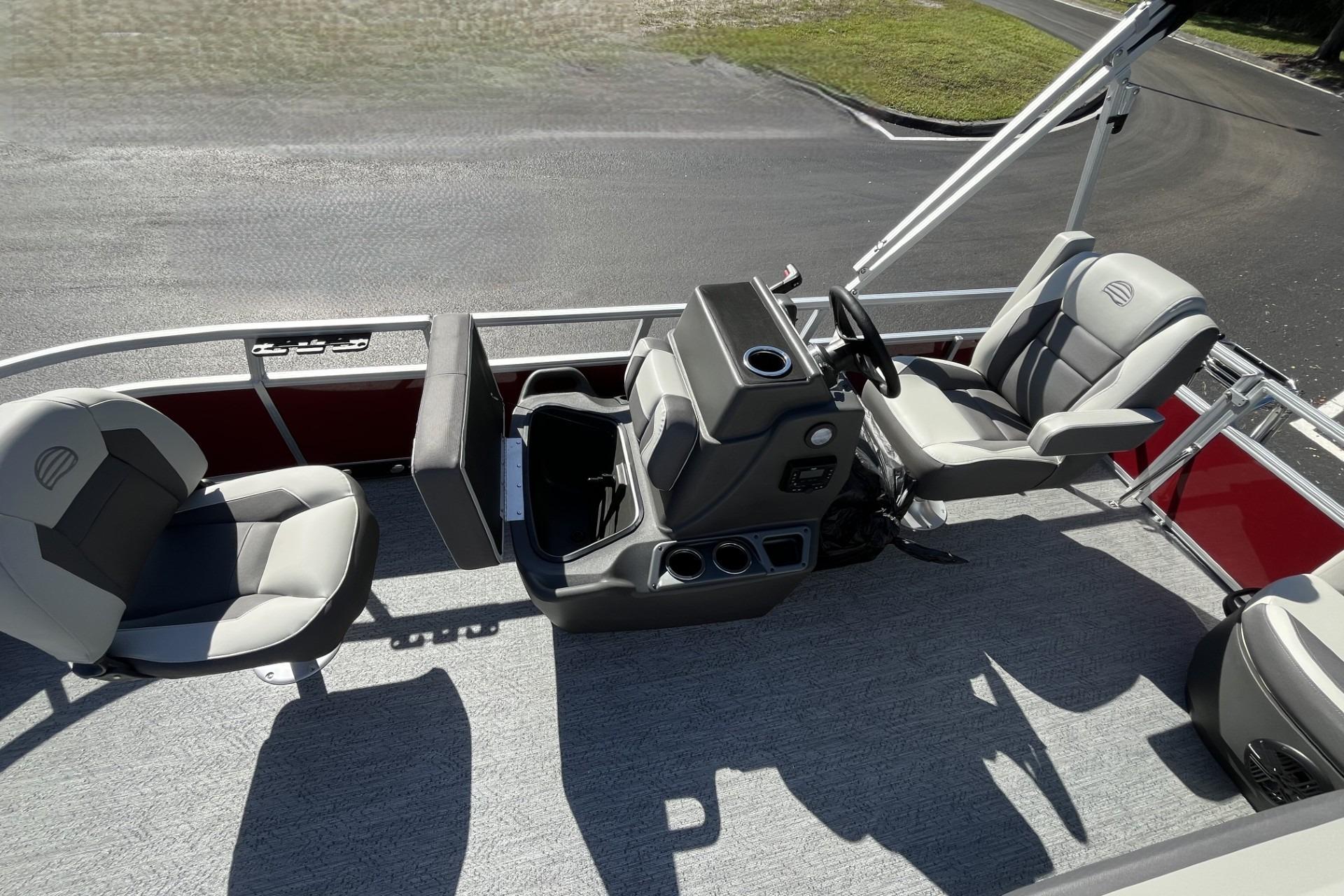 This seven-passenger fishing pontoon hits the water with new console and lounge designs. Get three extra cubic feet of storage thanks to clever backrest cut-outs. The redesign also adds a seat in front of the driver console, phone compartments, and four more cupholders. Cast from the shade of a standard 7' bimini top in one of the two folding fishing seats. Find your spot on the lake from the decked-out driver console, which comes with its own rod holder.