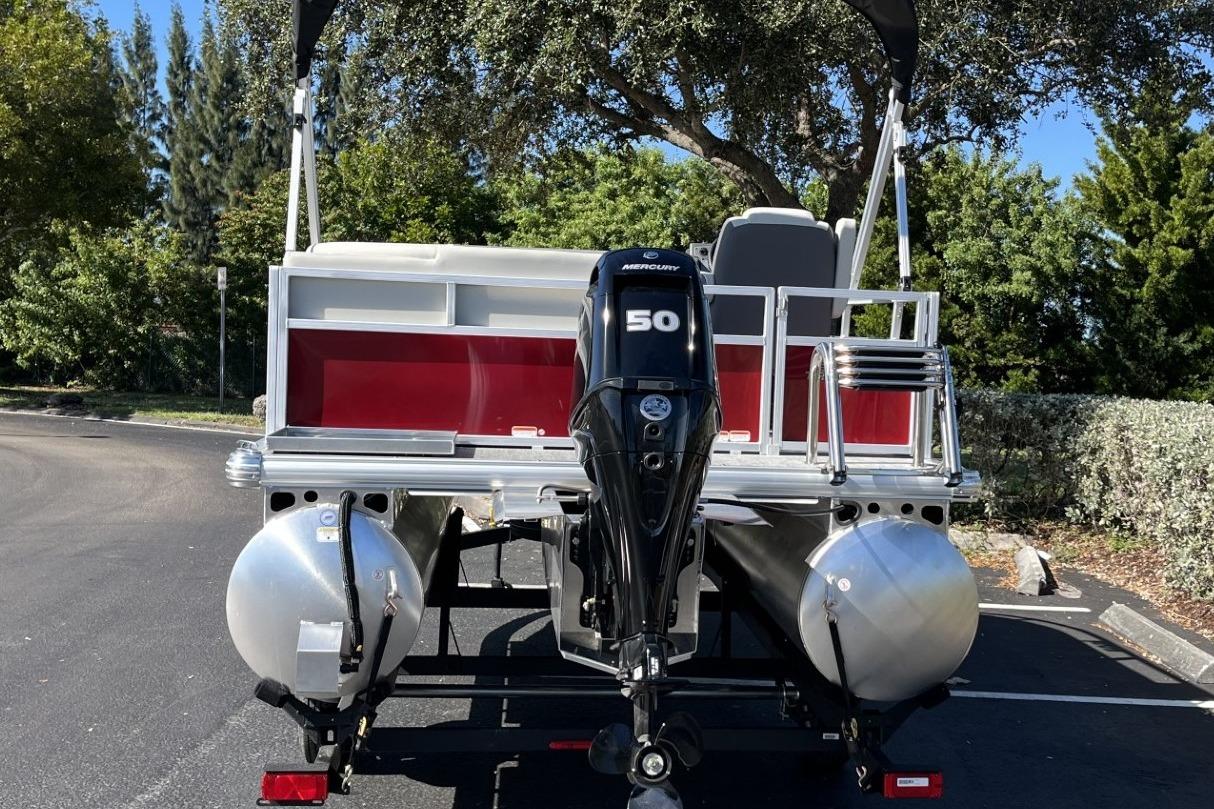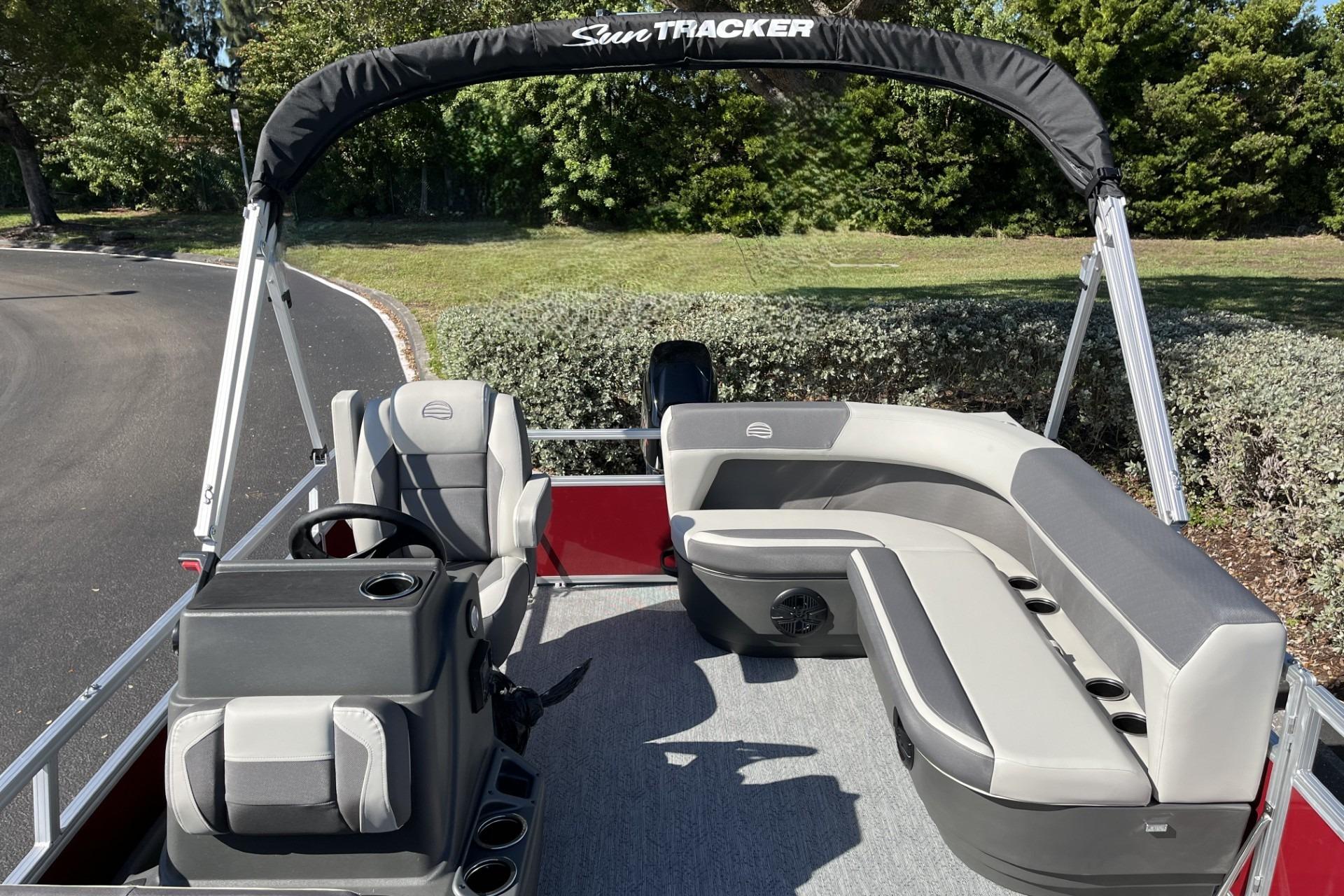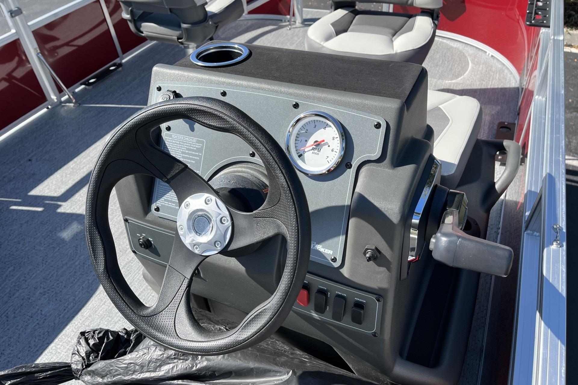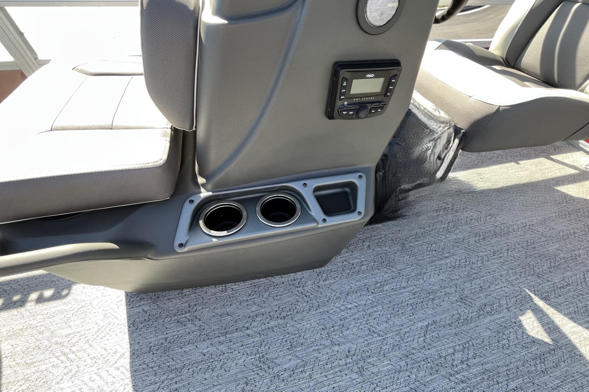 This seven-passenger fishing pontoon hits the water with new console and lounge designs. Get three extra cubic feet of storage thanks to clever backrest cut-outs. The redesign also adds a seat in front of the driver console, phone compartments, and four more cupholders. Cast from the shade of a standard 7' bimini top in one of the two folding fishing seats. Find your spot on the lake from the decked-out driver console, which comes with its own rod holder.