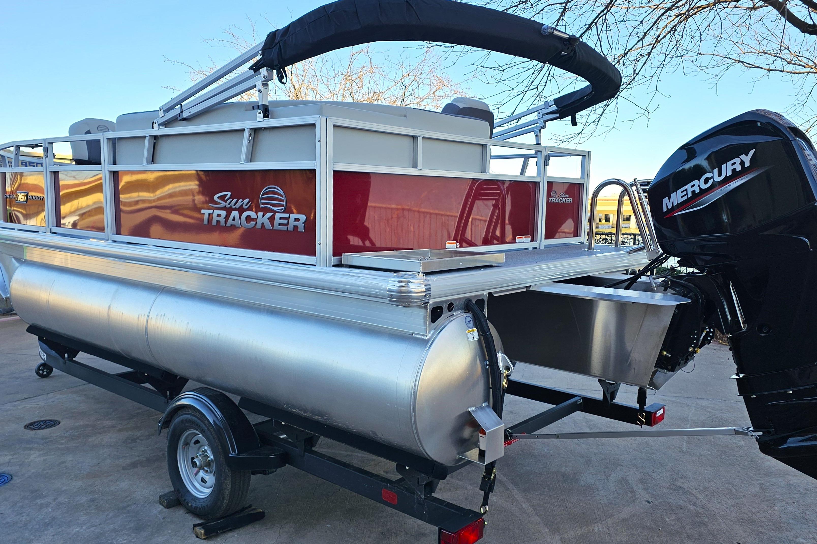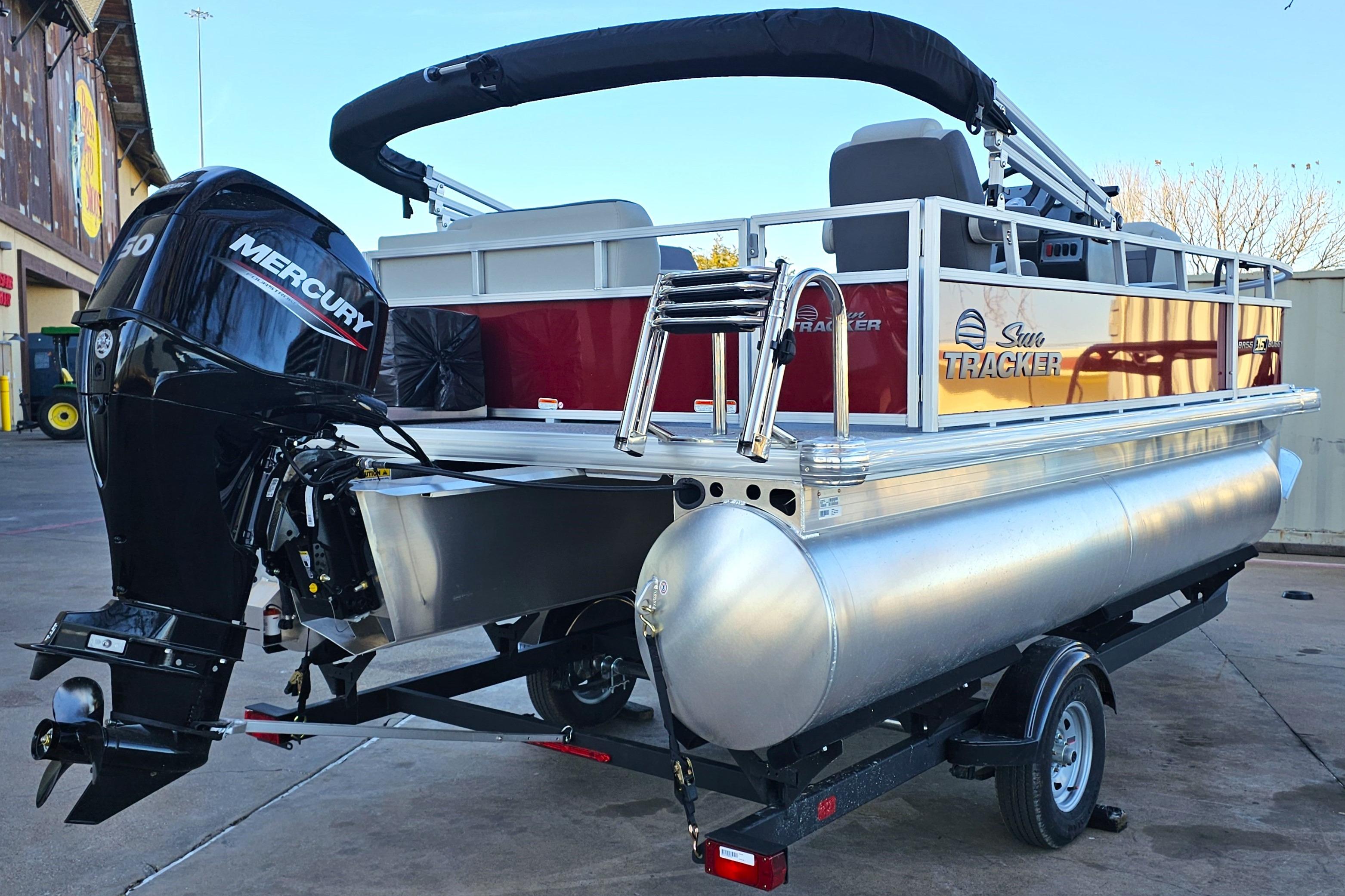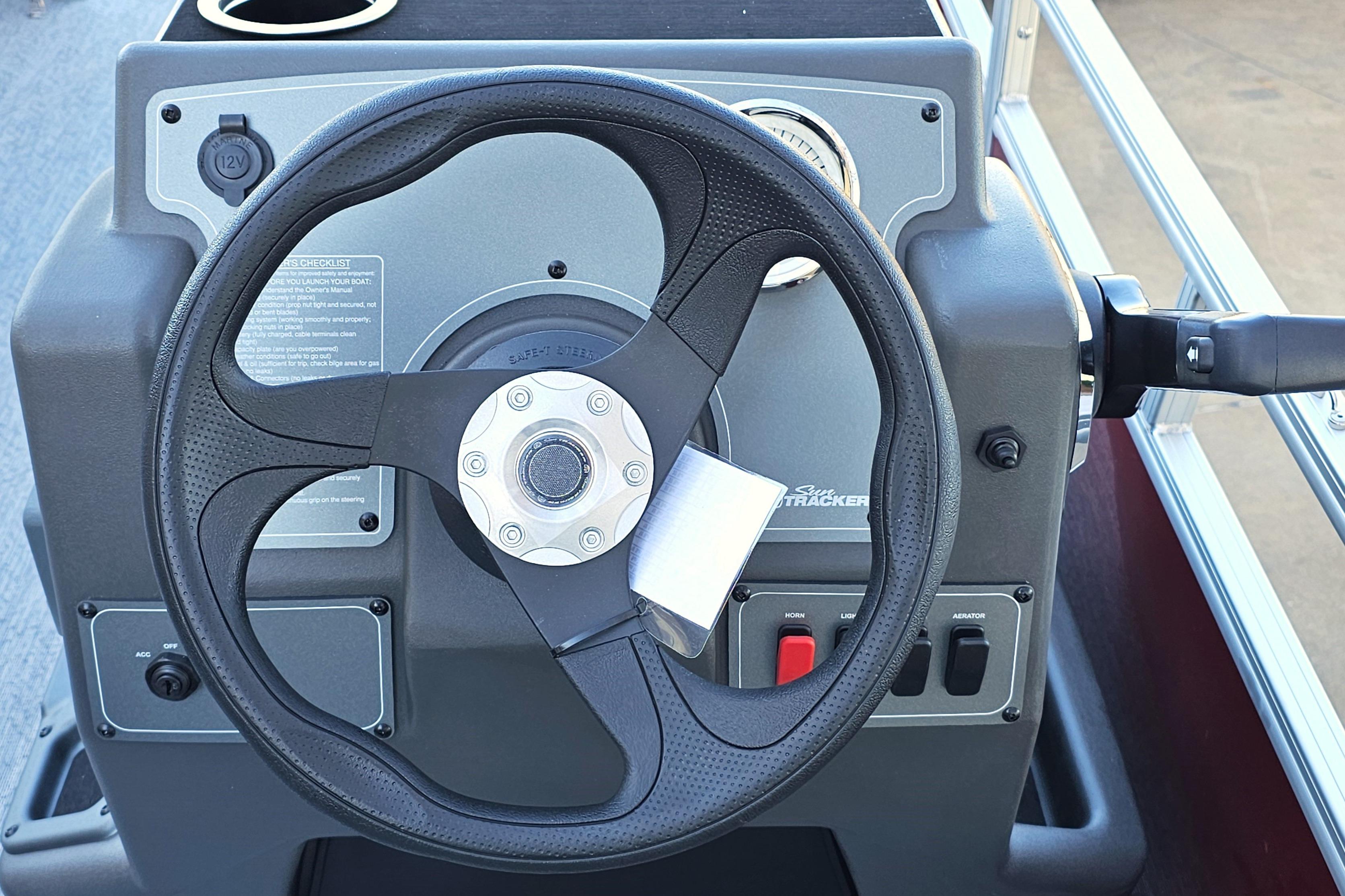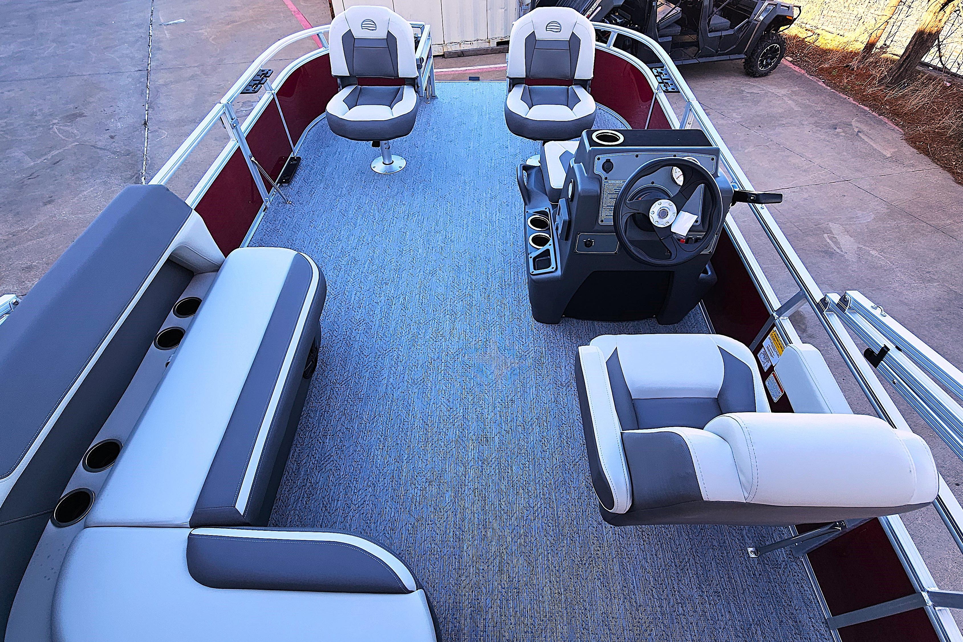 This seven-passenger fishing pontoon hits the water with new console and lounge designs. Get three extra cubic feet of storage thanks to clever backrest cut-outs. The redesign also adds a seat in front of the driver console, phone compartments, and four more cupholders. Cast from the shade of a standard 7' bimini top in one of the two folding fishing seats. Find your spot on the lake from the decked-out driver console, which comes with its own rod holder.