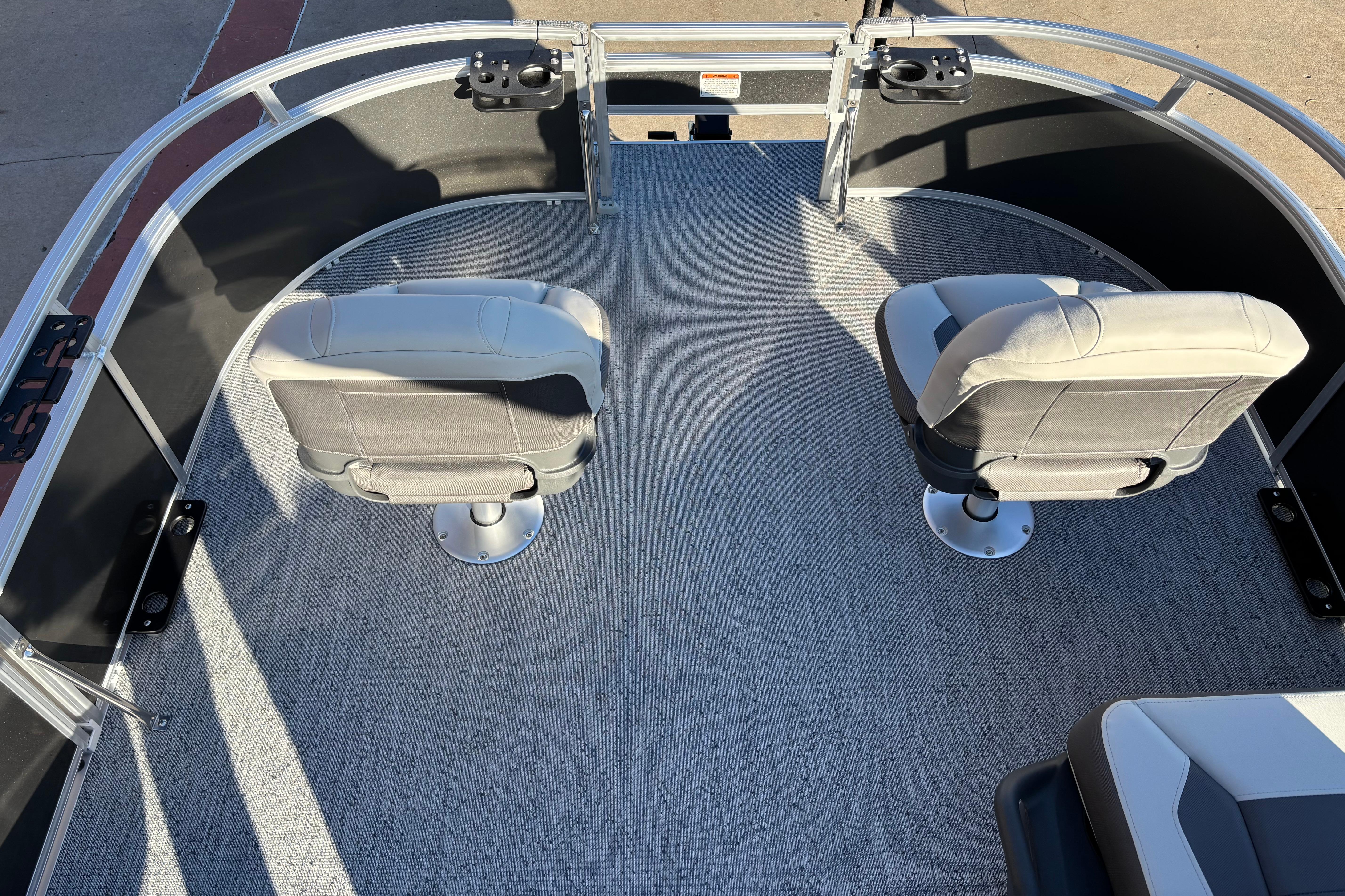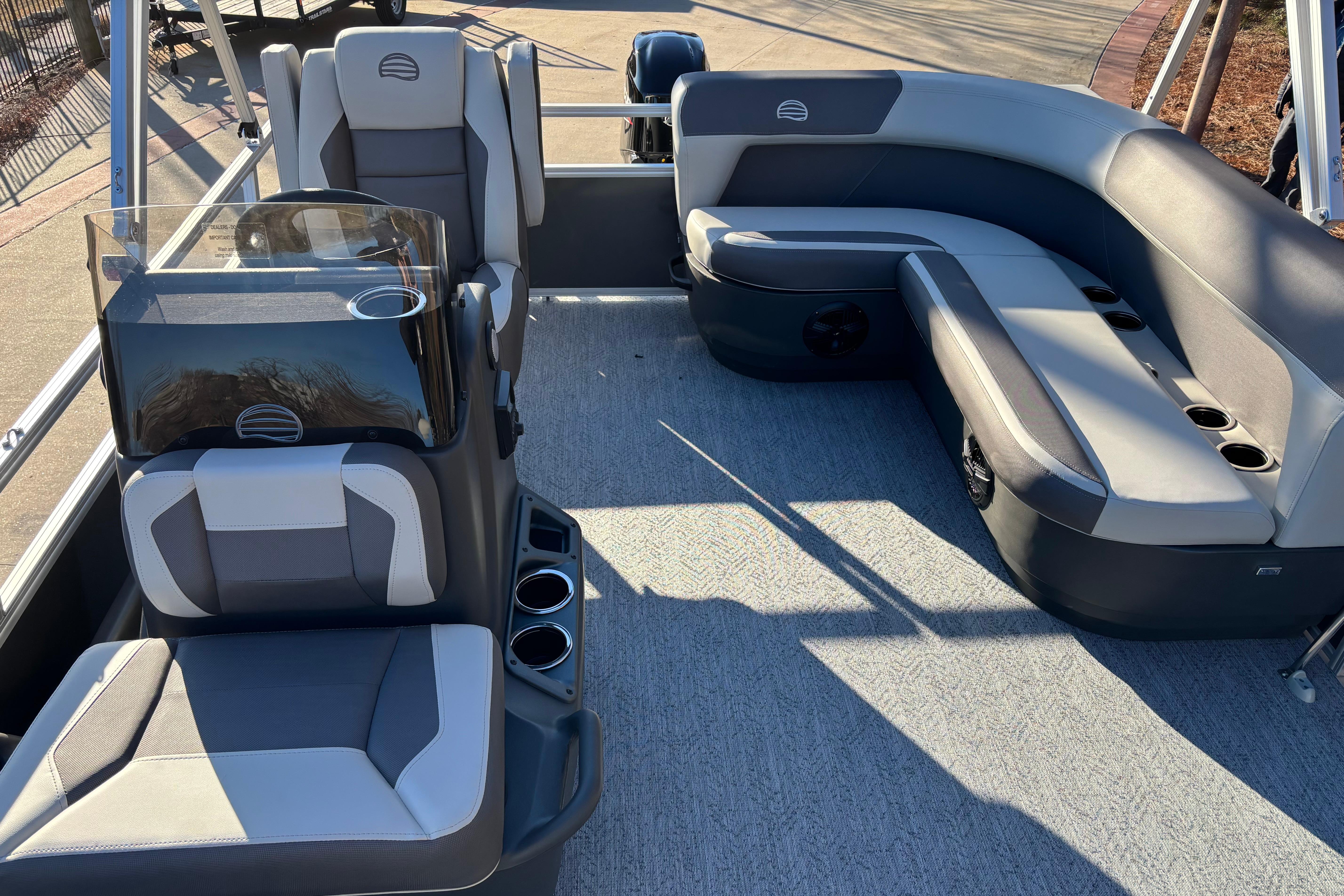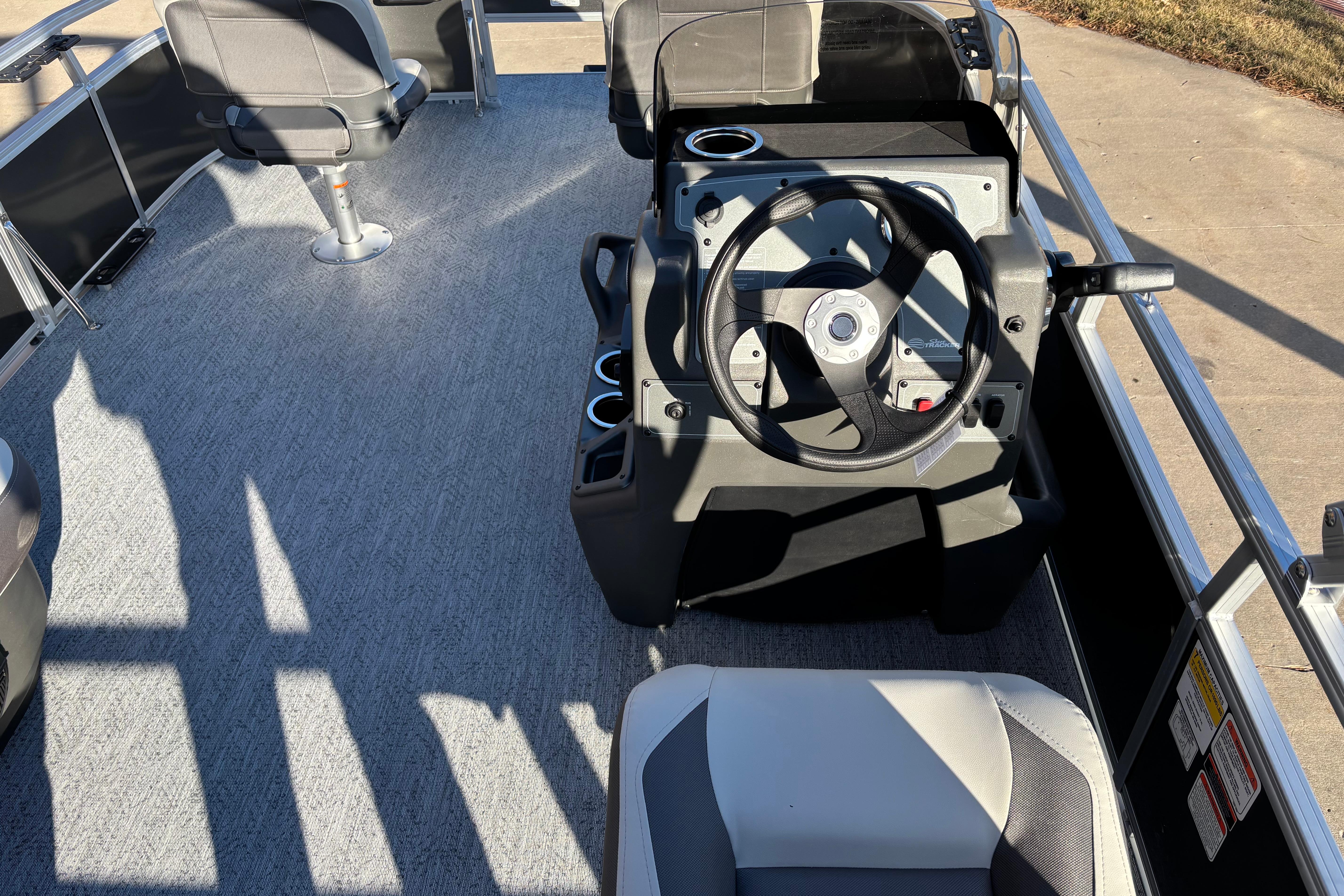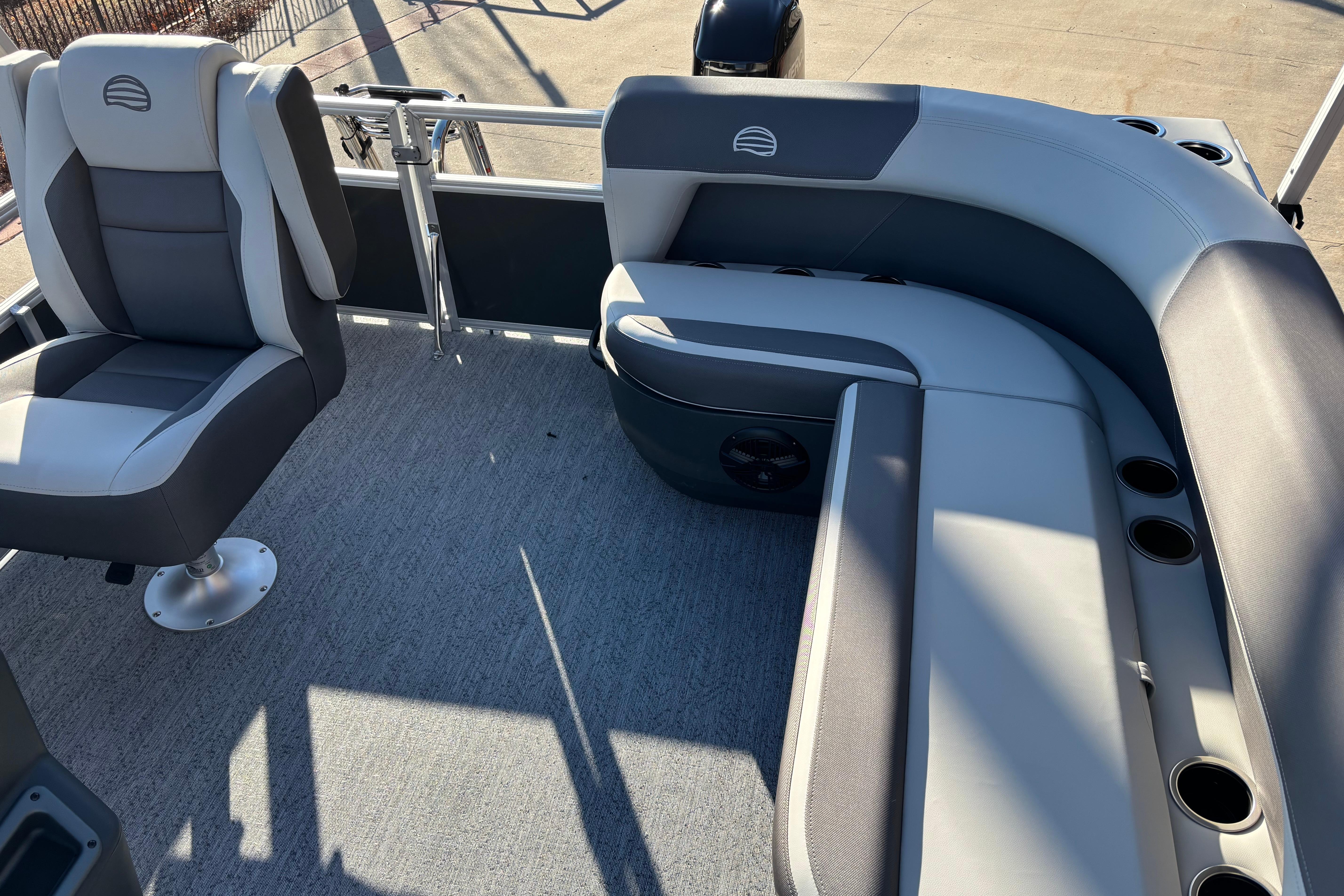 This seven-passenger fishing pontoon hits the water with new console and lounge designs. Get three extra cubic feet of storage thanks to clever backrest cut-outs. The redesign also adds a seat in front of the driver console, phone compartments, and four more cupholders. Cast from the shade of a standard 7' bimini top in one of the two folding fishing seats. Find your spot on the lake from the decked-out driver console, which comes with its own rod holder.