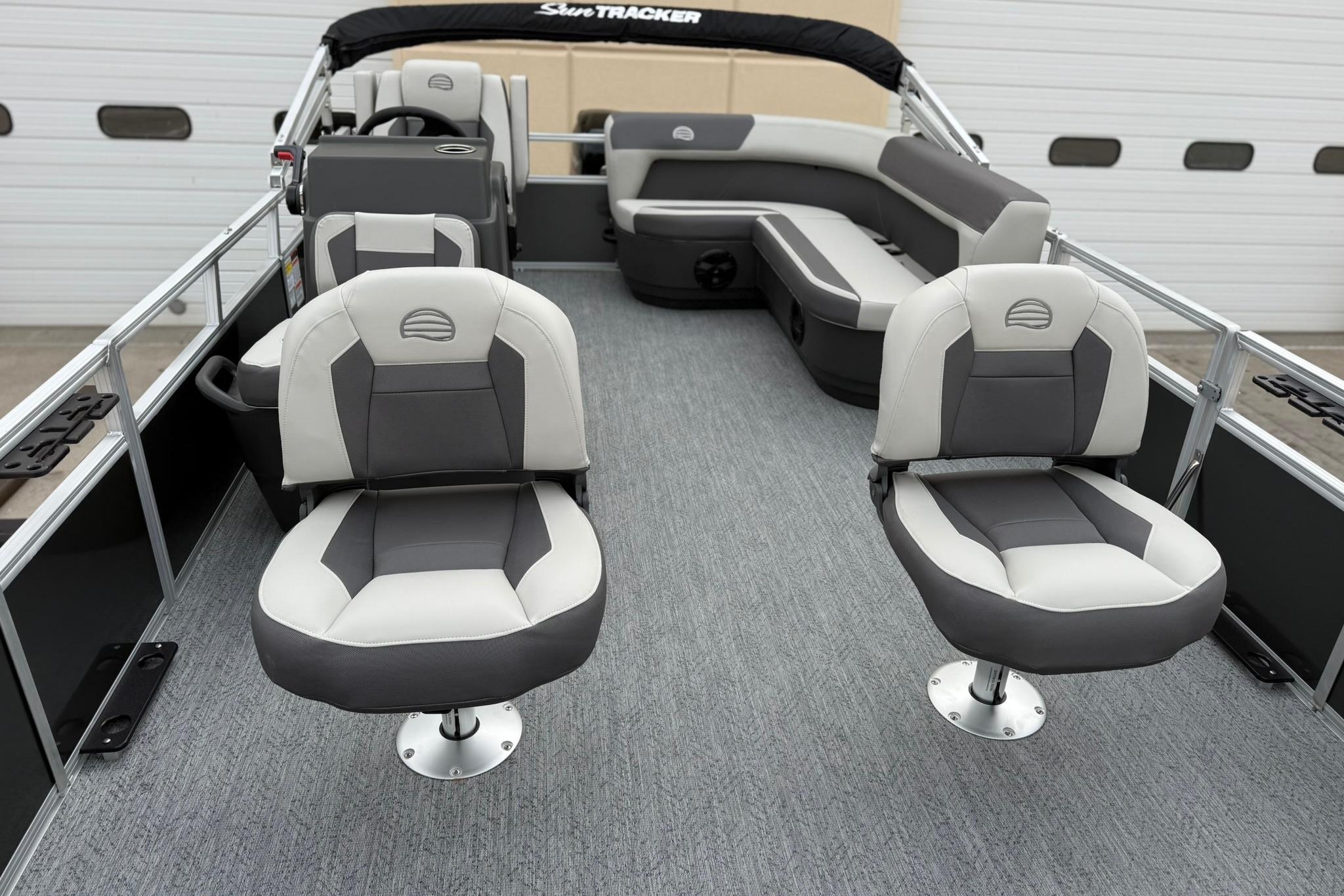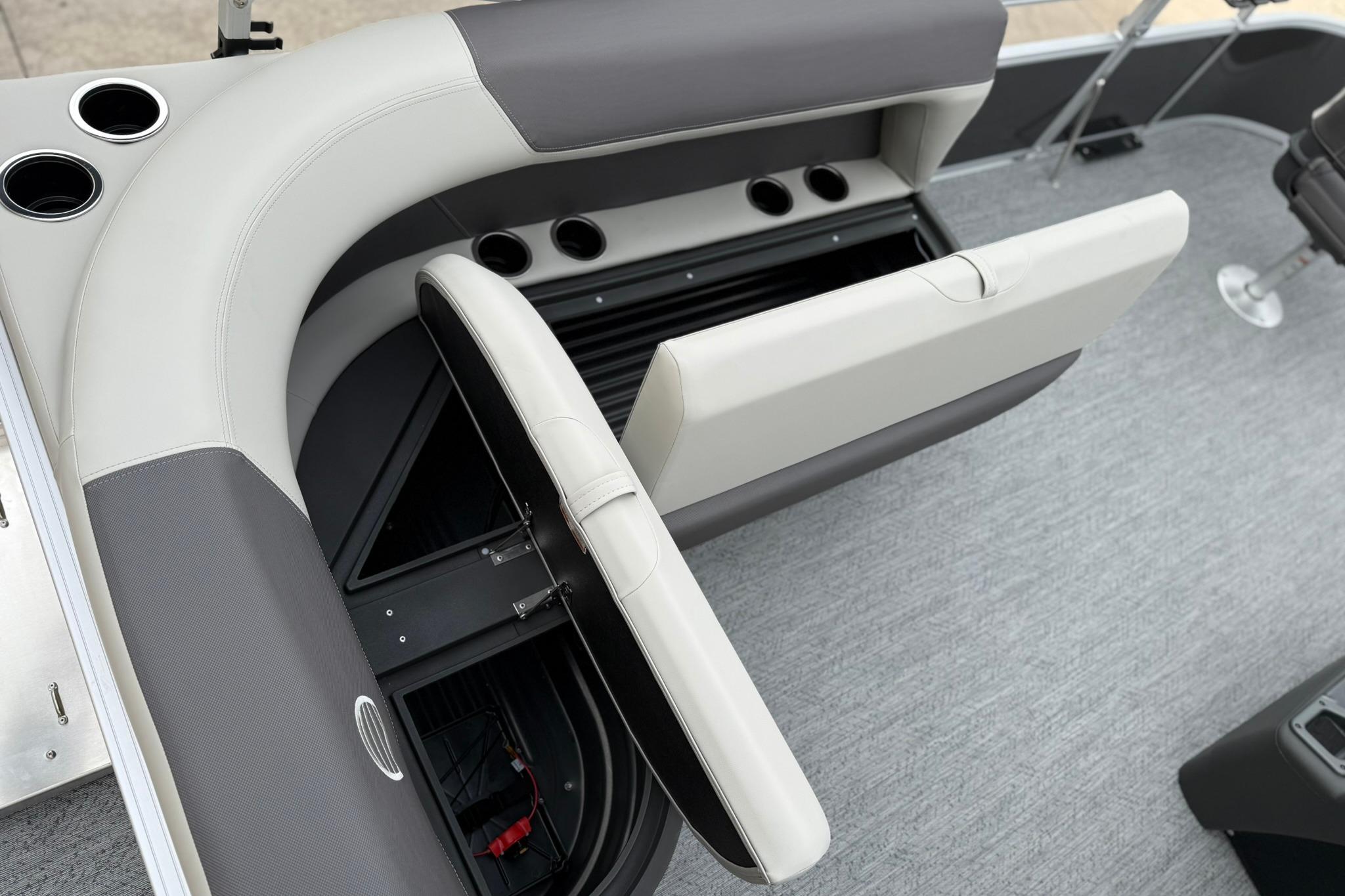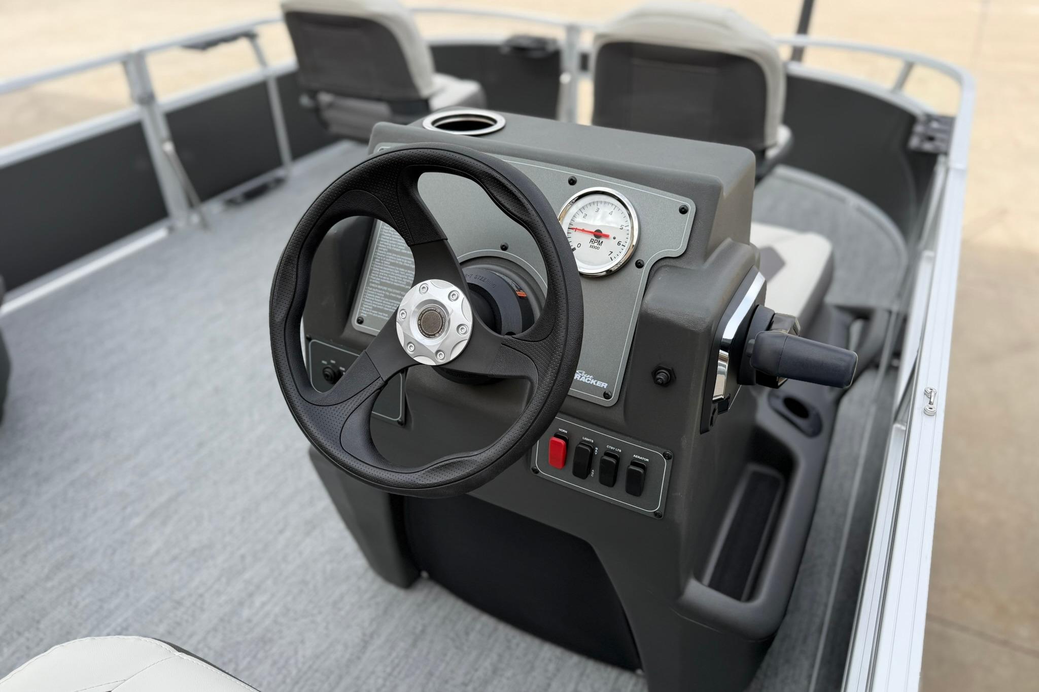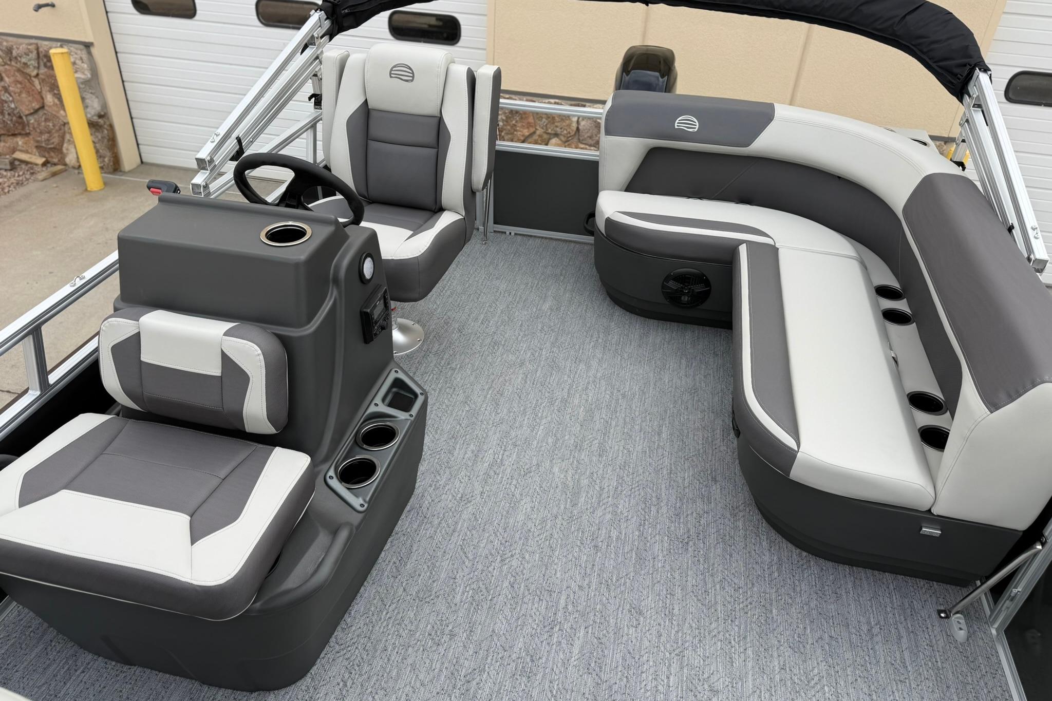 This seven-passenger fishing pontoon hits the water with new console and lounge designs. Get three extra cubic feet of storage thanks to clever backrest cut-outs. The redesign also adds a seat in front of the driver console, phone compartments, and four more cupholders. Cast from the shade of a standard 7' bimini top in one of the two folding fishing seats. Find your spot on the lake from the decked-out driver console, which comes with its own rod holder.