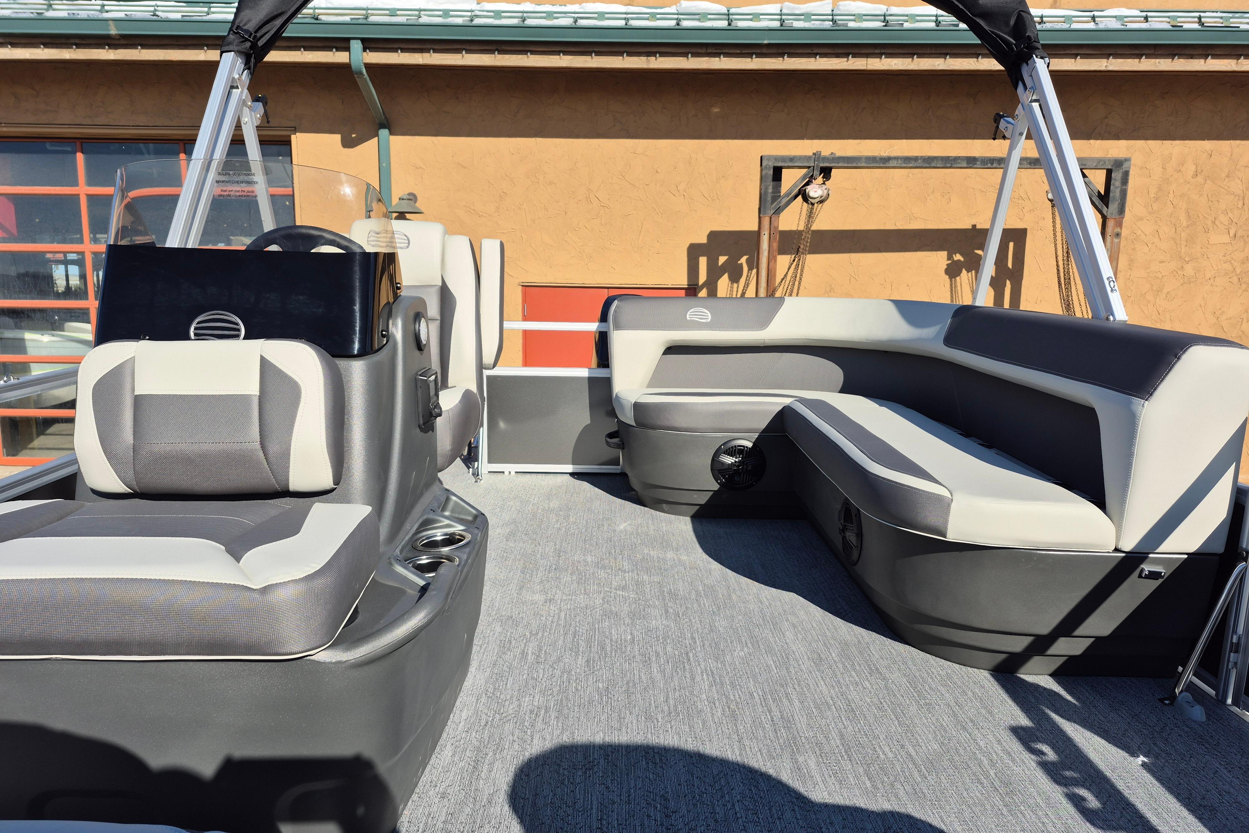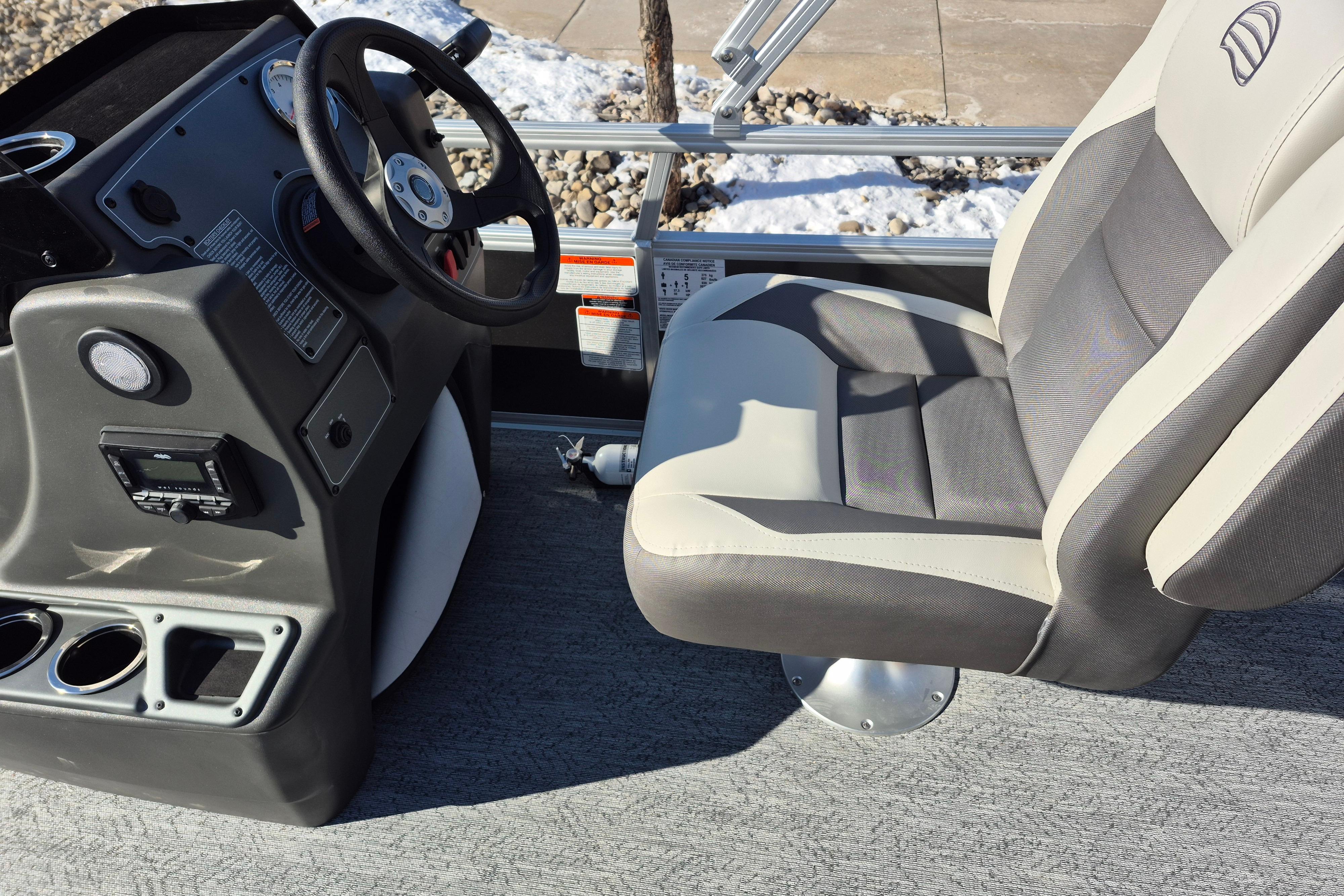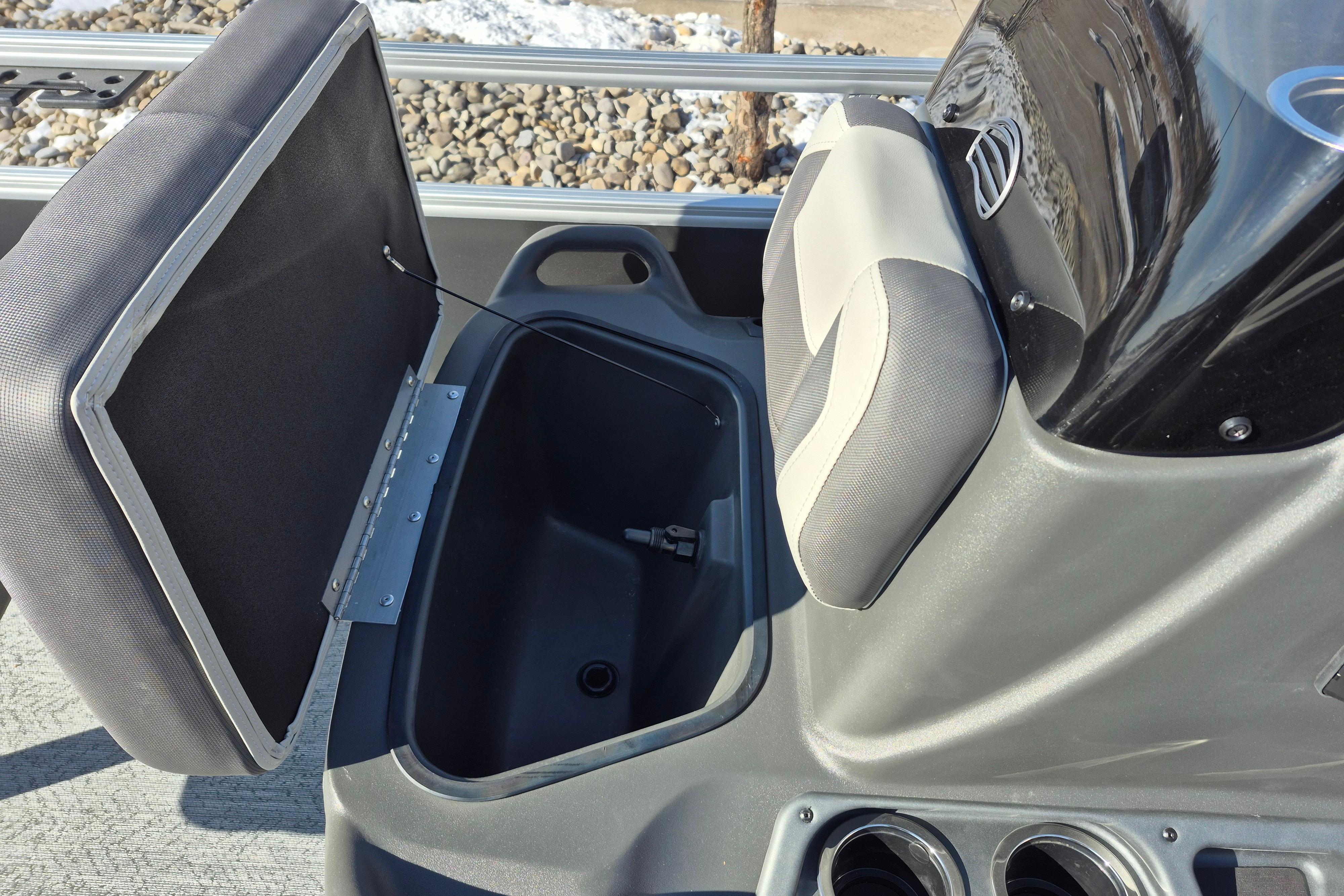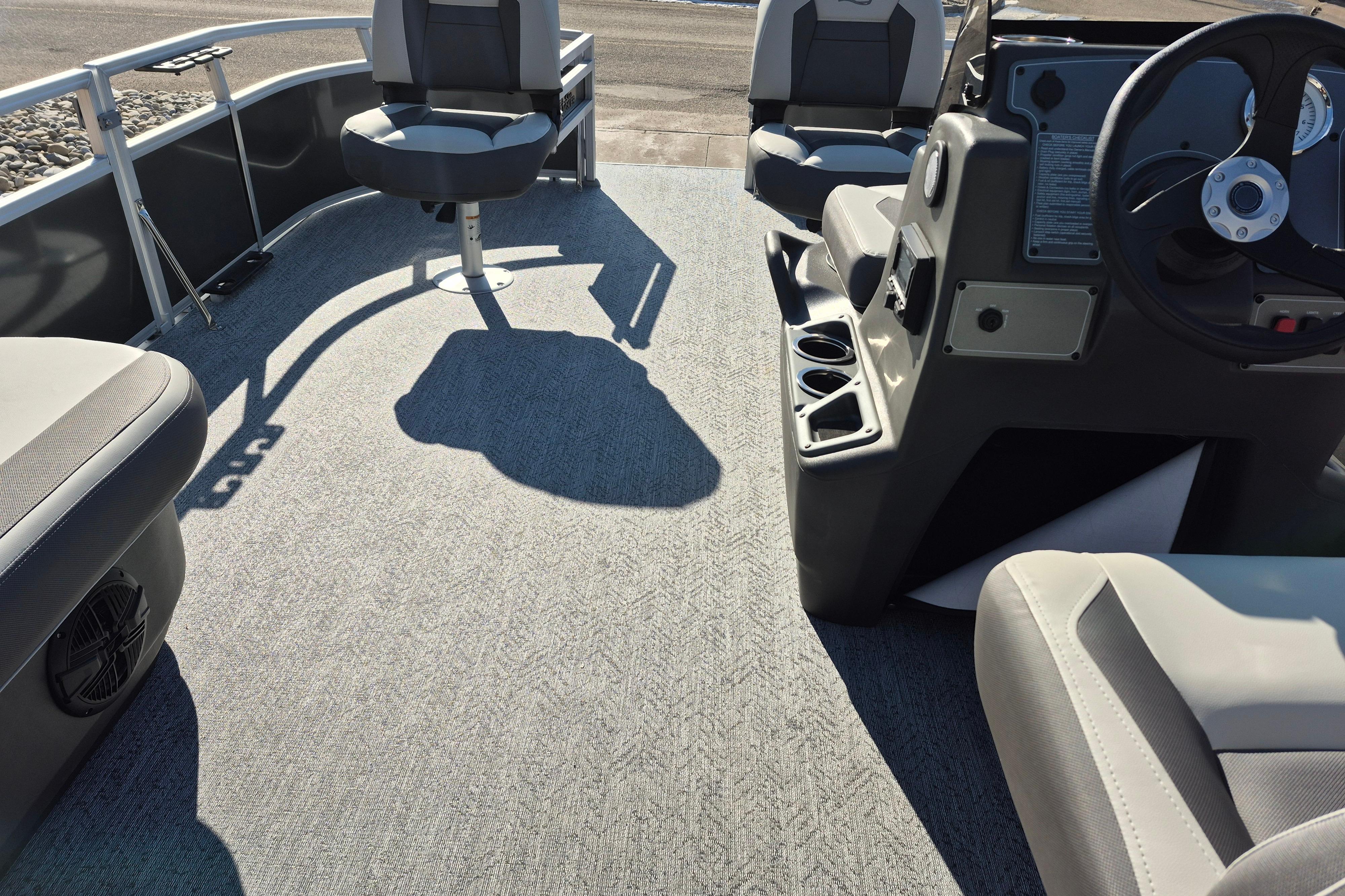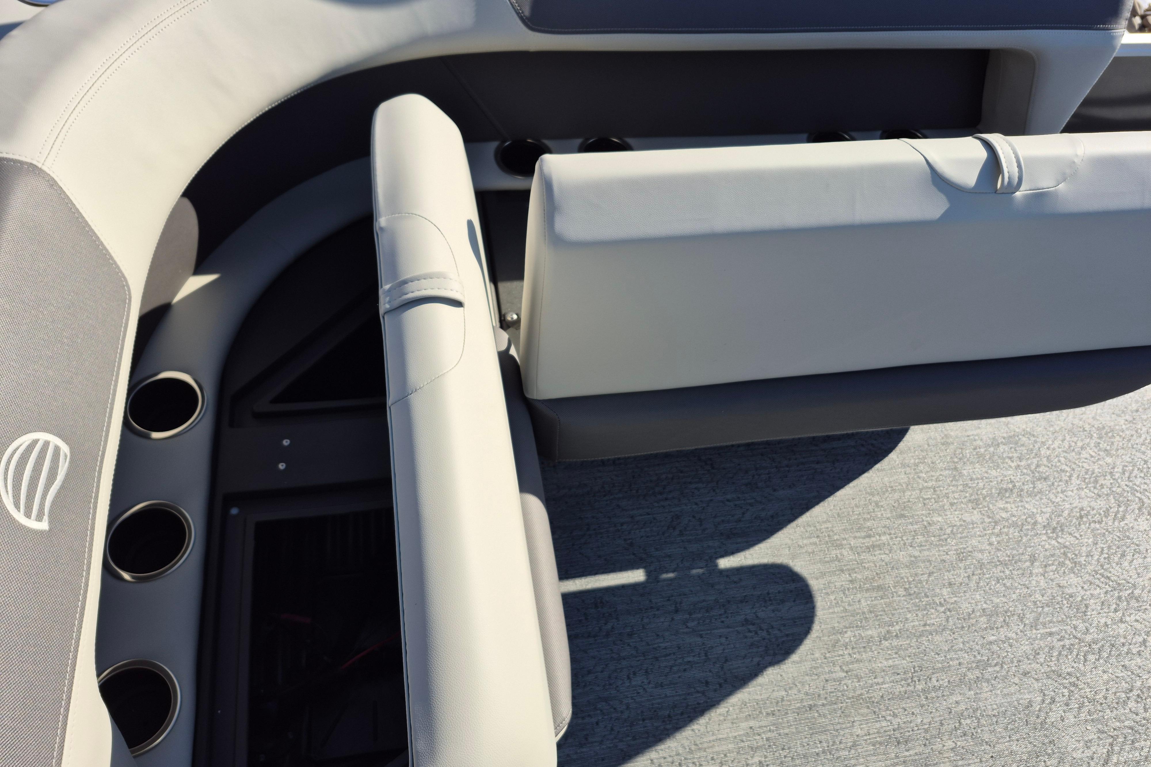 This seven-passenger fishing pontoon hits the water with new console and lounge designs. Get three extra cubic feet of storage thanks to clever backrest cut-outs. The redesign also adds a seat in front of the driver console, phone compartments, and four more cupholders. Cast from the shade of a standard 7' bimini top in one of the two folding fishing seats. Find your spot on the lake from the decked-out driver console, which comes with its own rod holder.