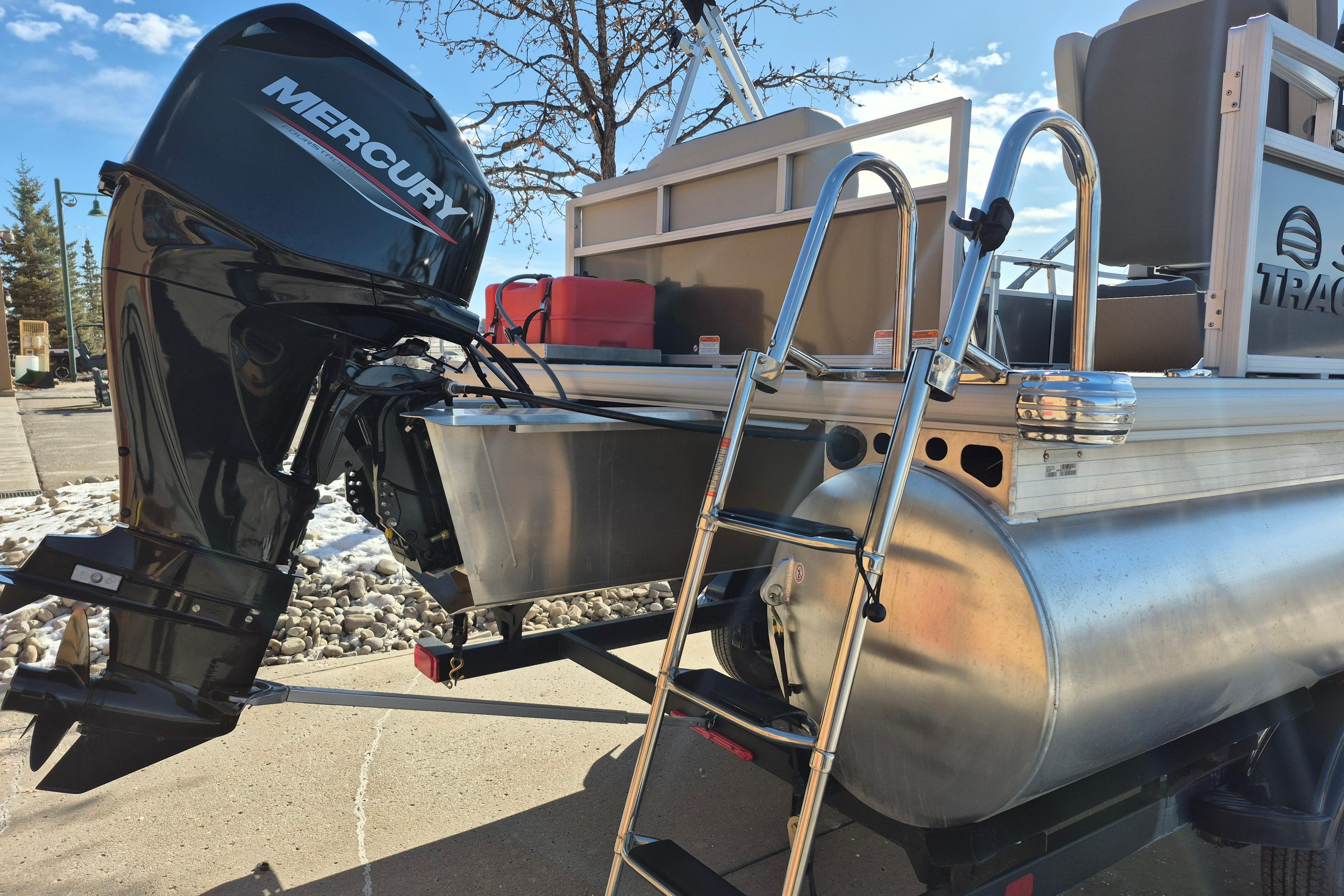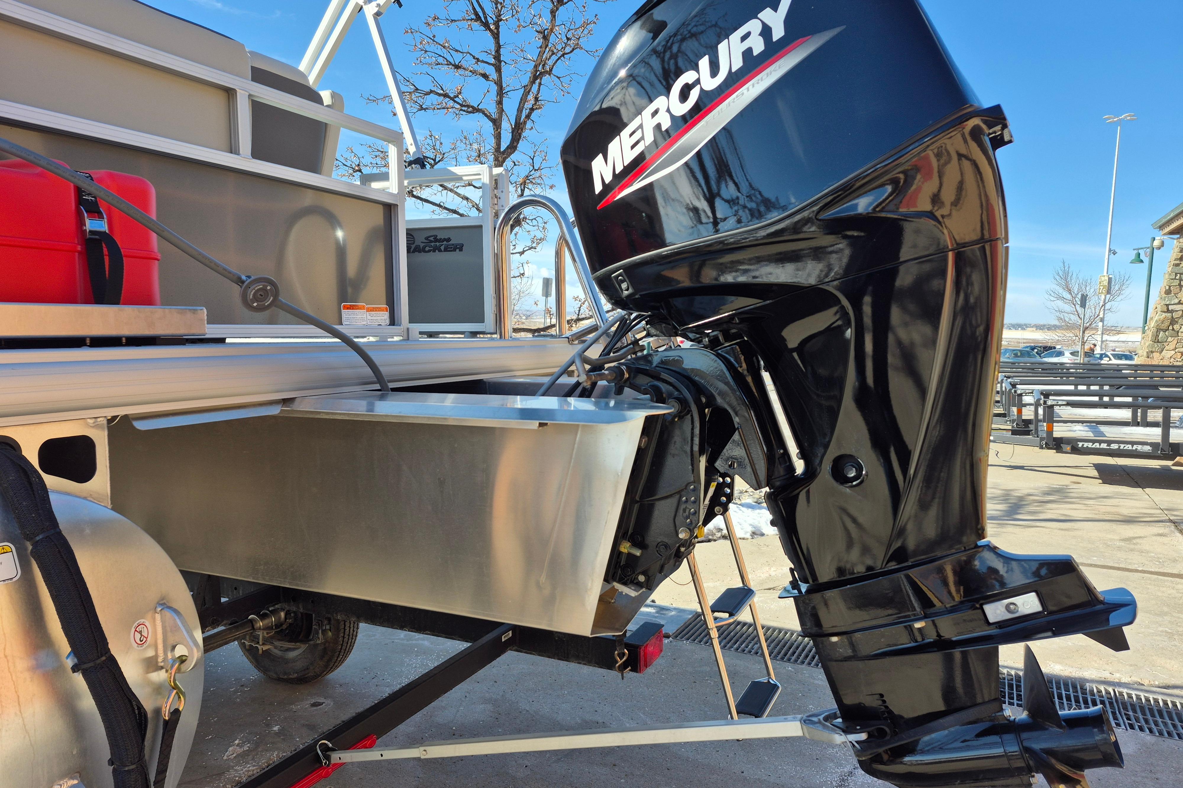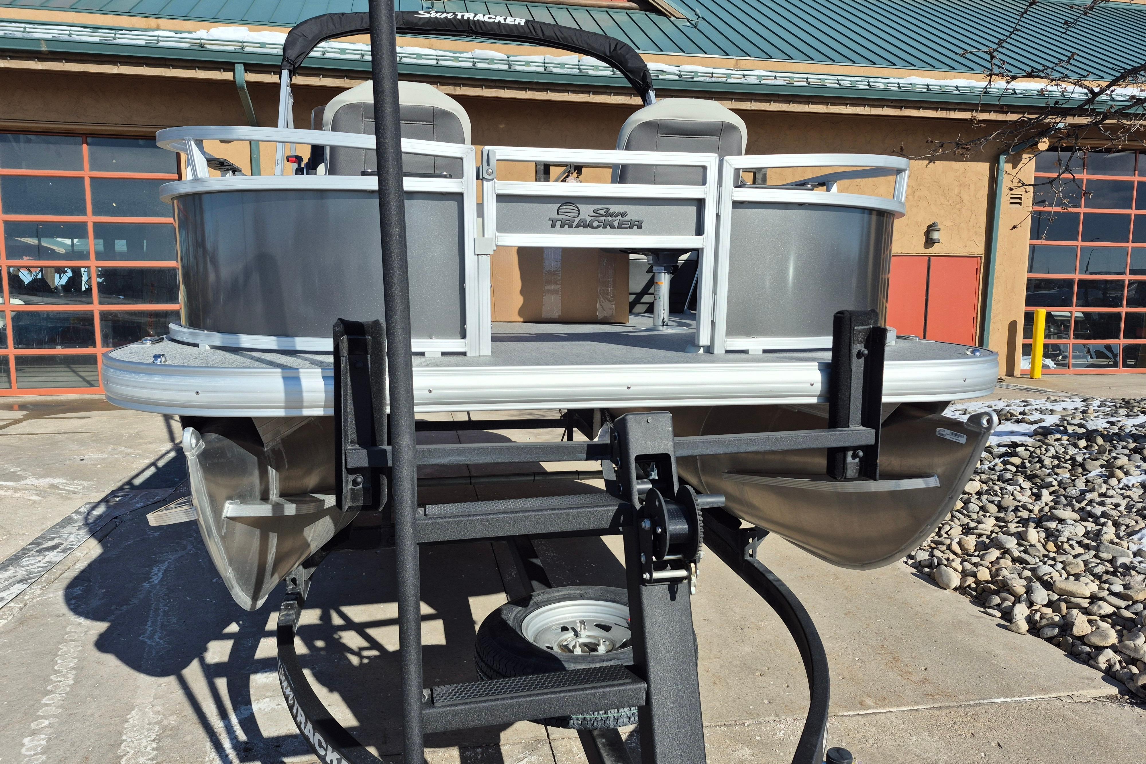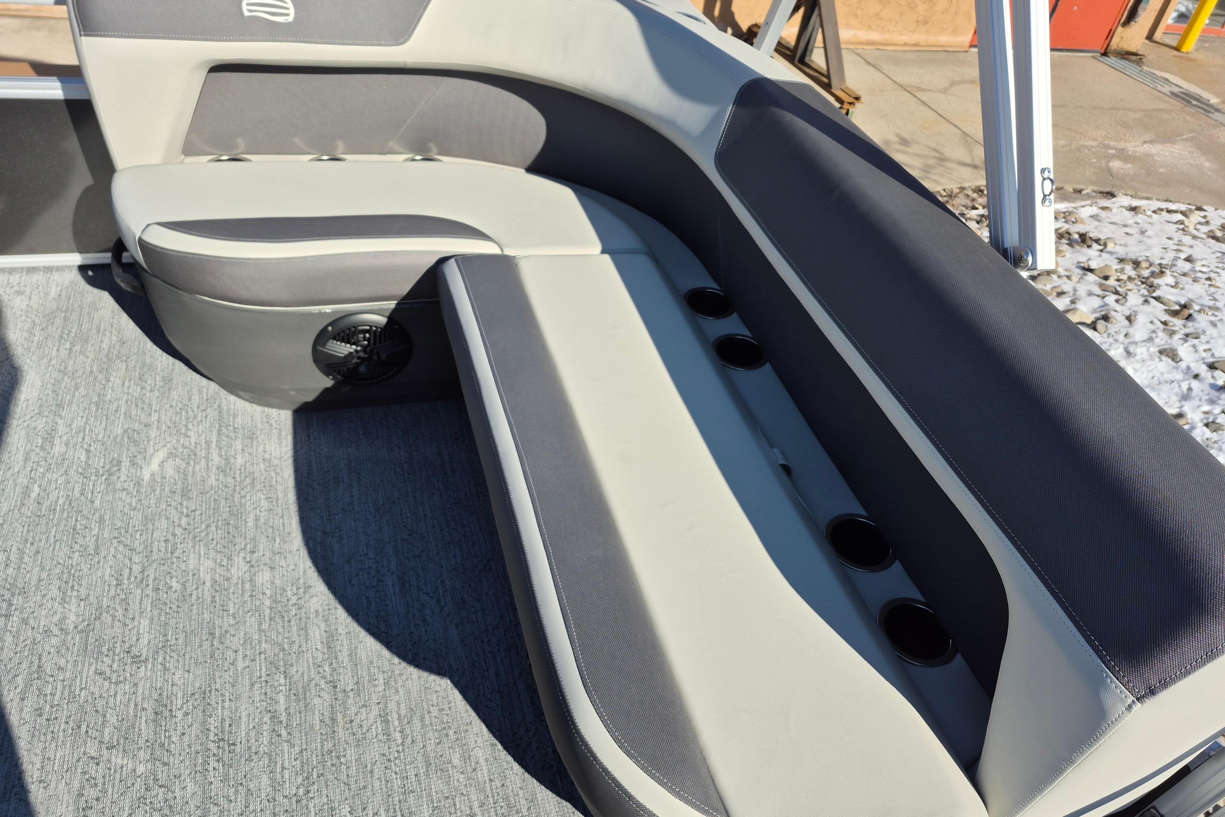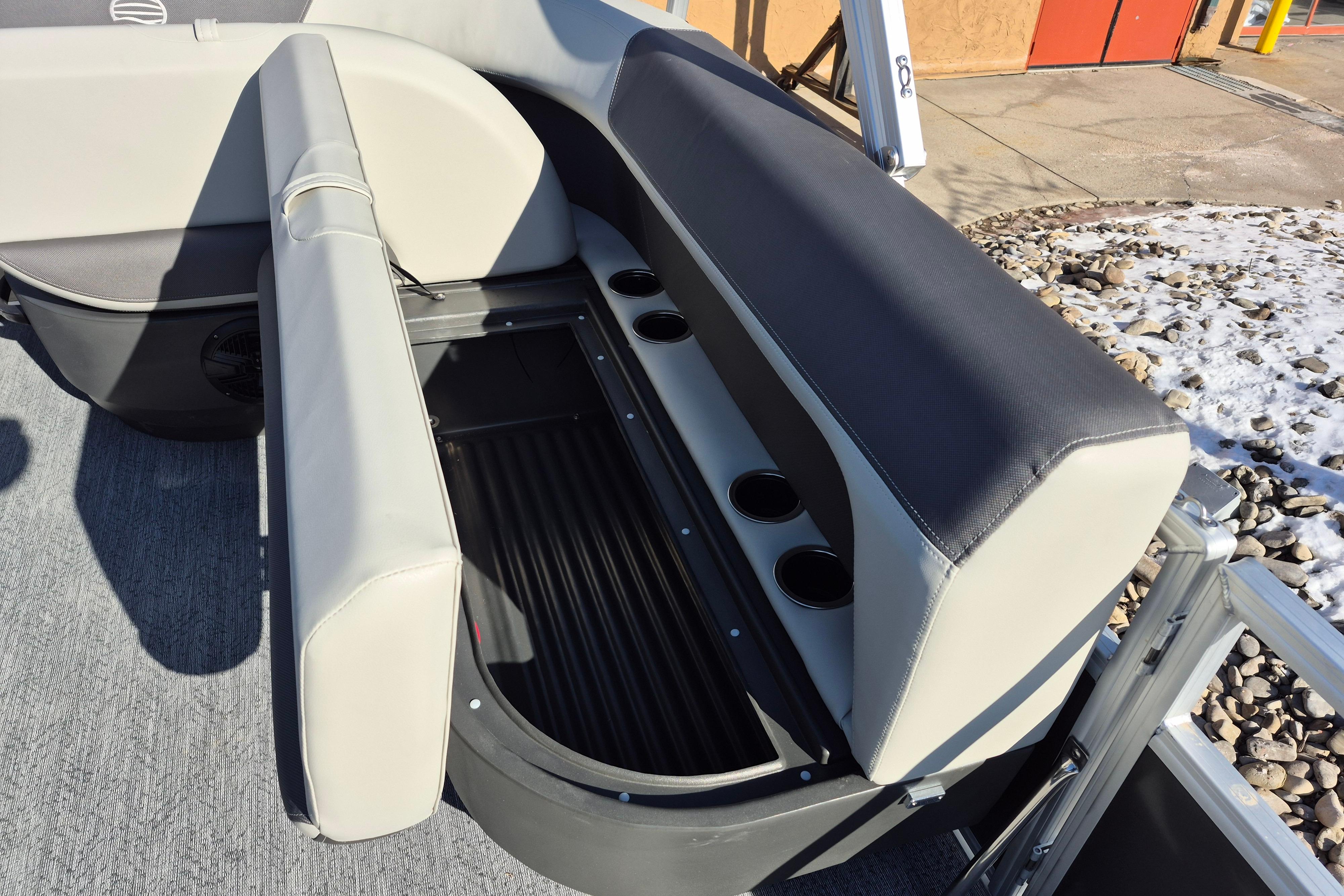 This seven-passenger fishing pontoon hits the water with new console and lounge designs. Get three extra cubic feet of storage thanks to clever backrest cut-outs. The redesign also adds a seat in front of the driver console, phone compartments, and four more cupholders. Cast from the shade of a standard 7' bimini top in one of the two folding fishing seats. Find your spot on the lake from the decked-out driver console, which comes with its own rod holder.