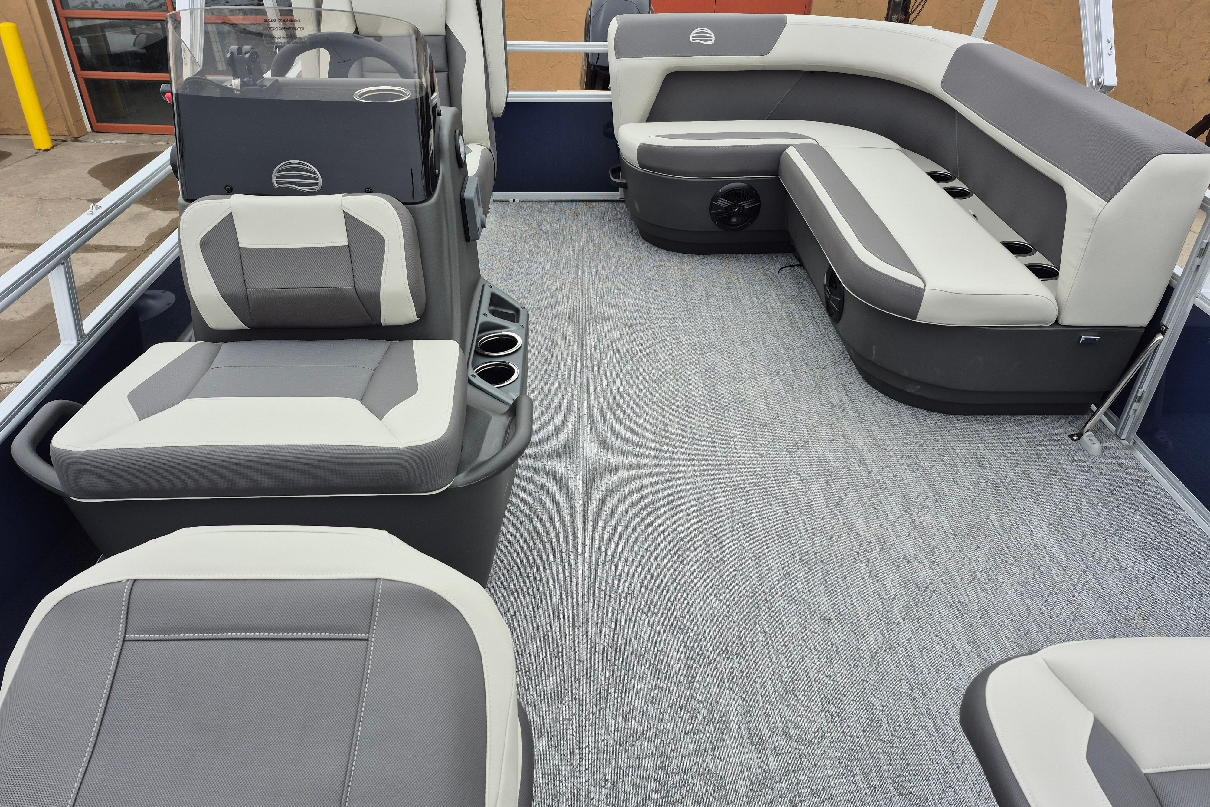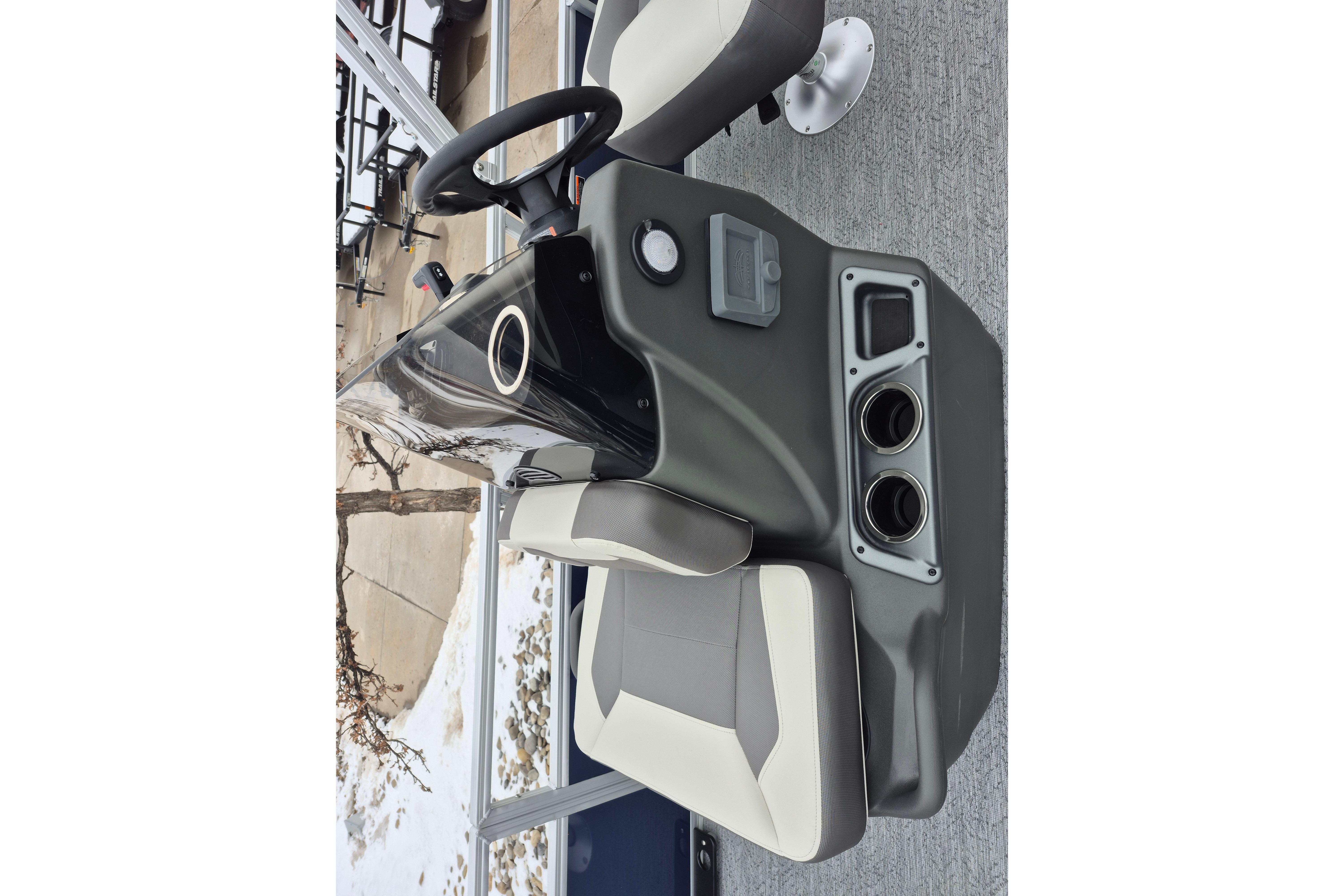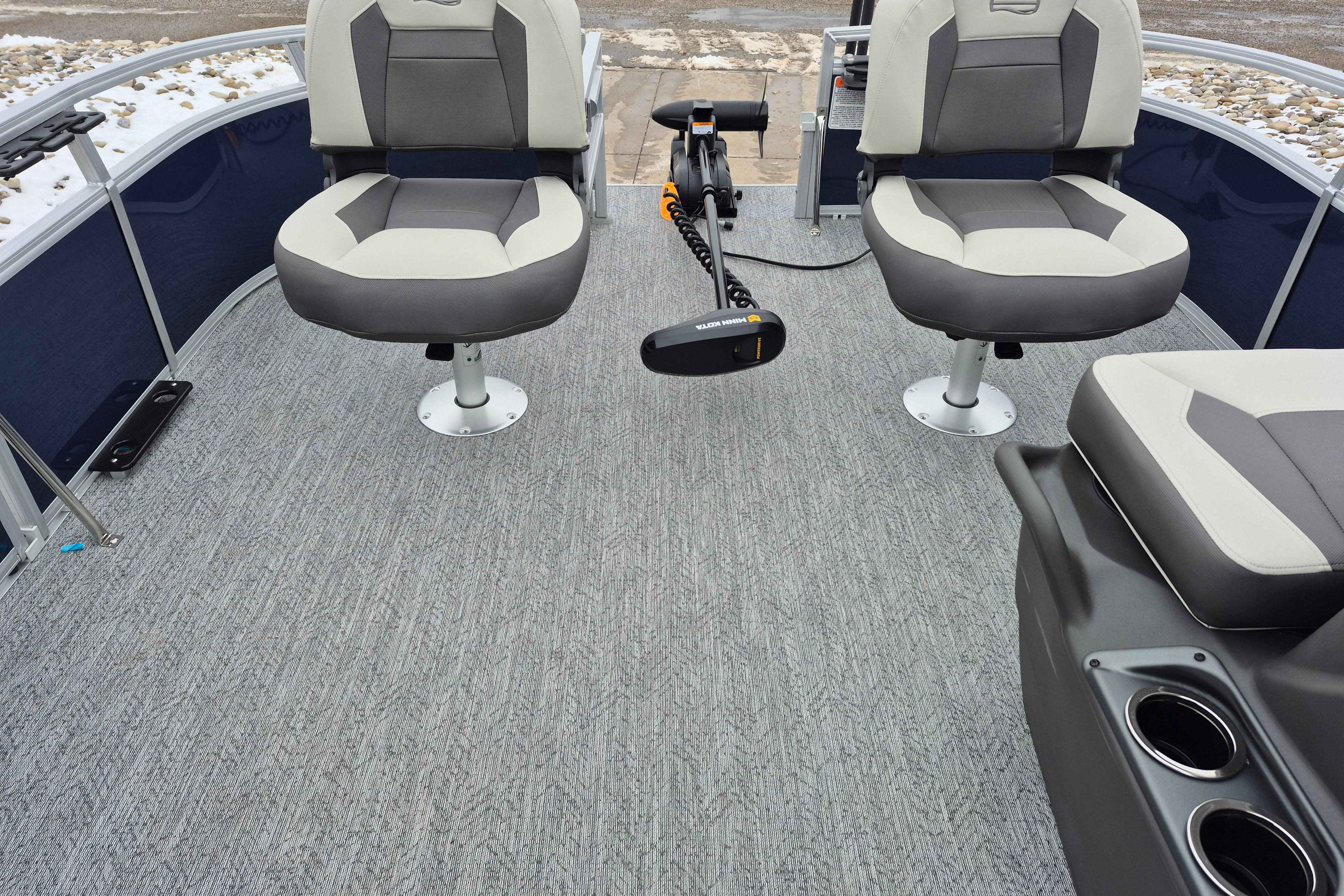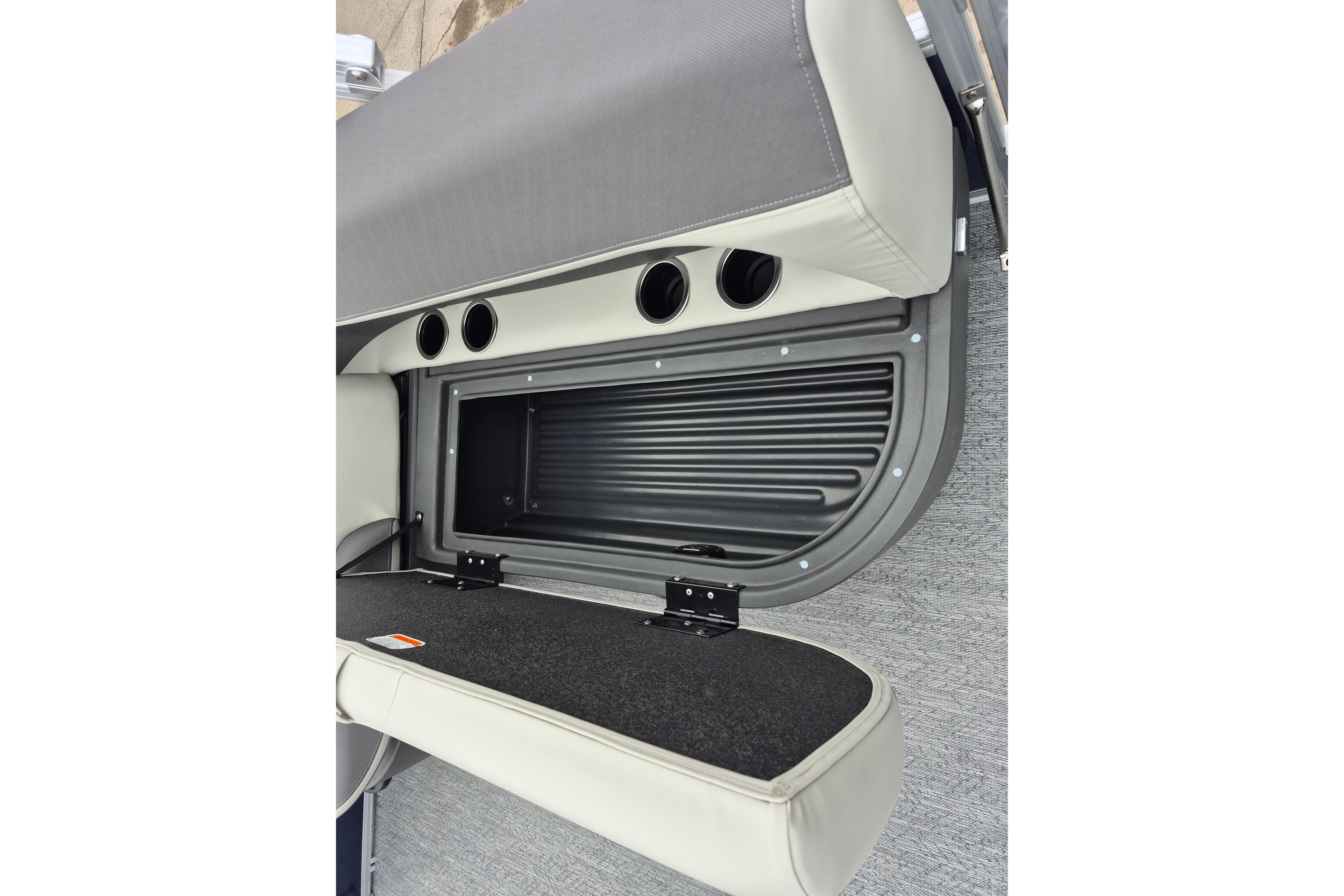 This seven-passenger fishing pontoon hits the water with new console and lounge designs. Get three extra cubic feet of storage thanks to clever backrest cut-outs. The redesign also adds a seat in front of the driver console, phone compartments, and four more cupholders. Cast from the shade of a standard 7' bimini top in one of the two folding fishing seats. Find your spot on the lake from the decked-out driver console, which comes with its own rod holder.