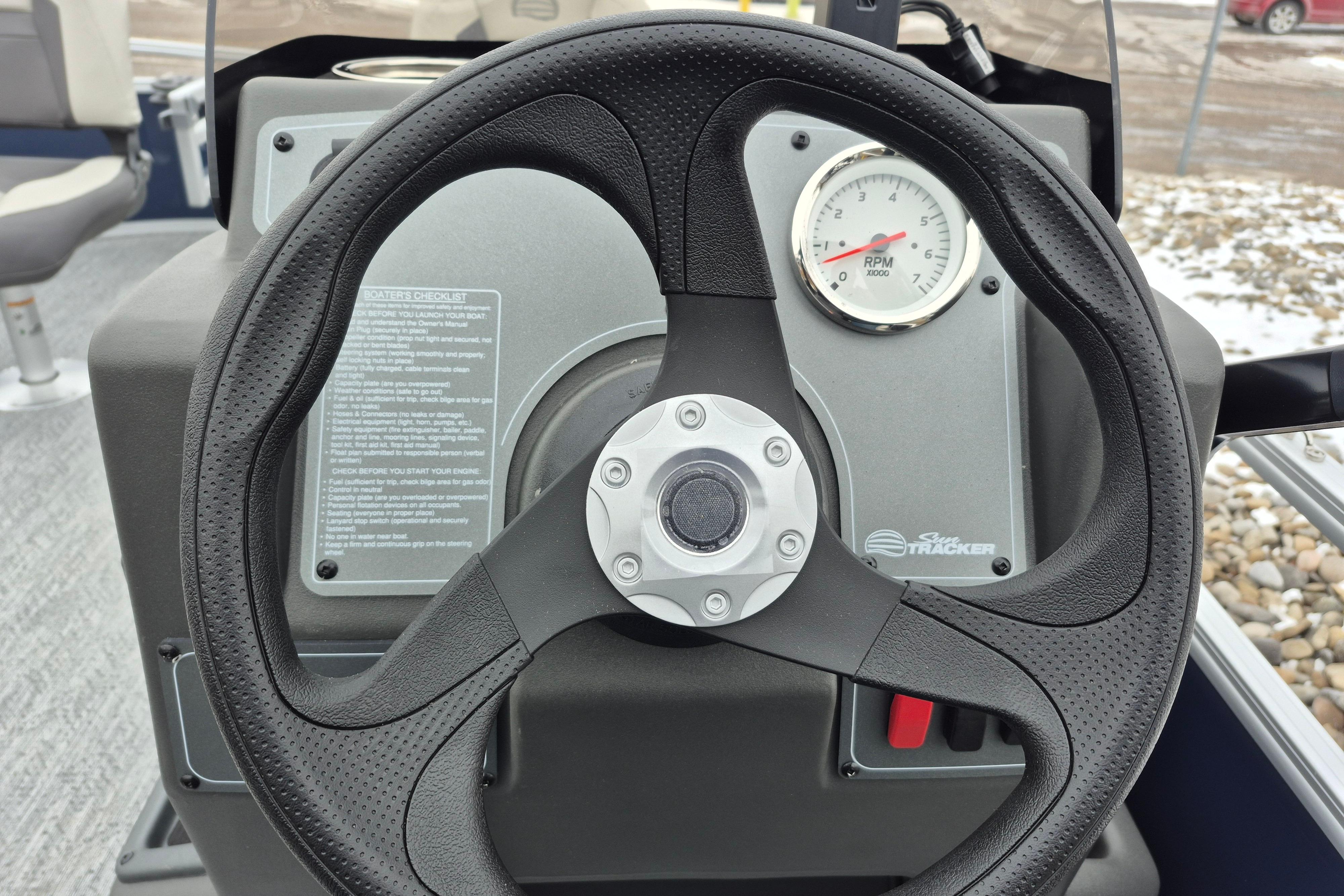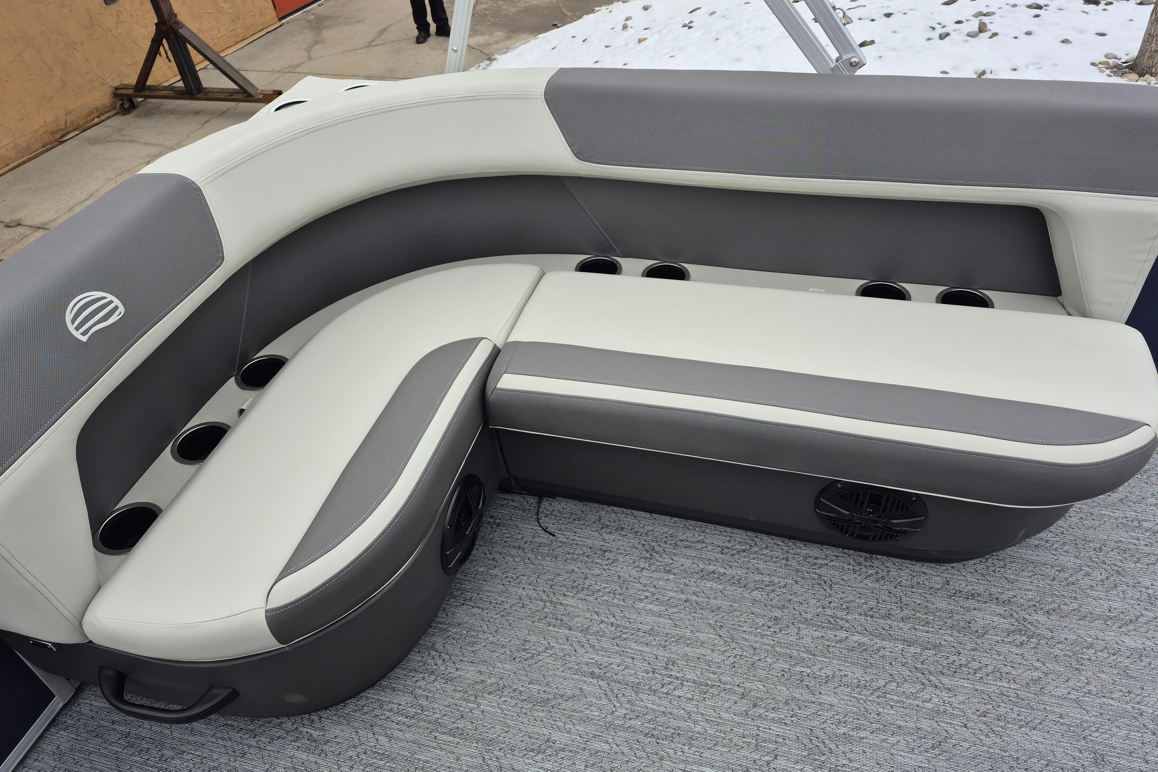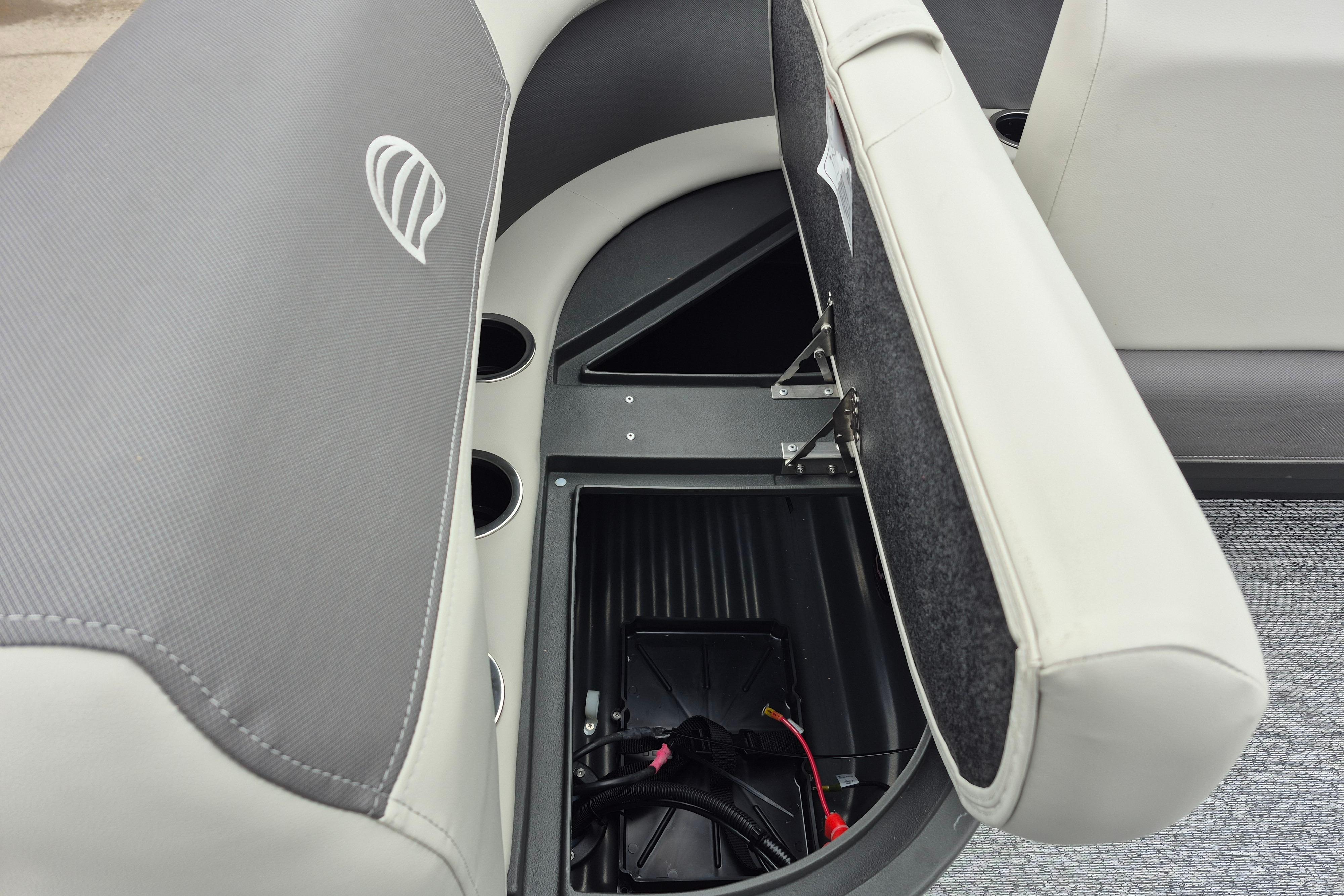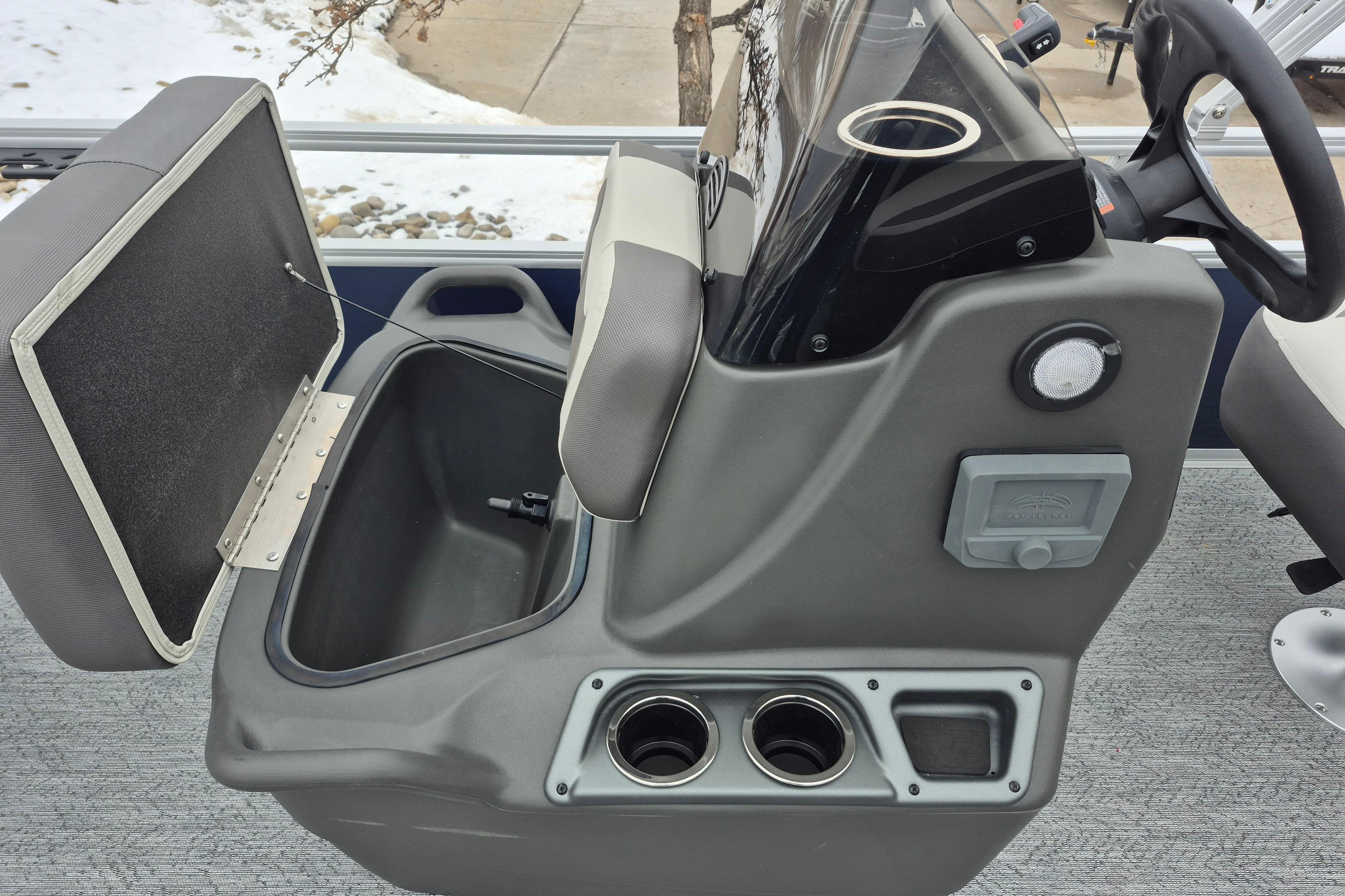 This seven-passenger fishing pontoon hits the water with new console and lounge designs. Get three extra cubic feet of storage thanks to clever backrest cut-outs. The redesign also adds a seat in front of the driver console, phone compartments, and four more cupholders. Cast from the shade of a standard 7' bimini top in one of the two folding fishing seats. Find your spot on the lake from the decked-out driver console, which comes with its own rod holder.