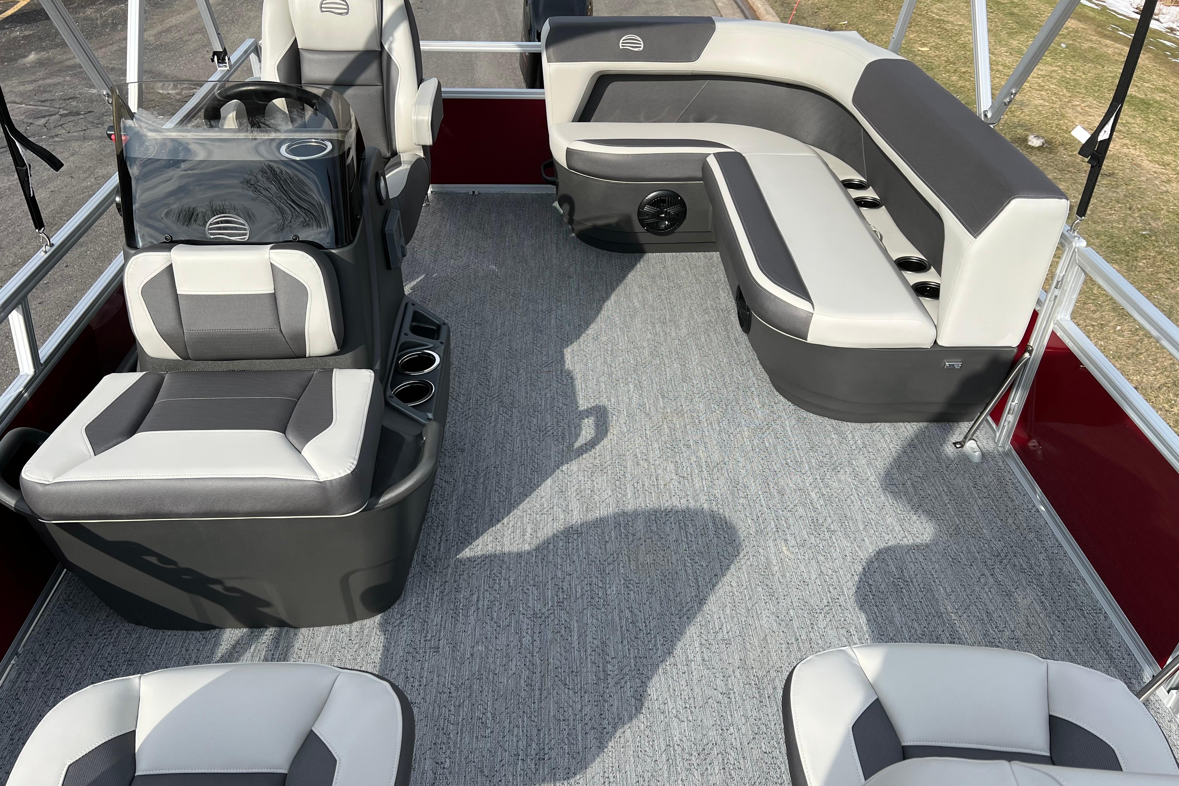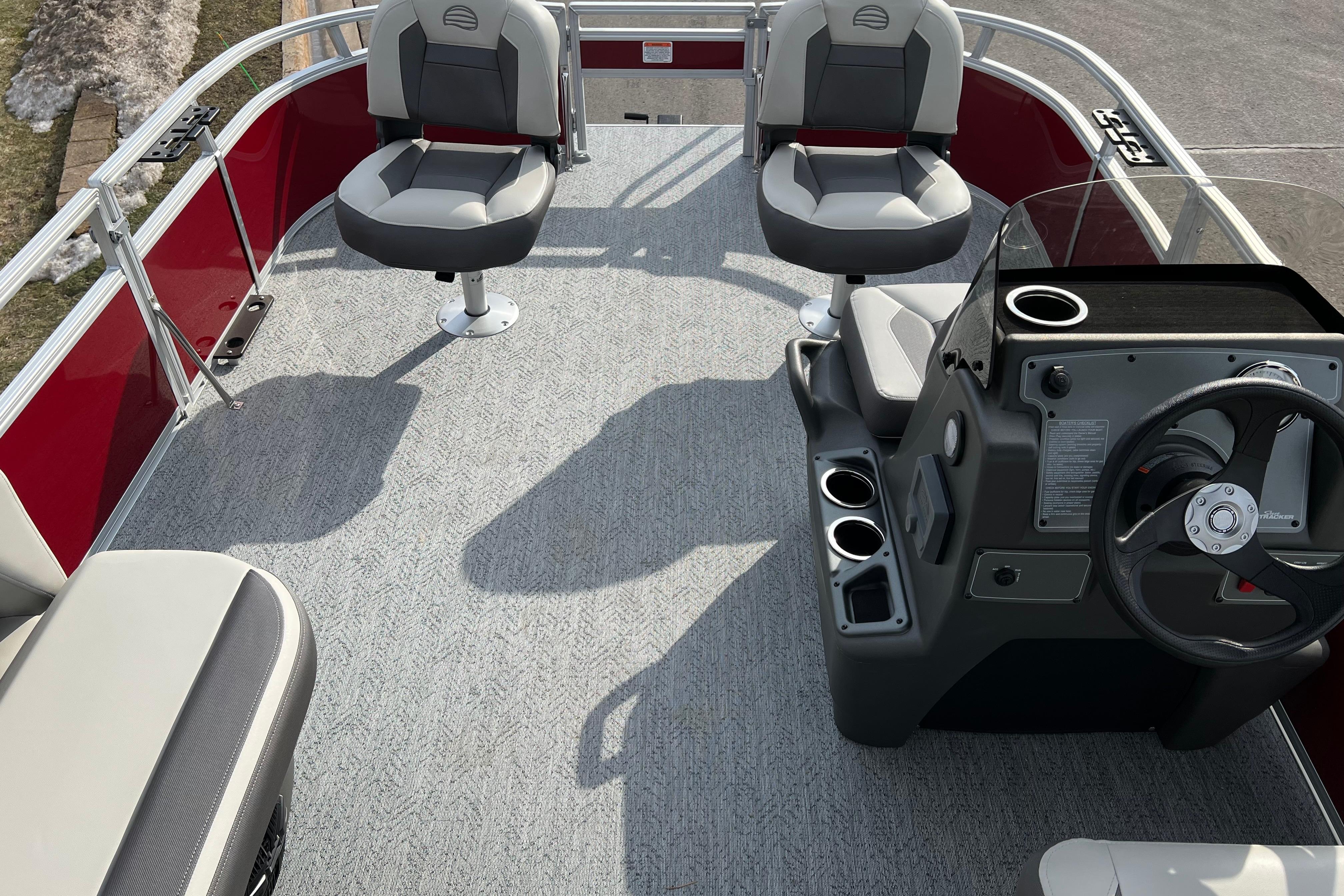 This seven-passenger fishing pontoon hits the water with new console and lounge designs. Get three extra cubic feet of storage thanks to clever backrest cut-outs. The redesign also adds a seat in front of the driver console, phone compartments, and four more cupholders. Cast from the shade of a standard 7' bimini top in one of the two folding fishing seats. Find your spot on the lake from the decked-out driver console, which comes with its own rod holder.