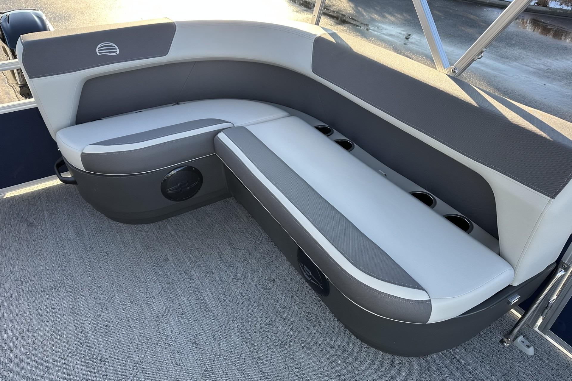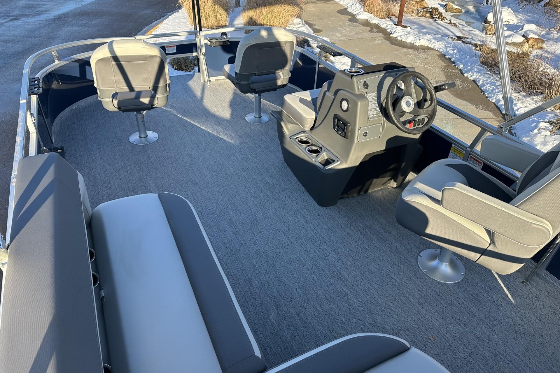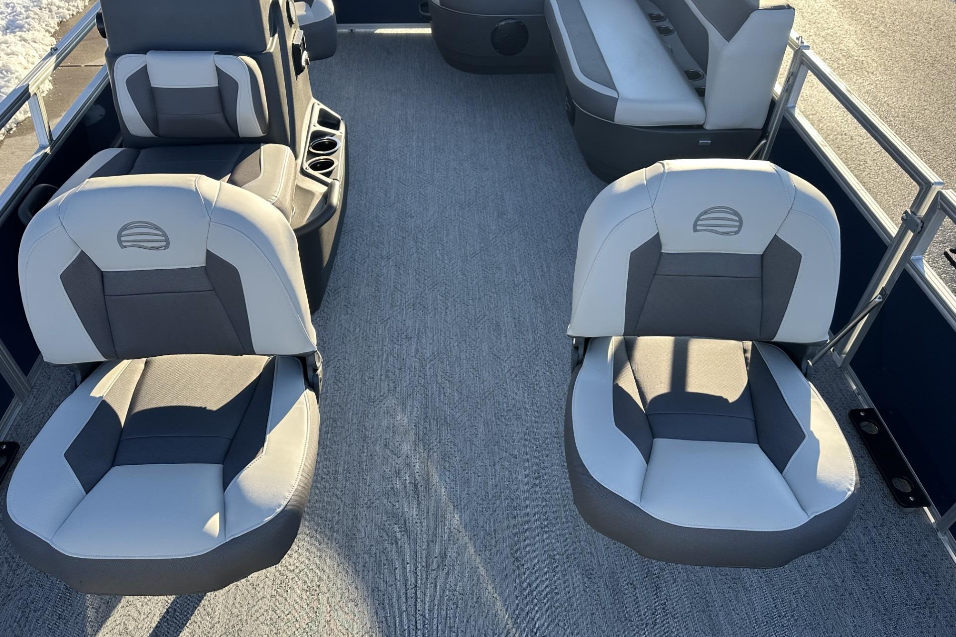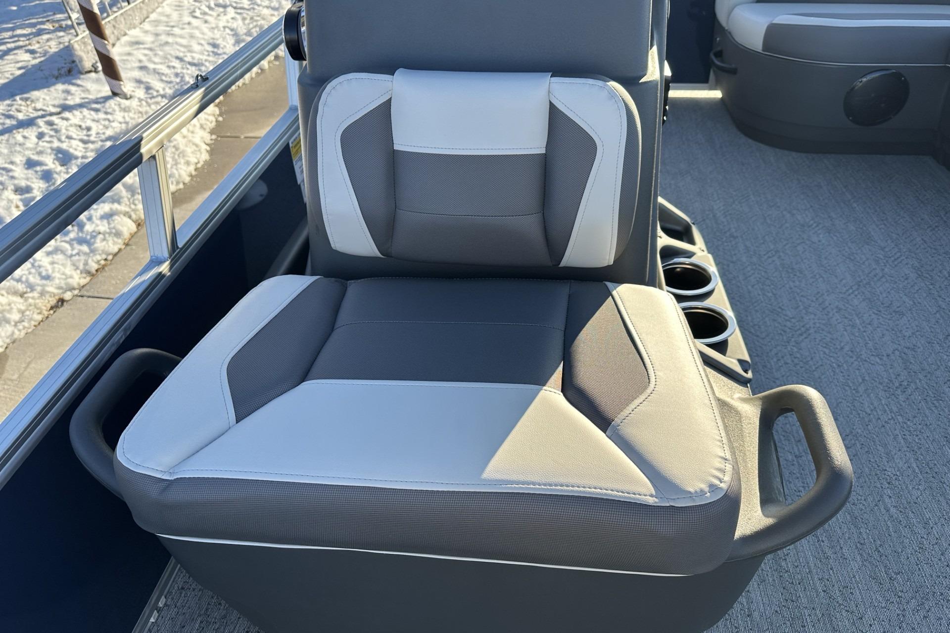 This seven-passenger fishing pontoon hits the water with new console and lounge designs. Get three extra cubic feet of storage thanks to clever backrest cut-outs. The redesign also adds a seat in front of the driver console, phone compartments, and four more cupholders. Cast from the shade of a standard 7' bimini top in one of the two folding fishing seats. Find your spot on the lake from the decked-out driver console, which comes with its own rod holder.