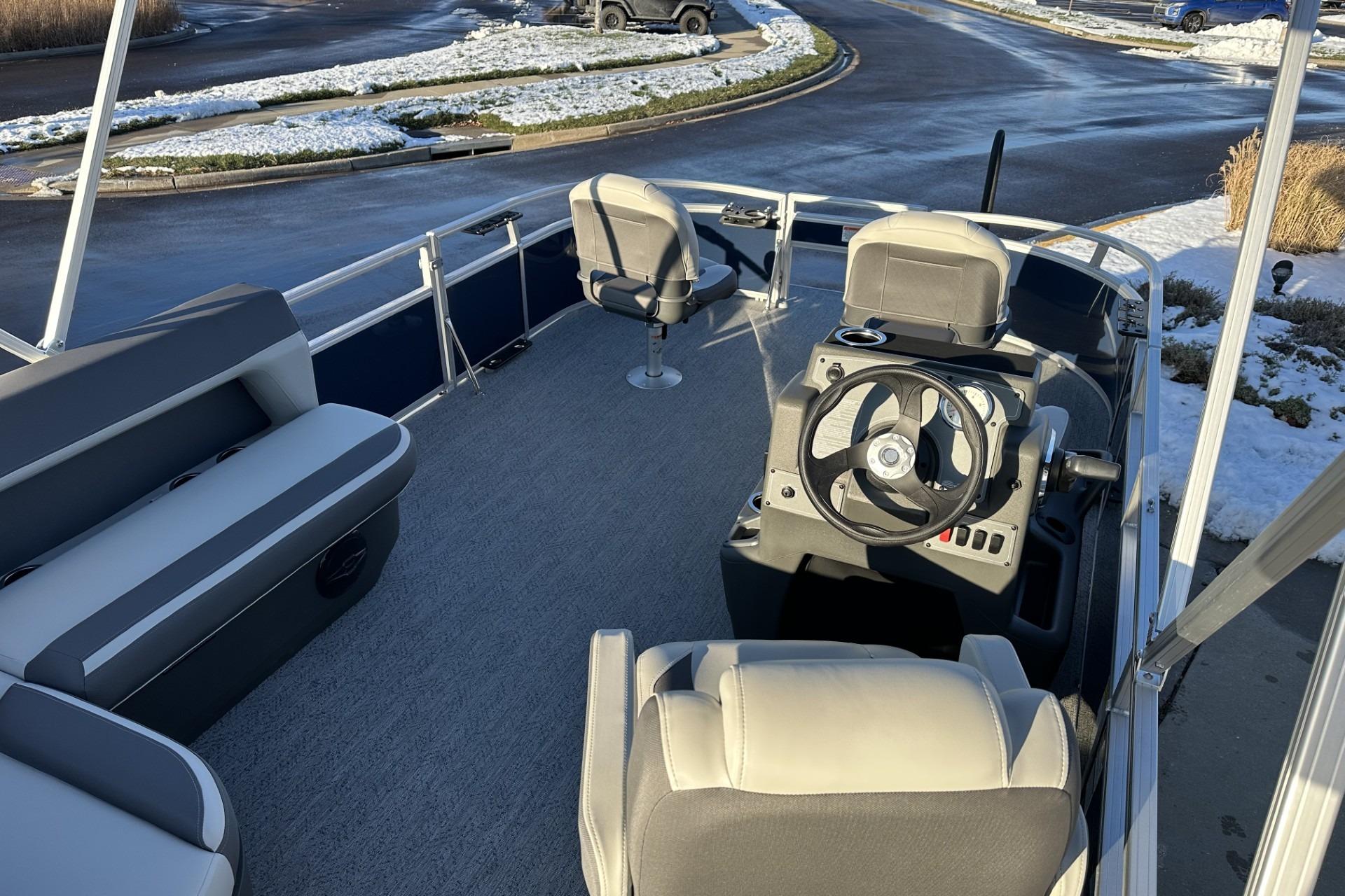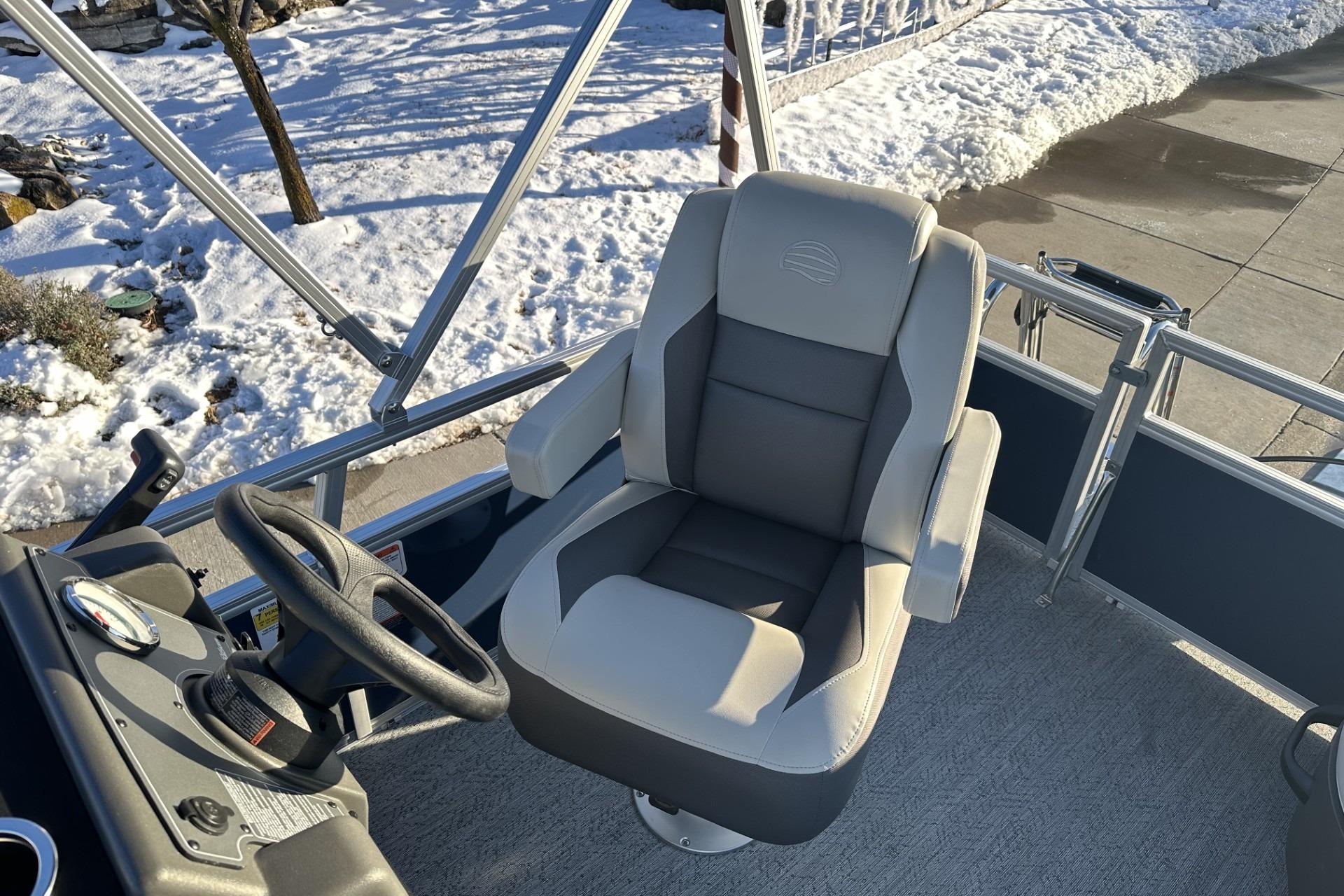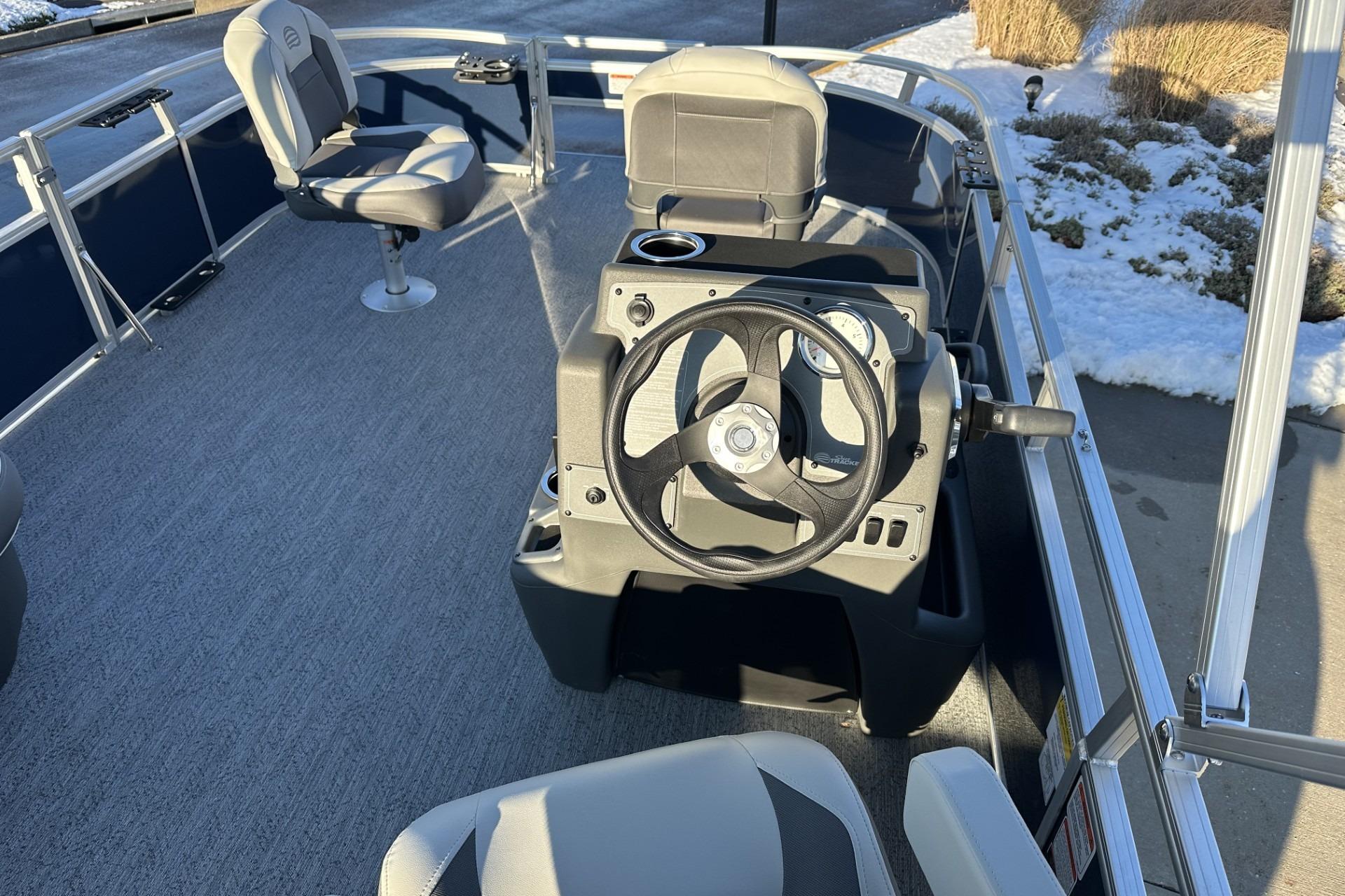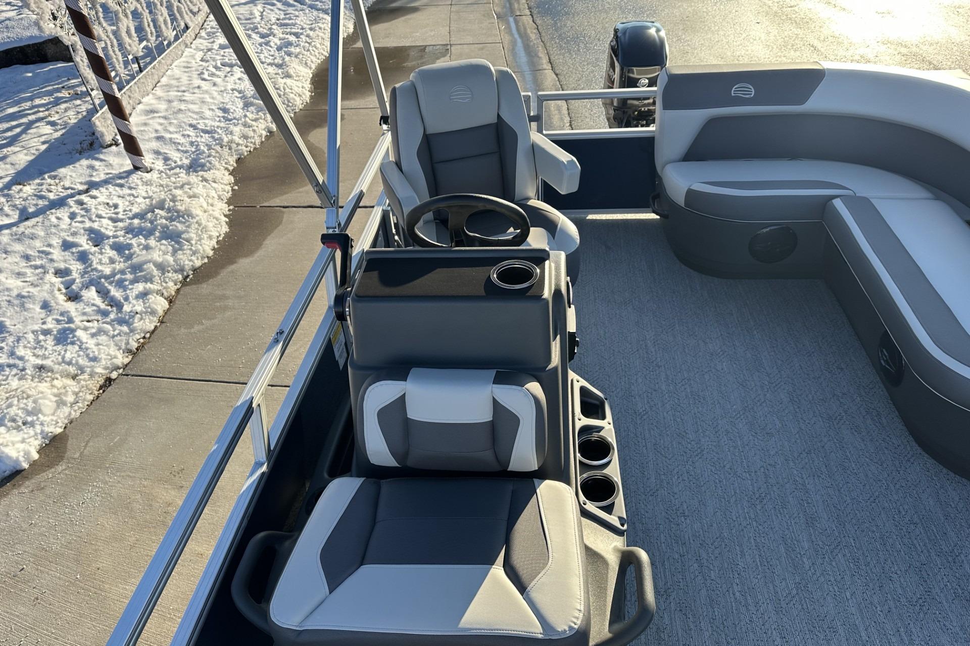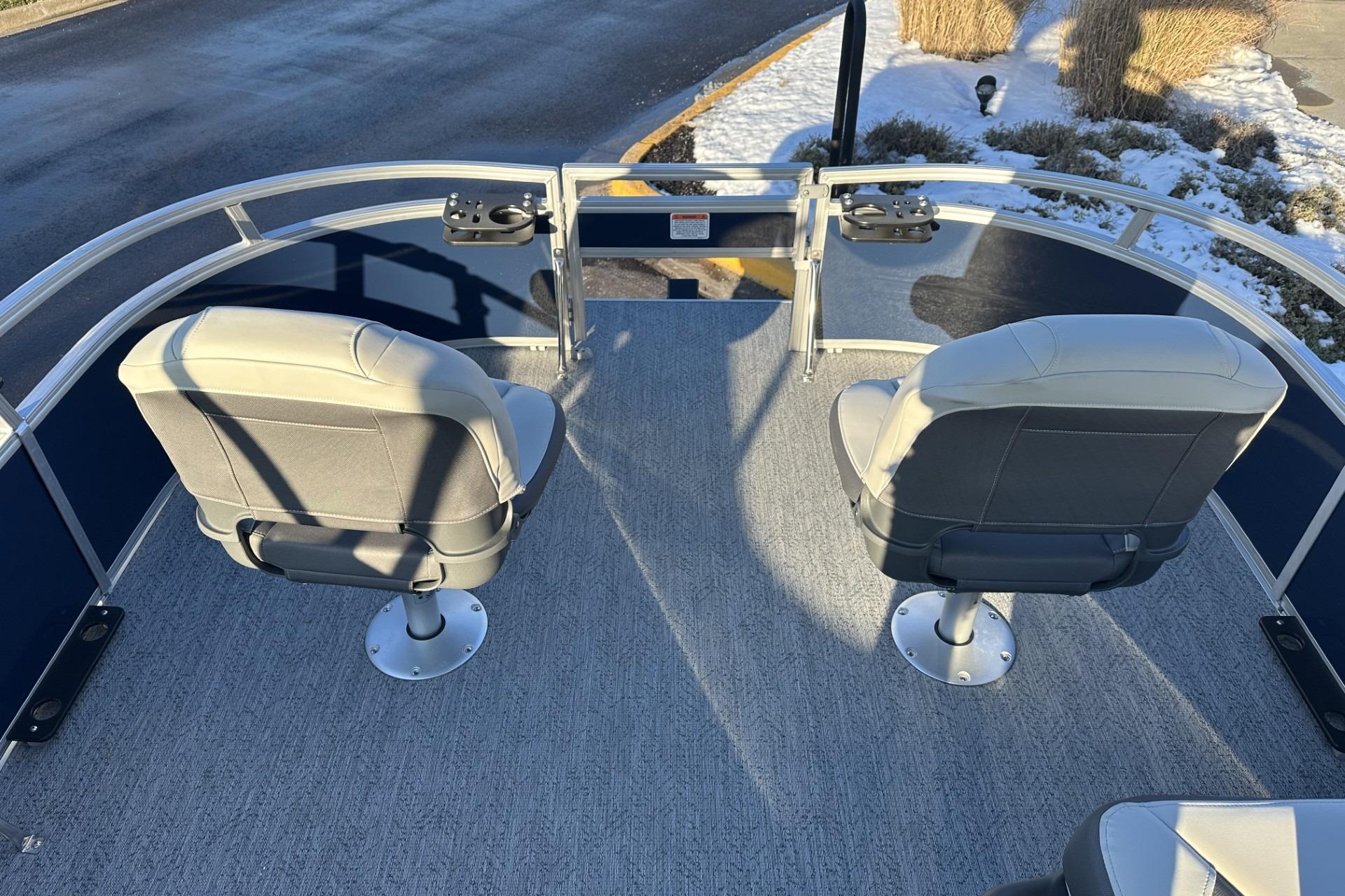 This seven-passenger fishing pontoon hits the water with new console and lounge designs. Get three extra cubic feet of storage thanks to clever backrest cut-outs. The redesign also adds a seat in front of the driver console, phone compartments, and four more cupholders. Cast from the shade of a standard 7' bimini top in one of the two folding fishing seats. Find your spot on the lake from the decked-out driver console, which comes with its own rod holder.