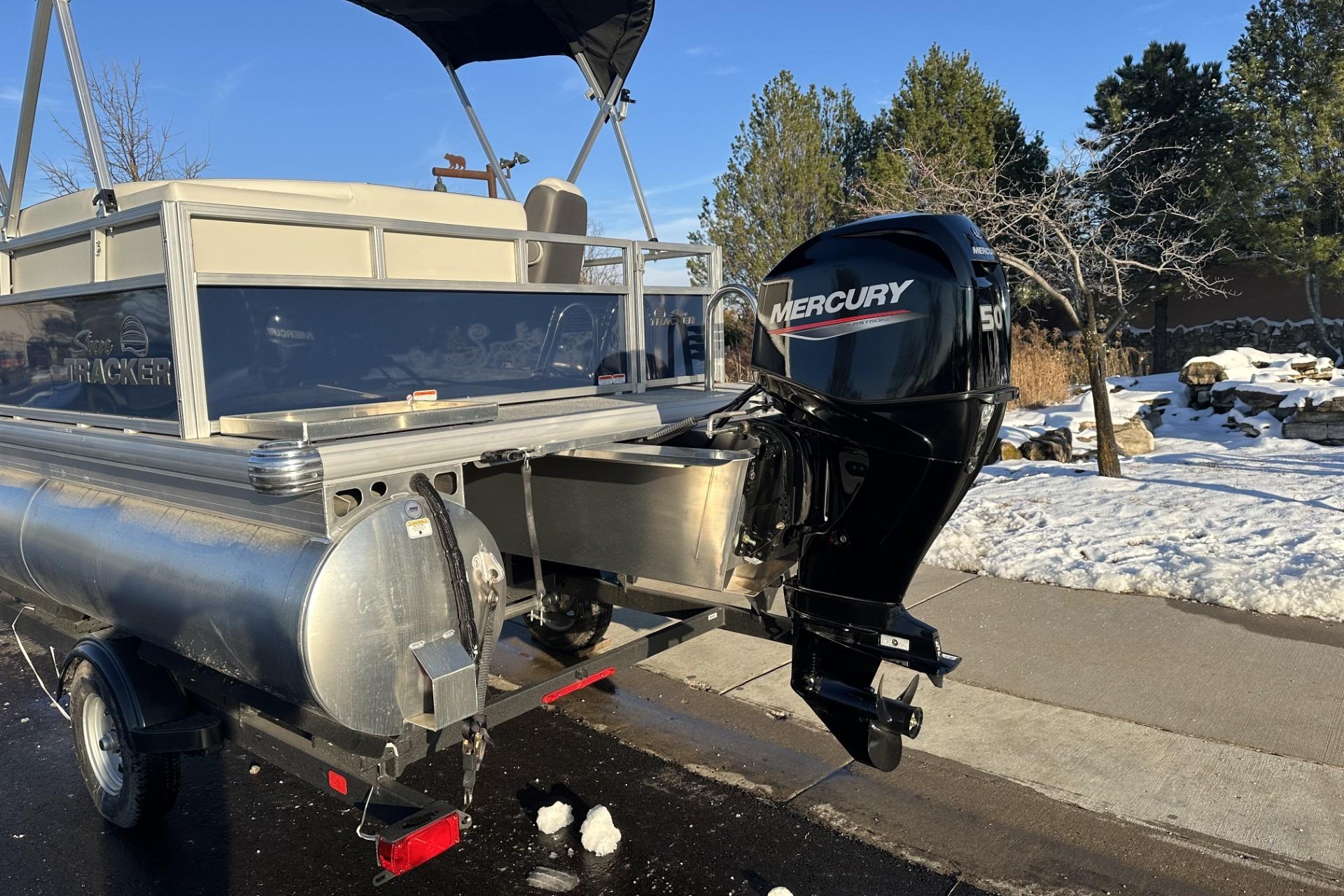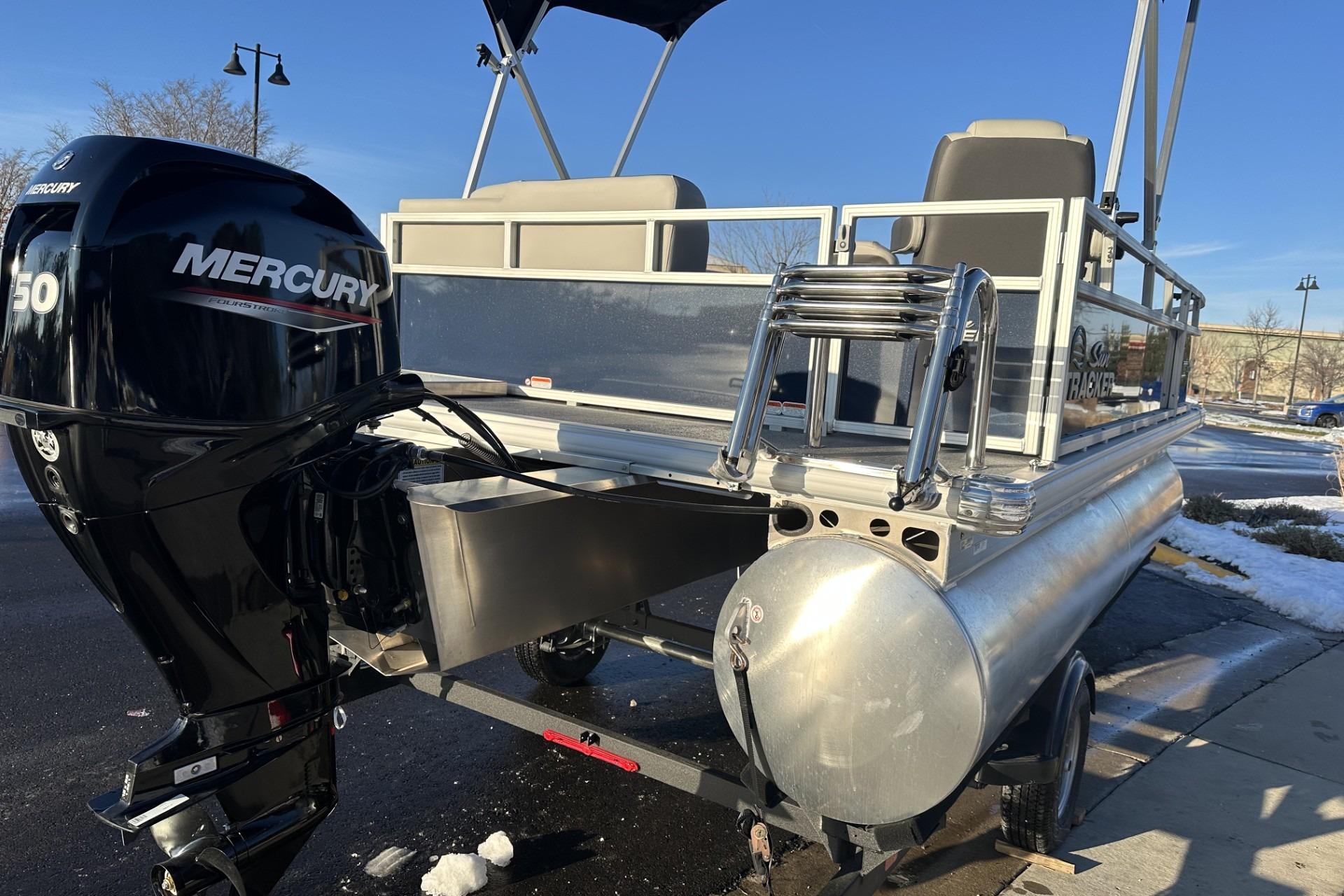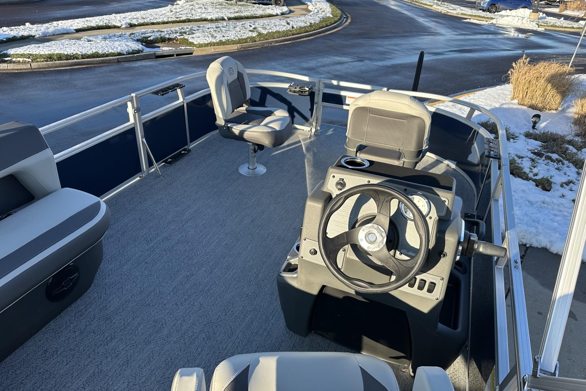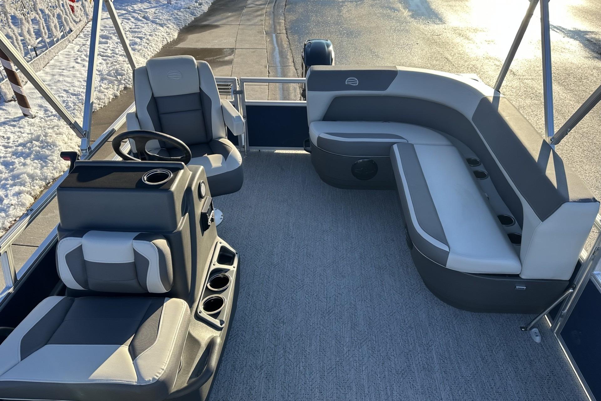 This seven-passenger fishing pontoon hits the water with new console and lounge designs. Get three extra cubic feet of storage thanks to clever backrest cut-outs. The redesign also adds a seat in front of the driver console, phone compartments, and four more cupholders. Cast from the shade of a standard 7' bimini top in one of the two folding fishing seats. Find your spot on the lake from the decked-out driver console, which comes with its own rod holder.