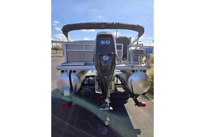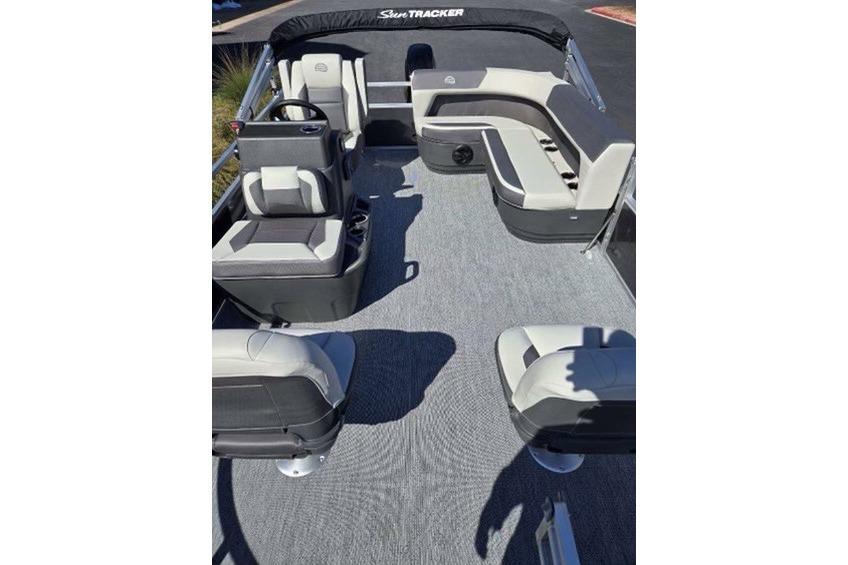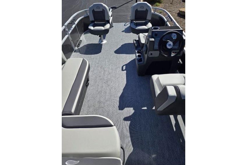 This seven-passenger fishing pontoon hits the water with new console and lounge designs. Get three extra cubic feet of storage thanks to clever backrest cut-outs. The redesign also adds a seat in front of the driver console, phone compartments, and four more cupholders. Cast from the shade of a standard 7' bimini top in one of the two folding fishing seats. Find your spot on the lake from the decked-out driver console, which comes with its own rod holder.