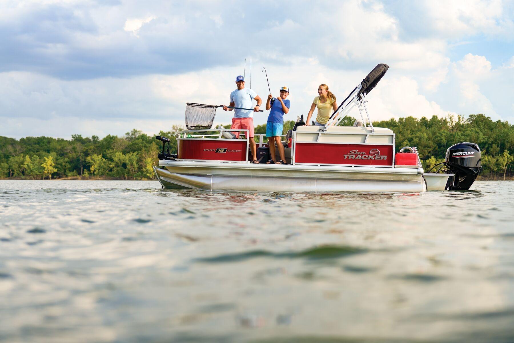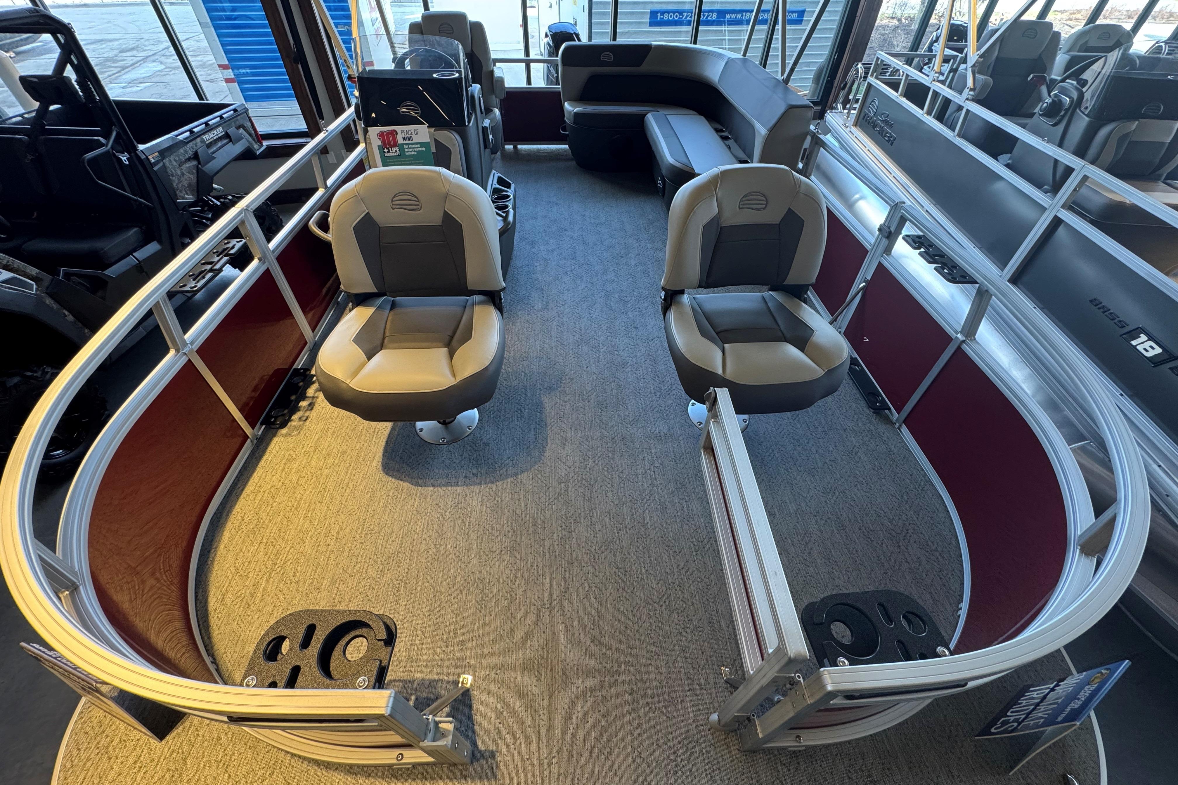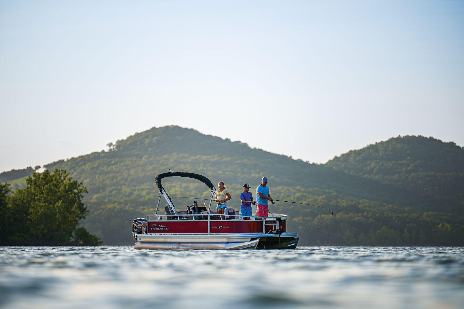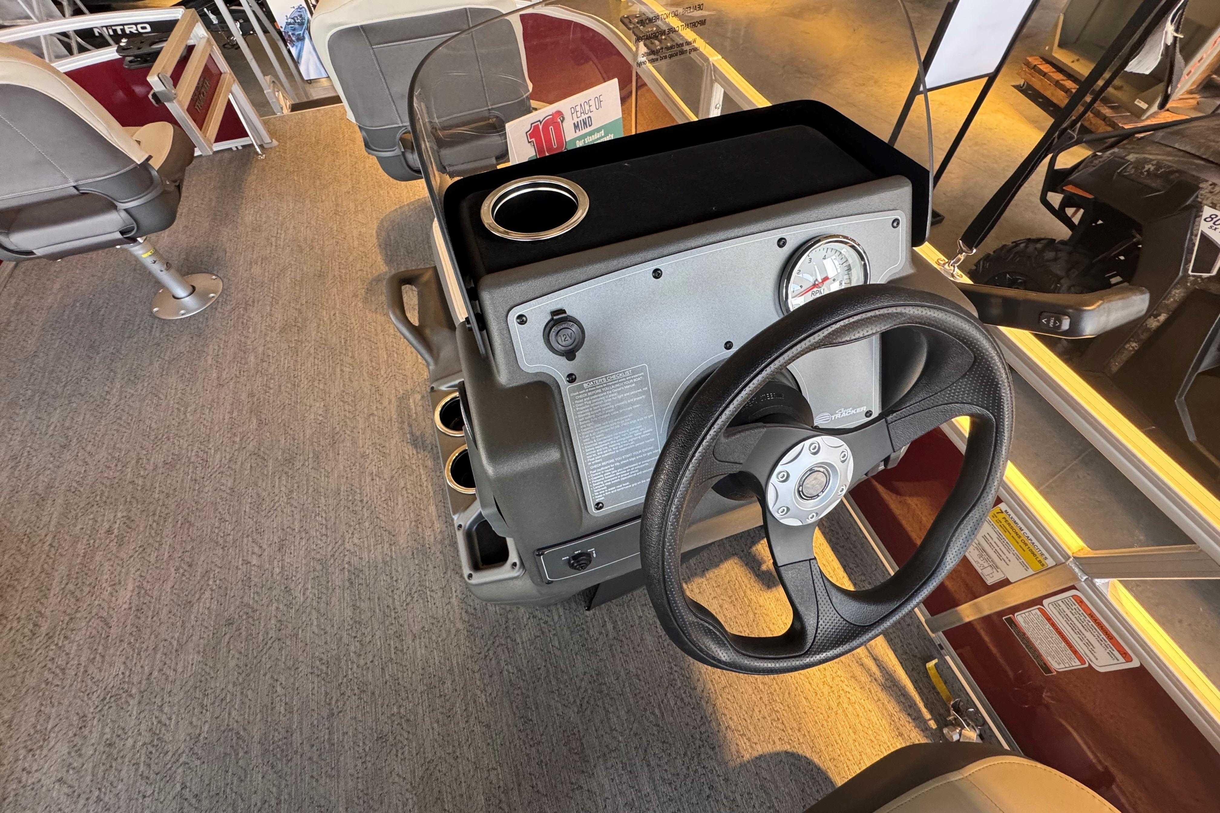 This seven-passenger fishing pontoon hits the water with new console and lounge designs. Get three extra cubic feet of storage thanks to clever backrest cut-outs. The redesign also adds a seat in front of the driver console, phone compartments, and four more cupholders. Cast from the shade of a standard 7' bimini top in one of the two folding fishing seats. Find your spot on the lake from the decked-out driver console, which comes with its own rod holder.