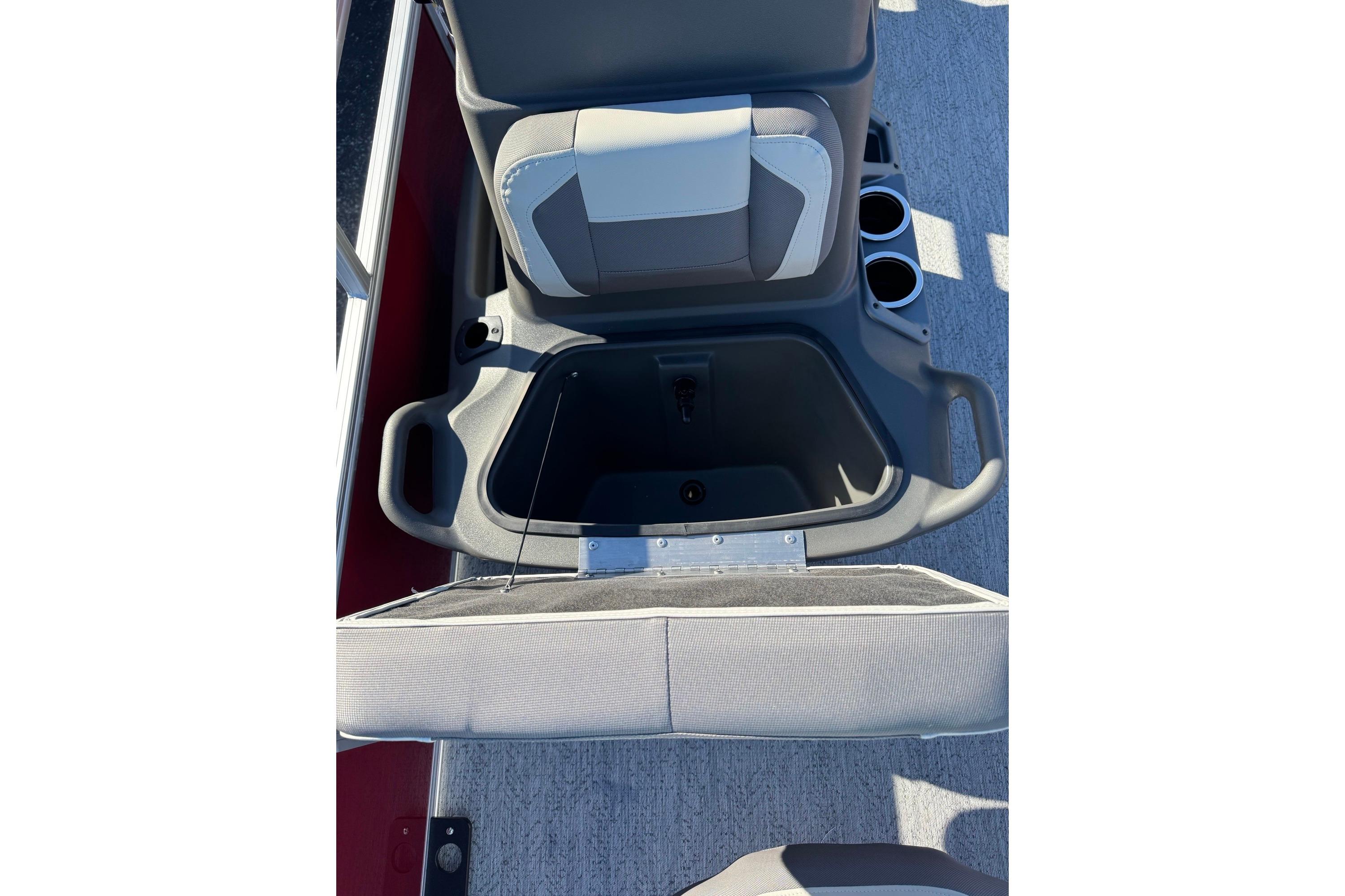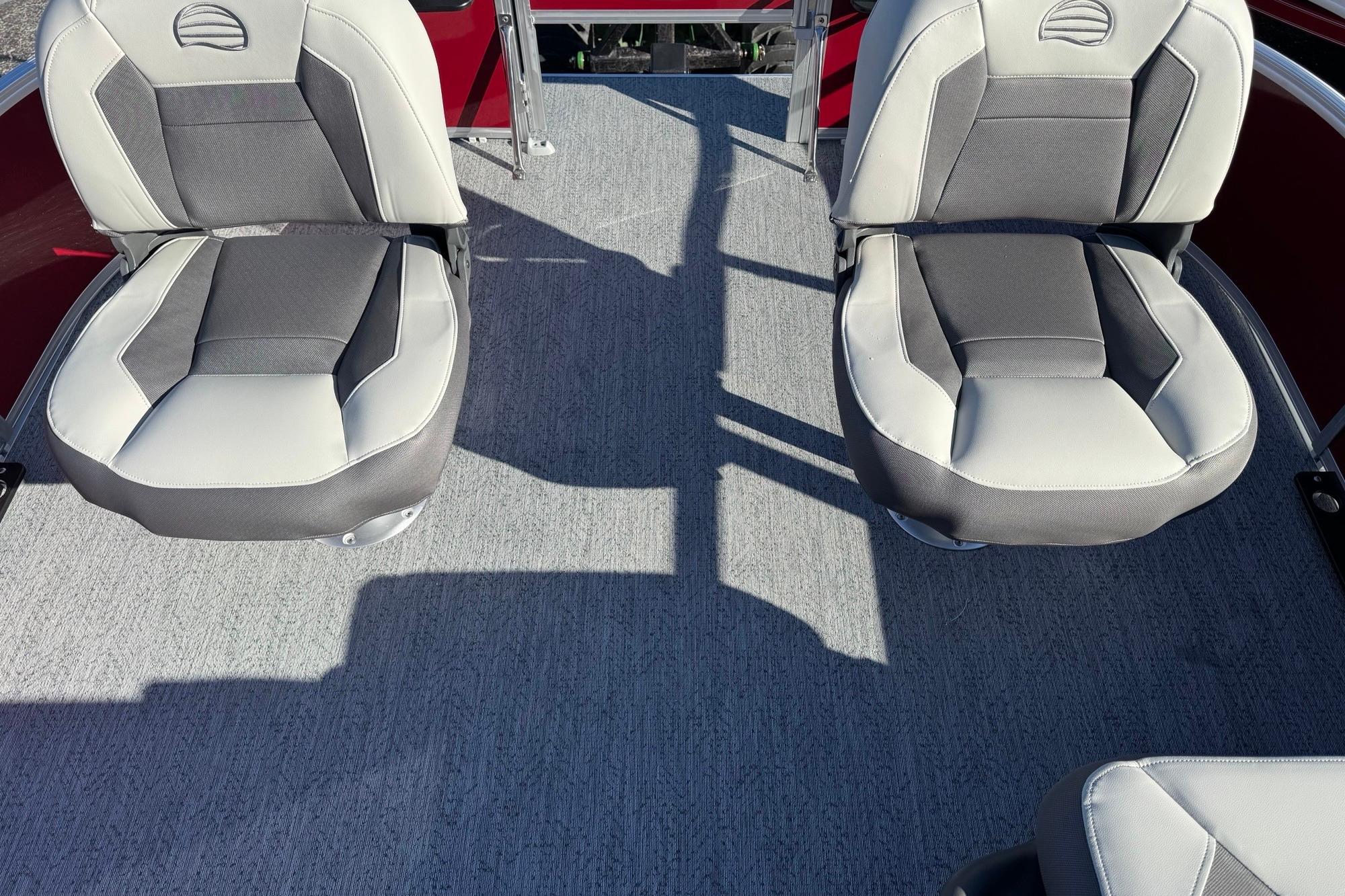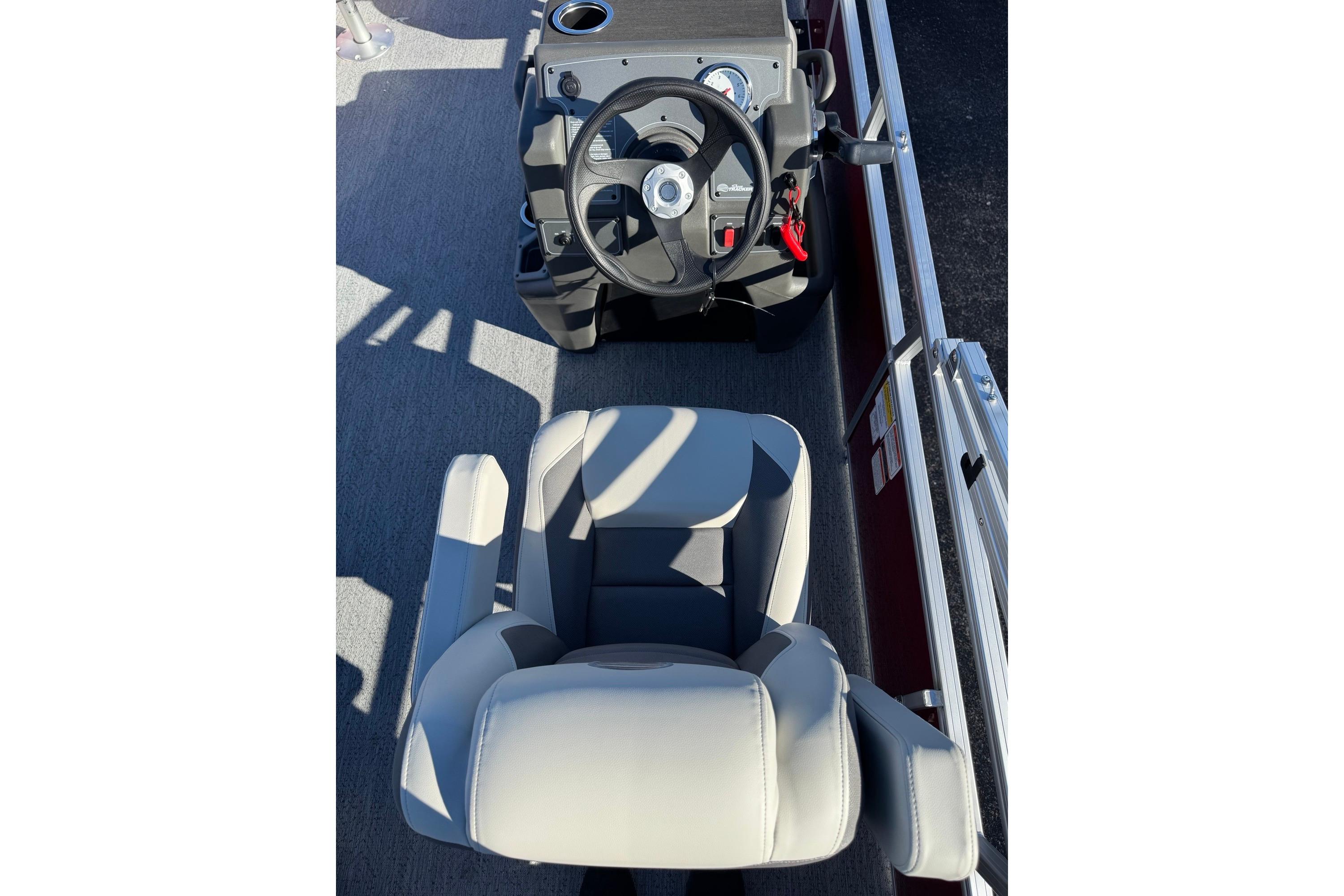 This seven-passenger fishing pontoon hits the water with new console and lounge designs. Get three extra cubic feet of storage thanks to clever backrest cut-outs. The redesign also adds a seat in front of the driver console, phone compartments, and four more cupholders. Cast from the shade of a standard 7' bimini top in one of the two folding fishing seats. Find your spot on the lake from the decked-out driver console, which comes with its own rod holder.