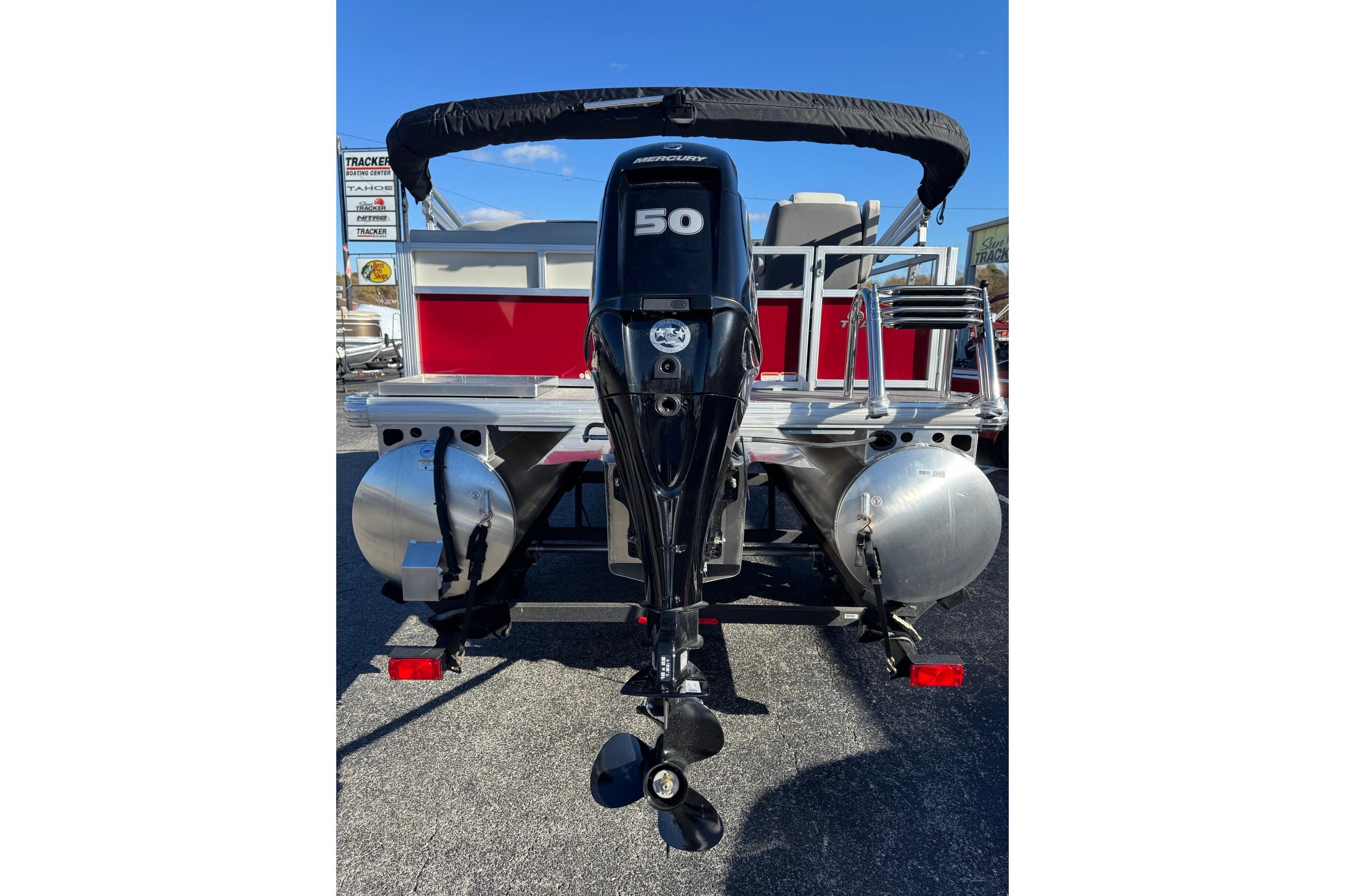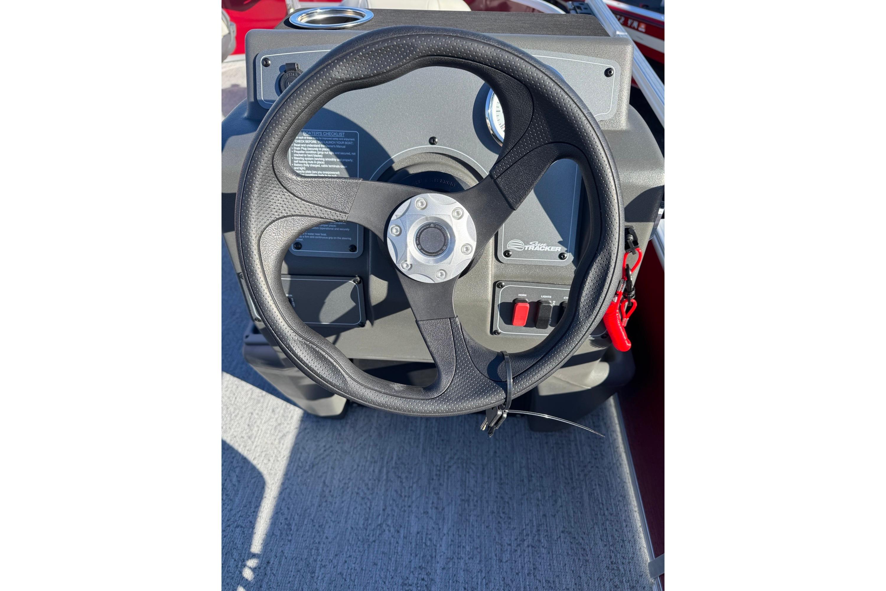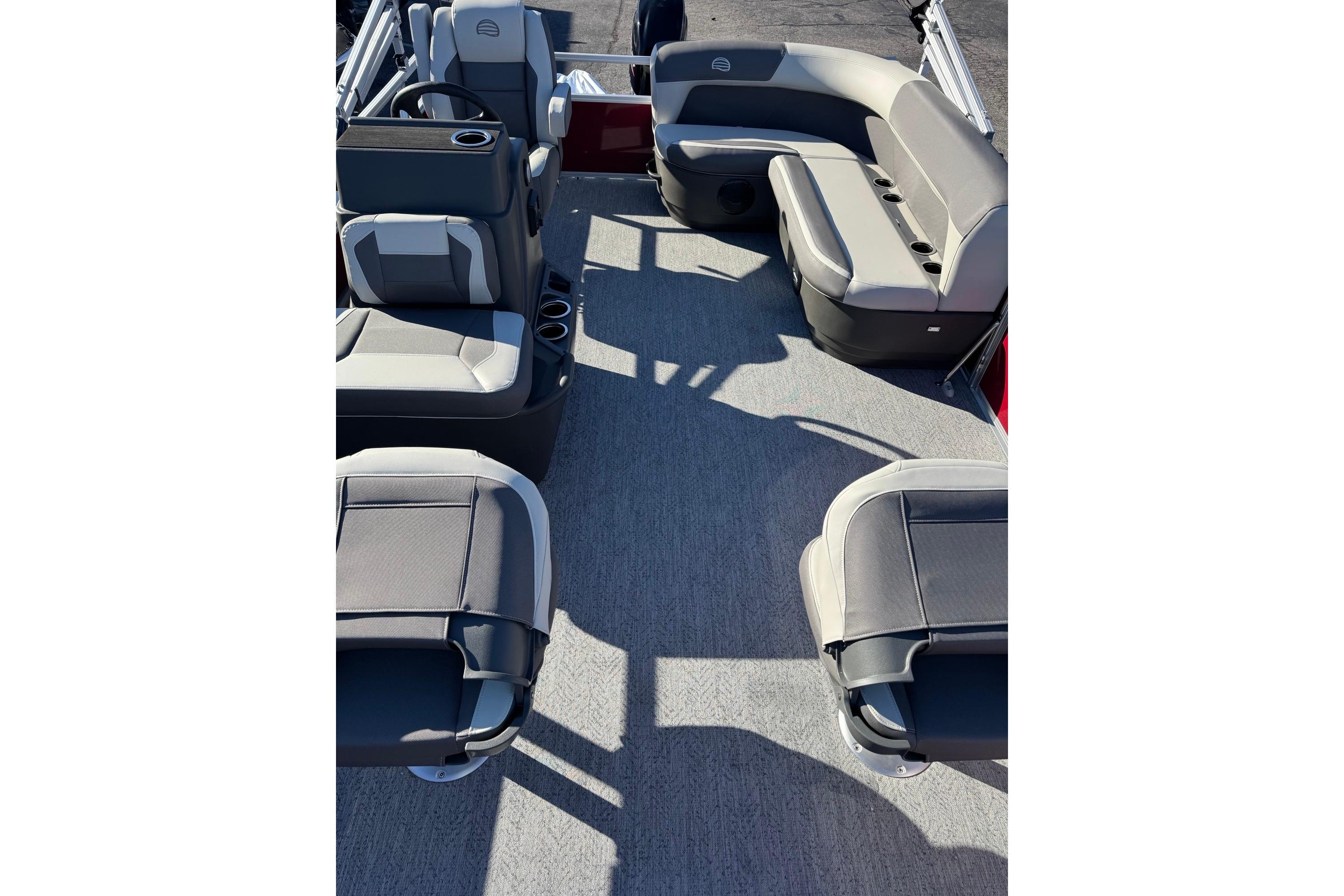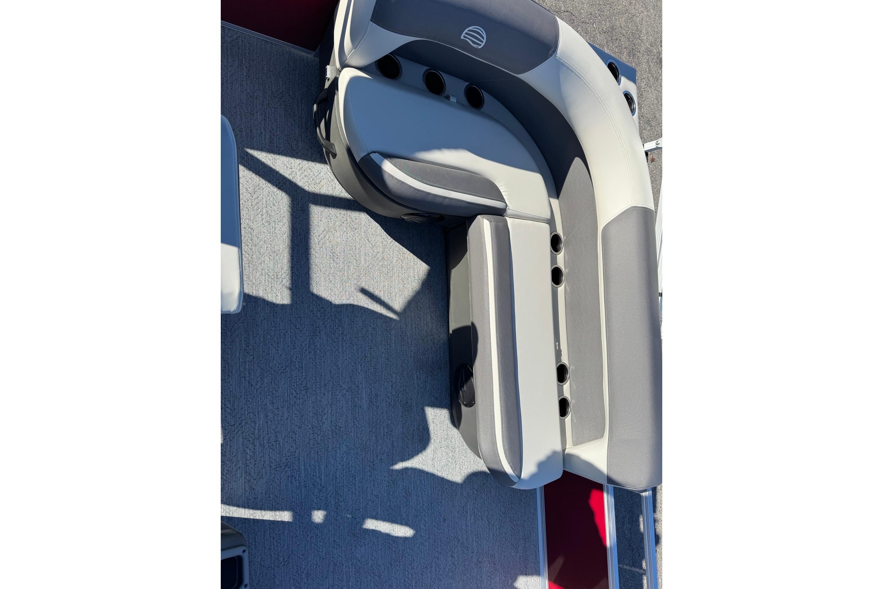 This seven-passenger fishing pontoon hits the water with new console and lounge designs. Get three extra cubic feet of storage thanks to clever backrest cut-outs. The redesign also adds a seat in front of the driver console, phone compartments, and four more cupholders. Cast from the shade of a standard 7' bimini top in one of the two folding fishing seats. Find your spot on the lake from the decked-out driver console, which comes with its own rod holder.
