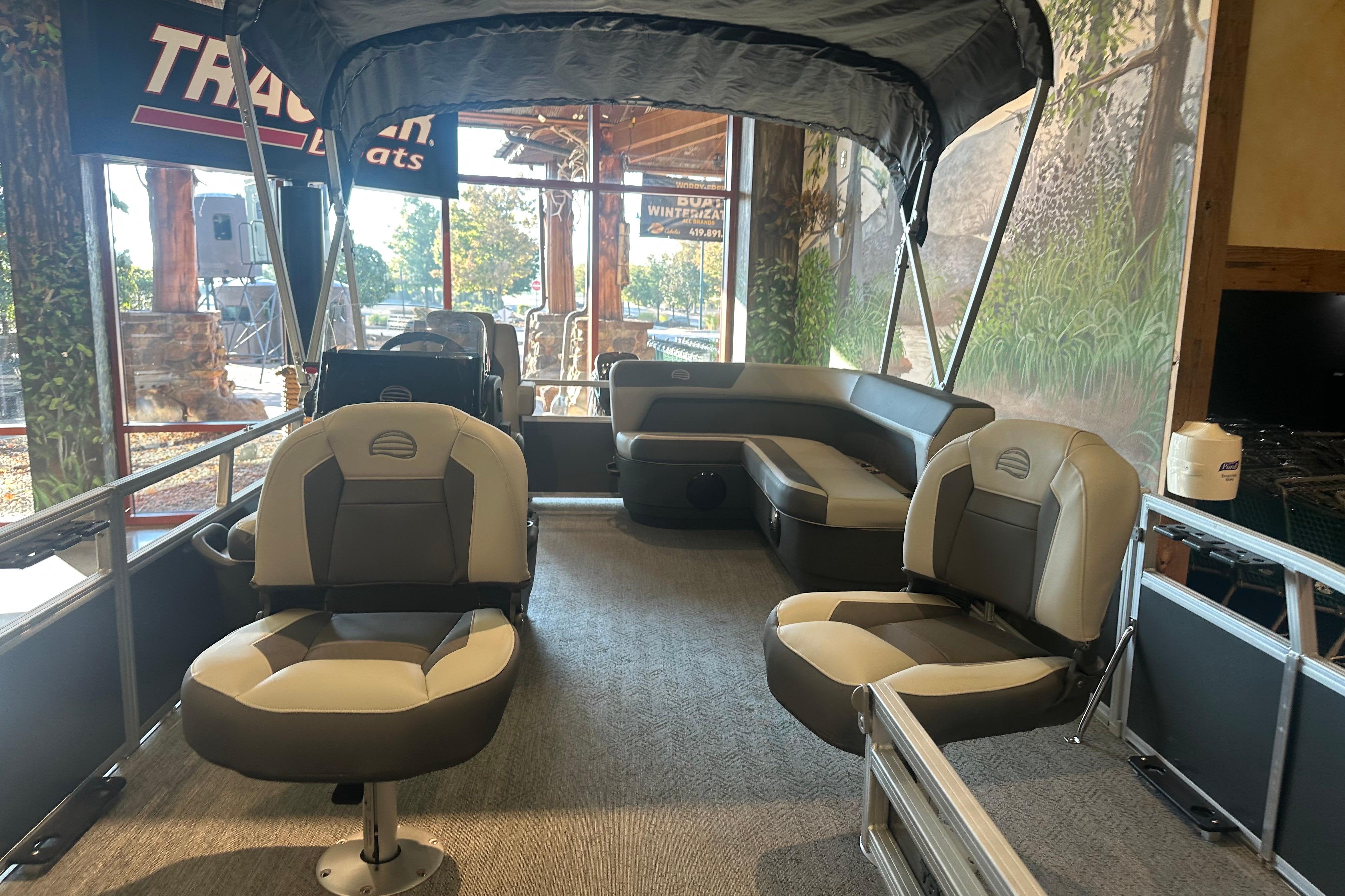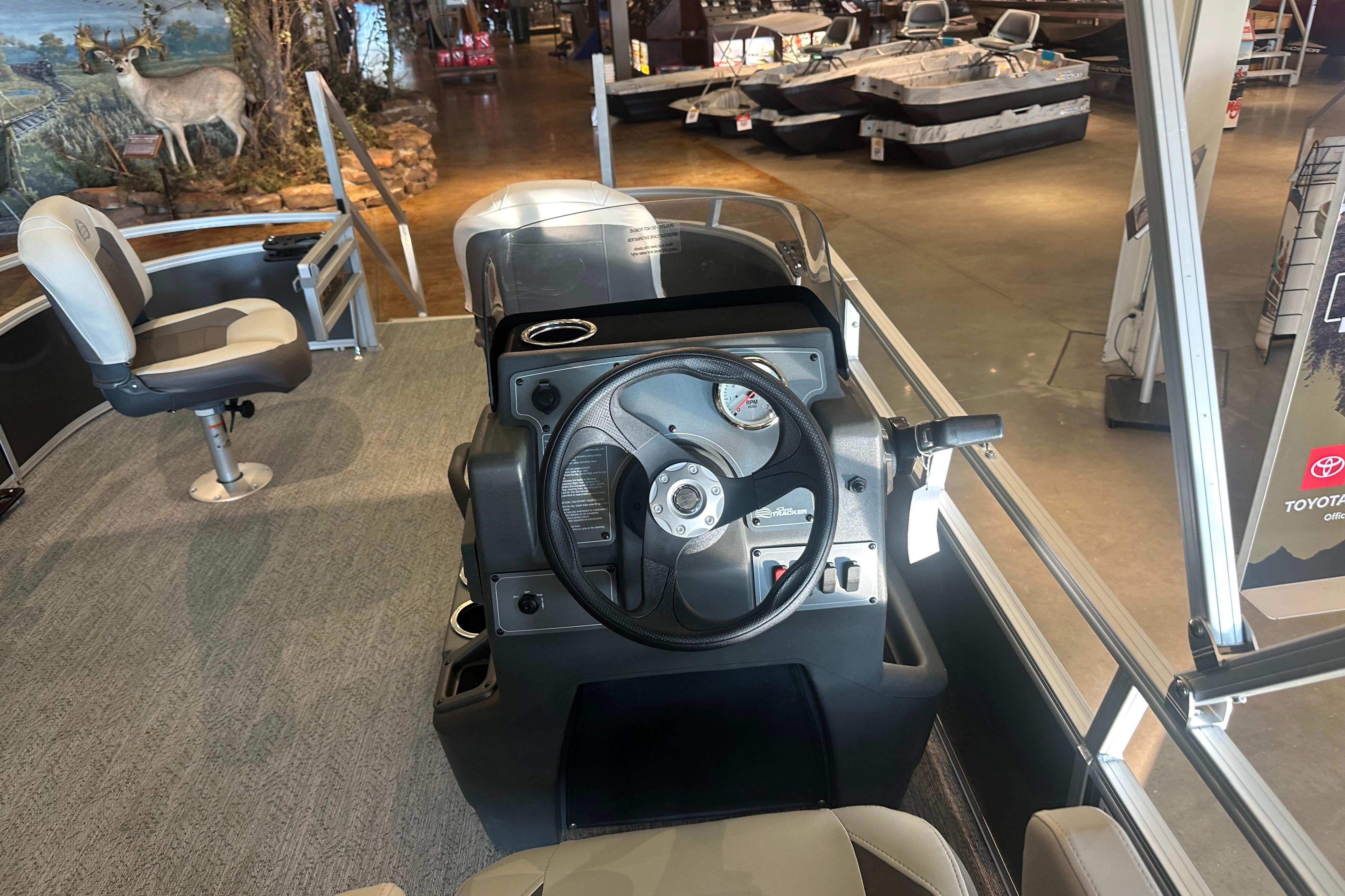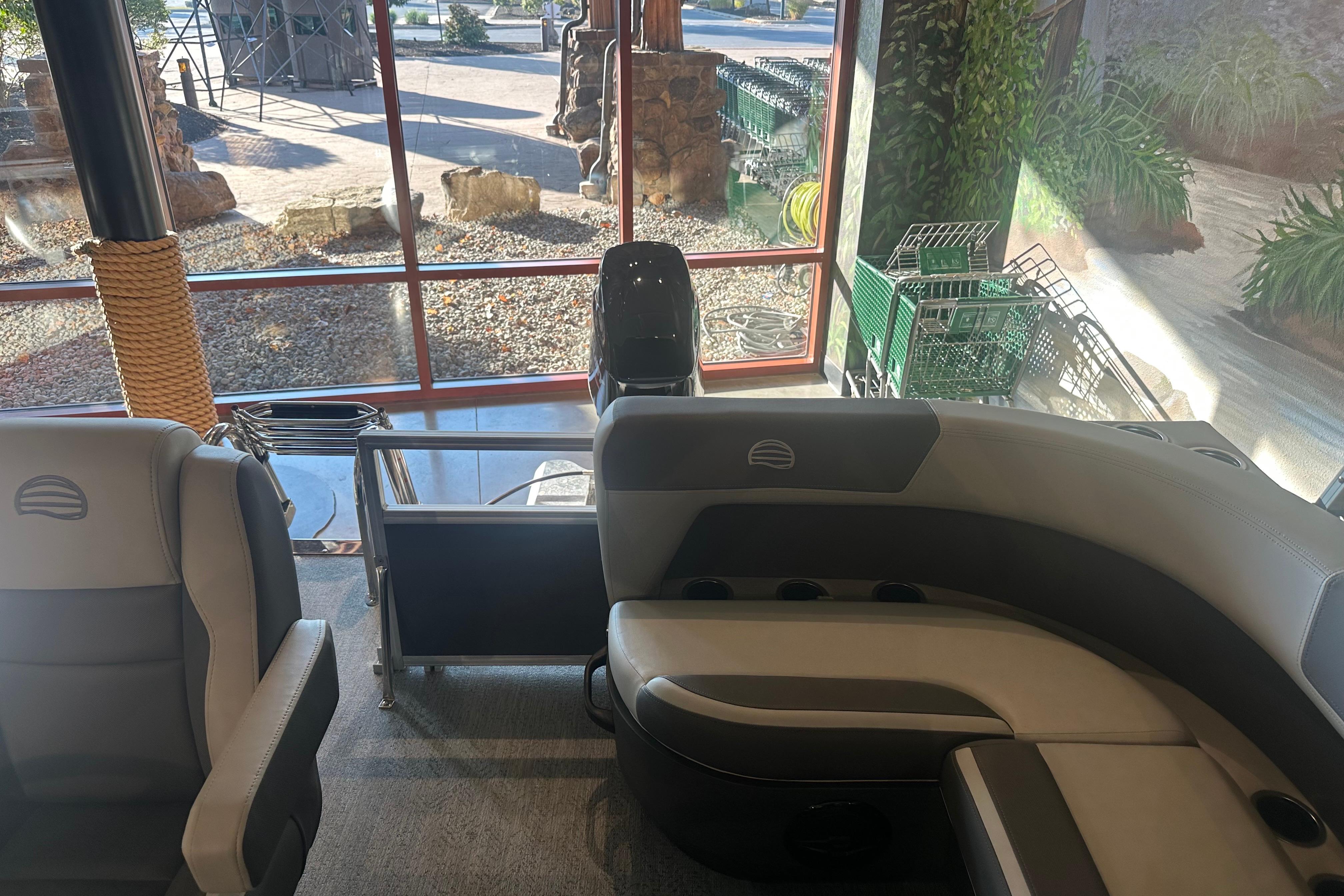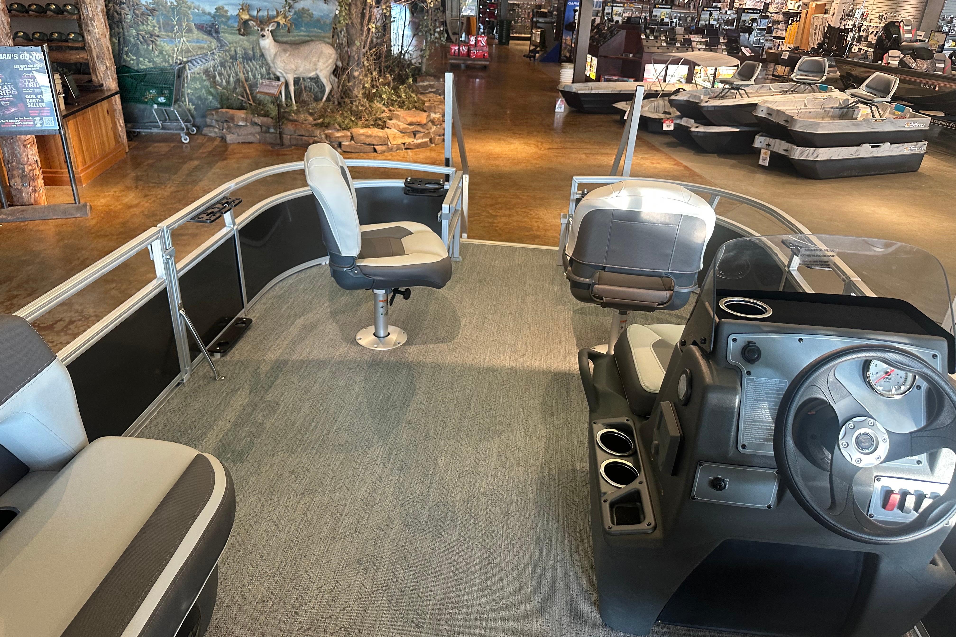This seven-passenger fishing pontoon hits the water with new console and lounge designs. Get three extra cubic feet of storage thanks to clever backrest cut-outs. The redesign also adds a seat in front of the driver console, phone compartments, and four more cupholders. Cast from the shade of a standard 7' bimini top in one of the two folding fishing seats. Find your spot on the lake from the decked-out driver console, which comes with its own rod holder.
