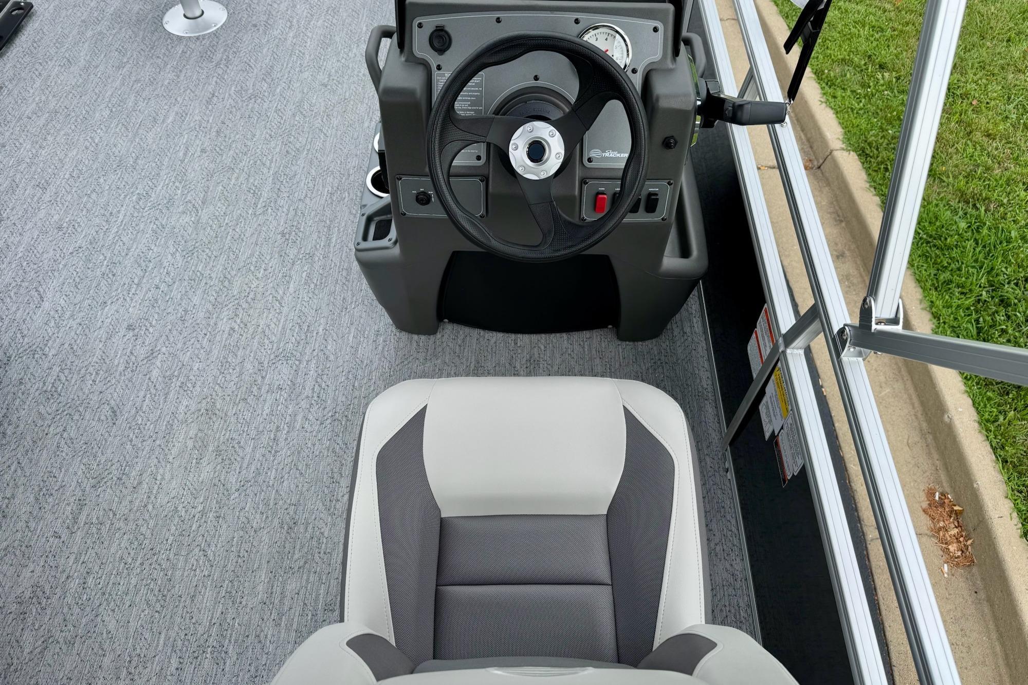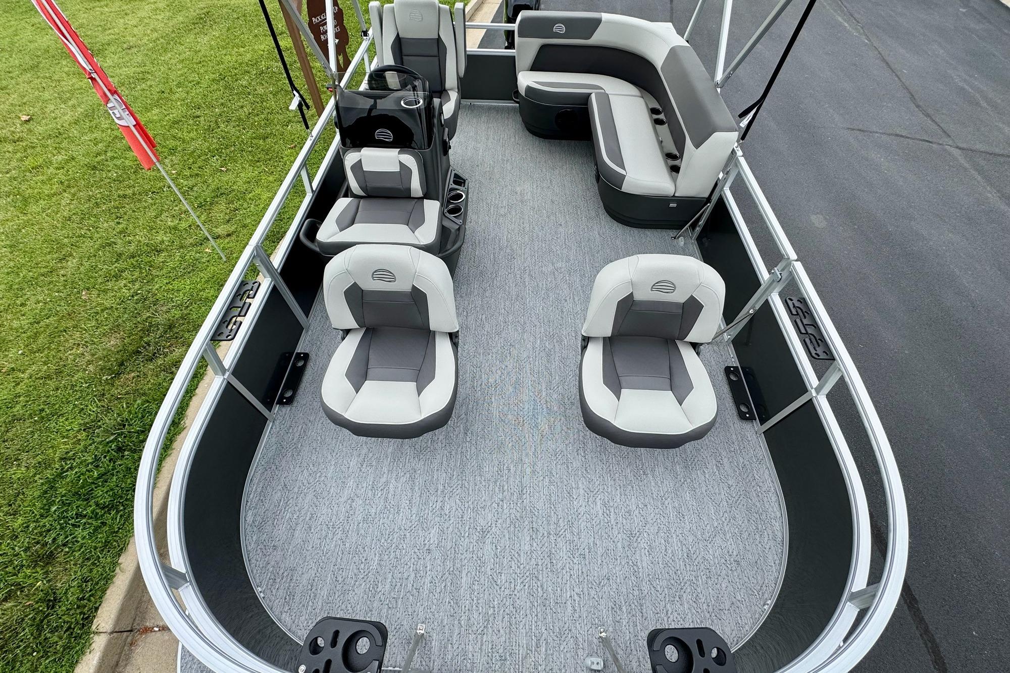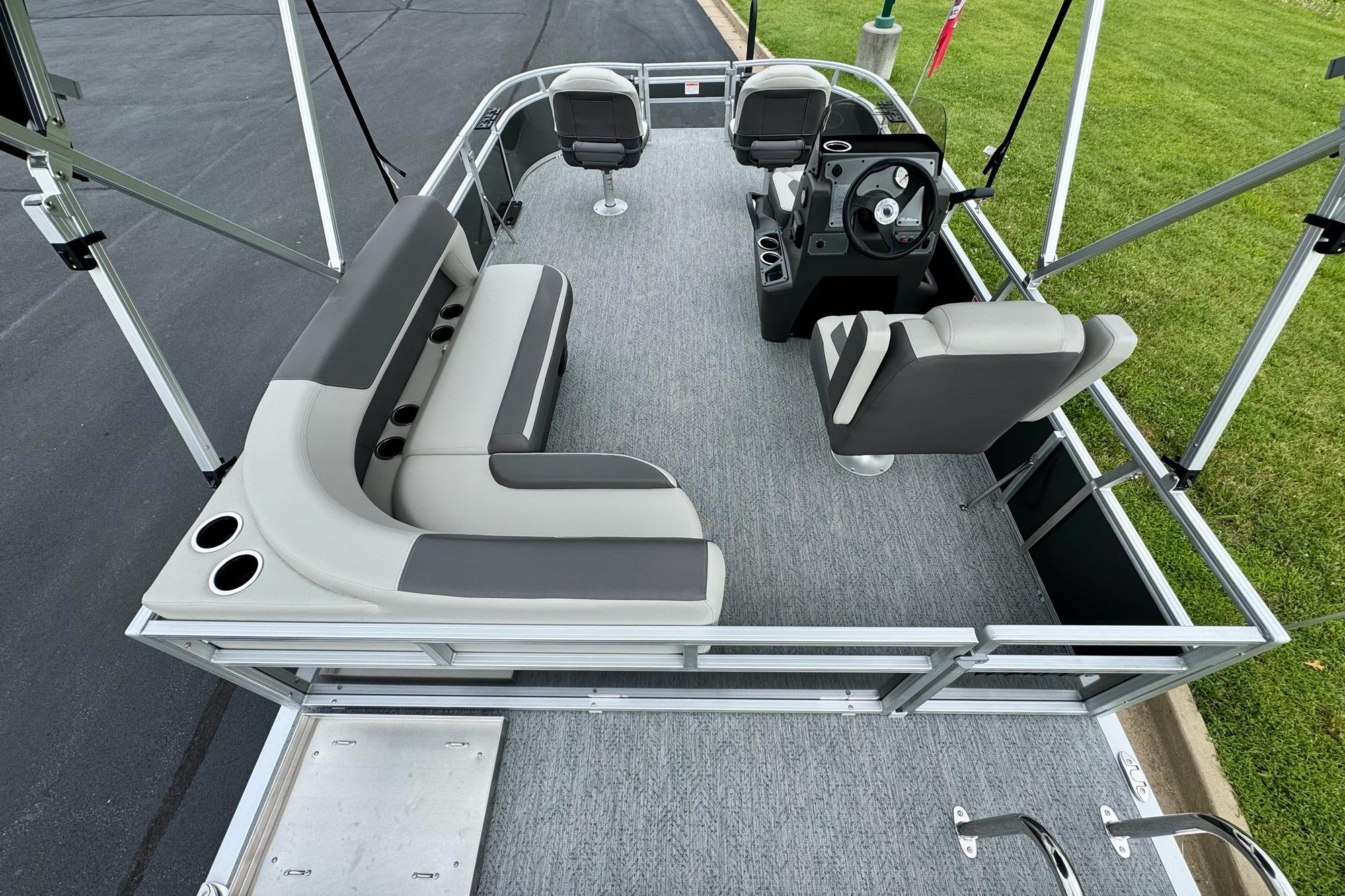 This seven-passenger fishing pontoon hits the water with new console and lounge designs. Get three extra cubic feet of storage thanks to clever backrest cut-outs. The redesign also adds a seat in front of the driver console, phone compartments, and four more cupholders. Cast from the shade of a standard 7' bimini top in one of the two folding fishing seats. Find your spot on the lake from the decked-out driver console, which comes with its own rod holder.