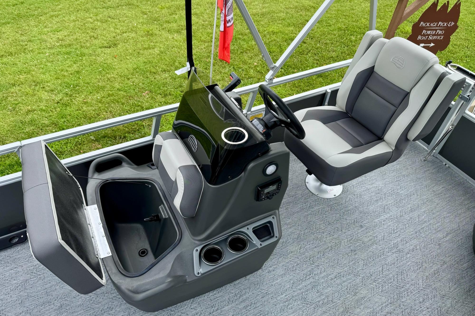 • Driver console w/vertical rod holder, integrated storage, drink holders & side-mounted controls