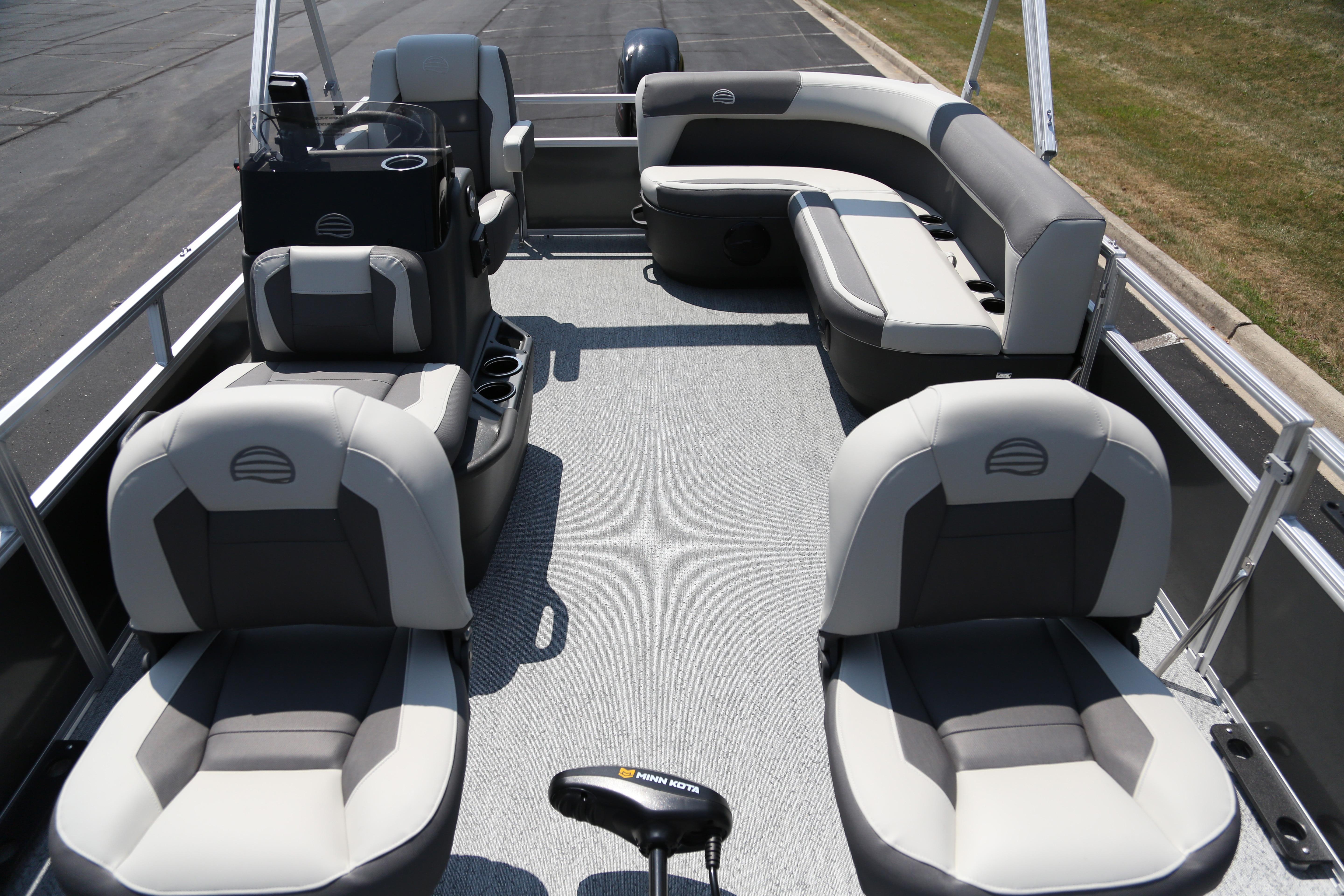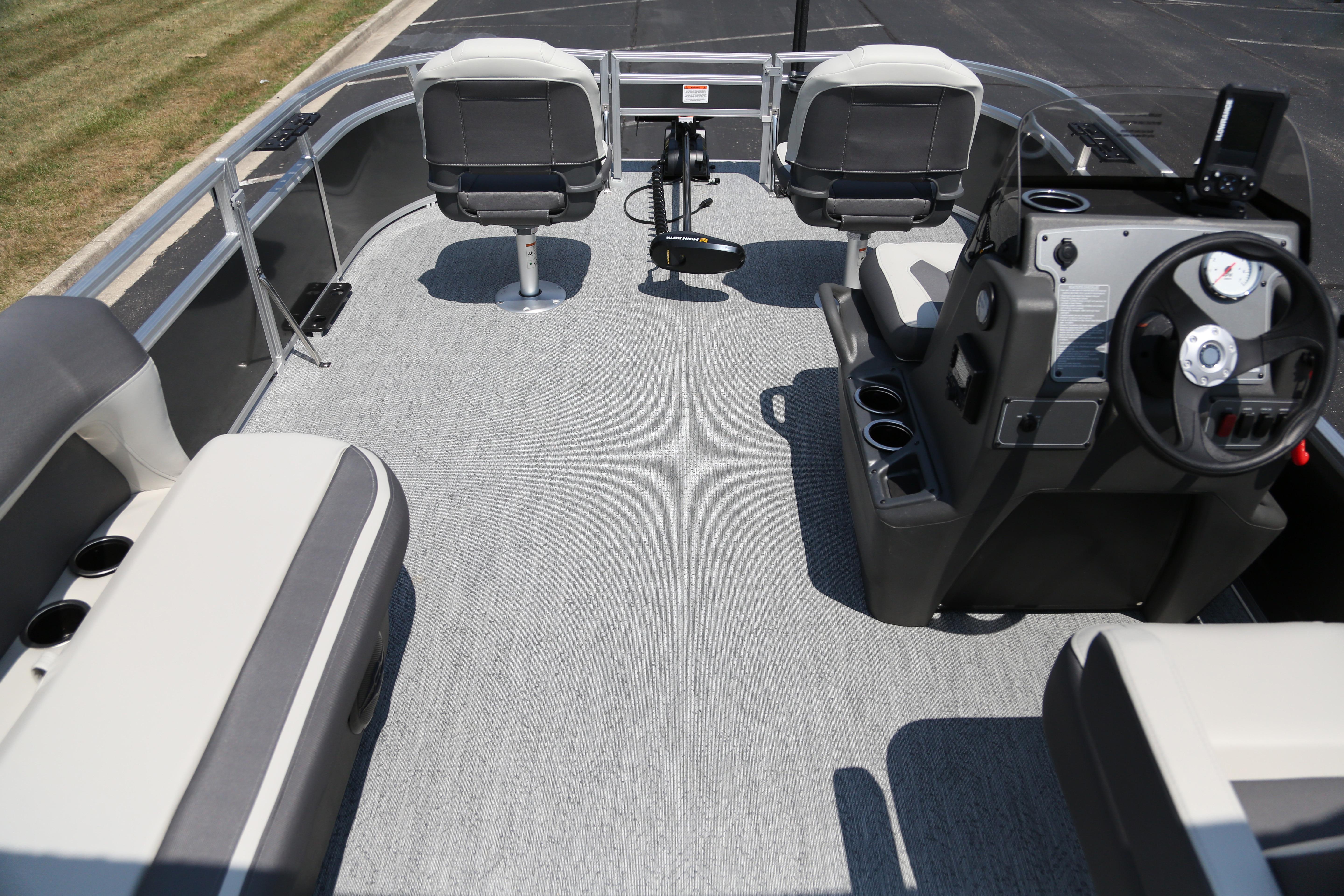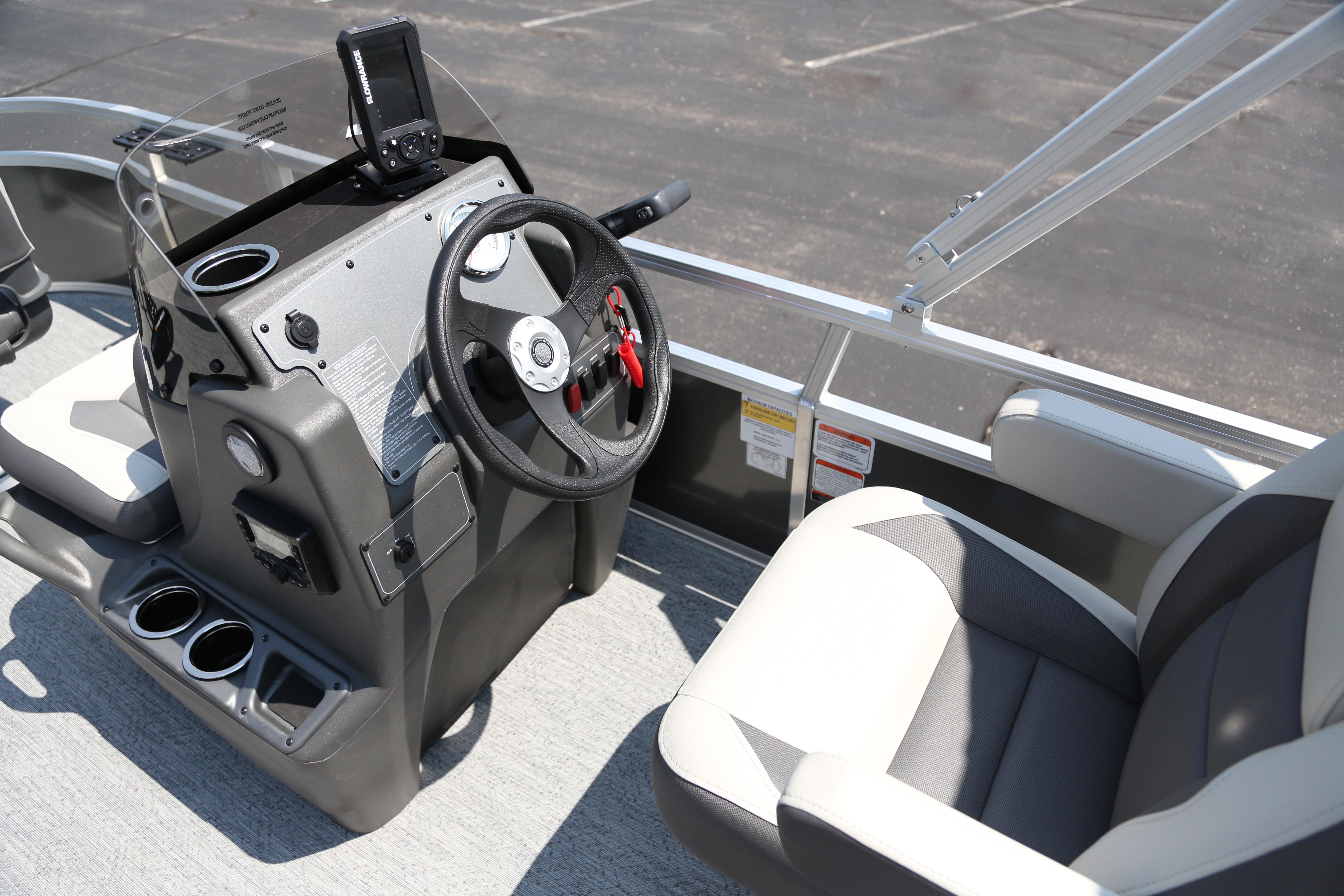This seven-passenger fishing pontoon hits the water with new console and lounge designs. Get three extra cubic feet of storage thanks to clever backrest cut-outs. The redesign also adds a seat in front of the driver console, phone compartments, and four more cupholders. Cast from the shade of a standard 7' bimini top in one of the two folding fishing seats. Find your spot on the lake from the decked-out driver console, which comes with its own rod holder.