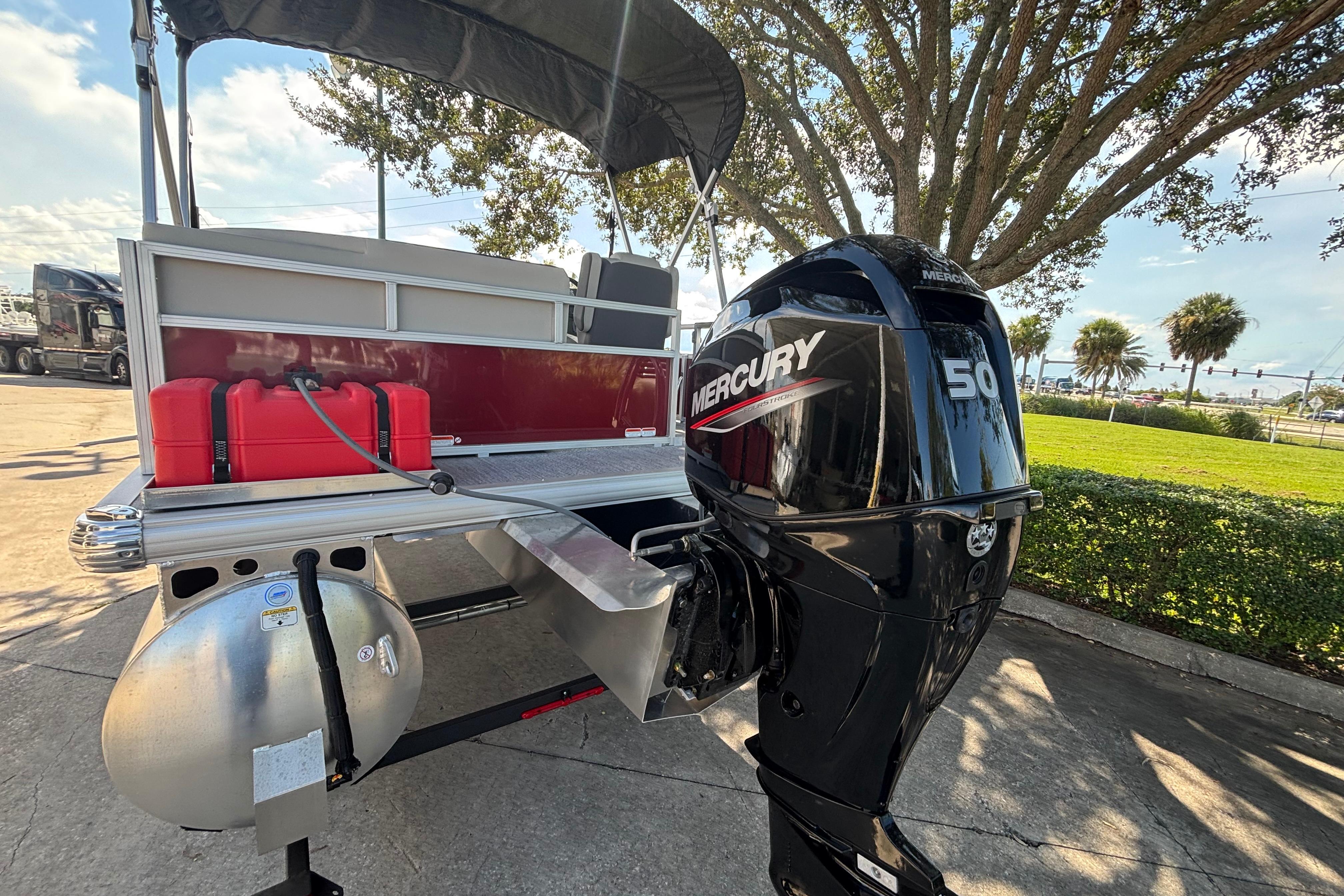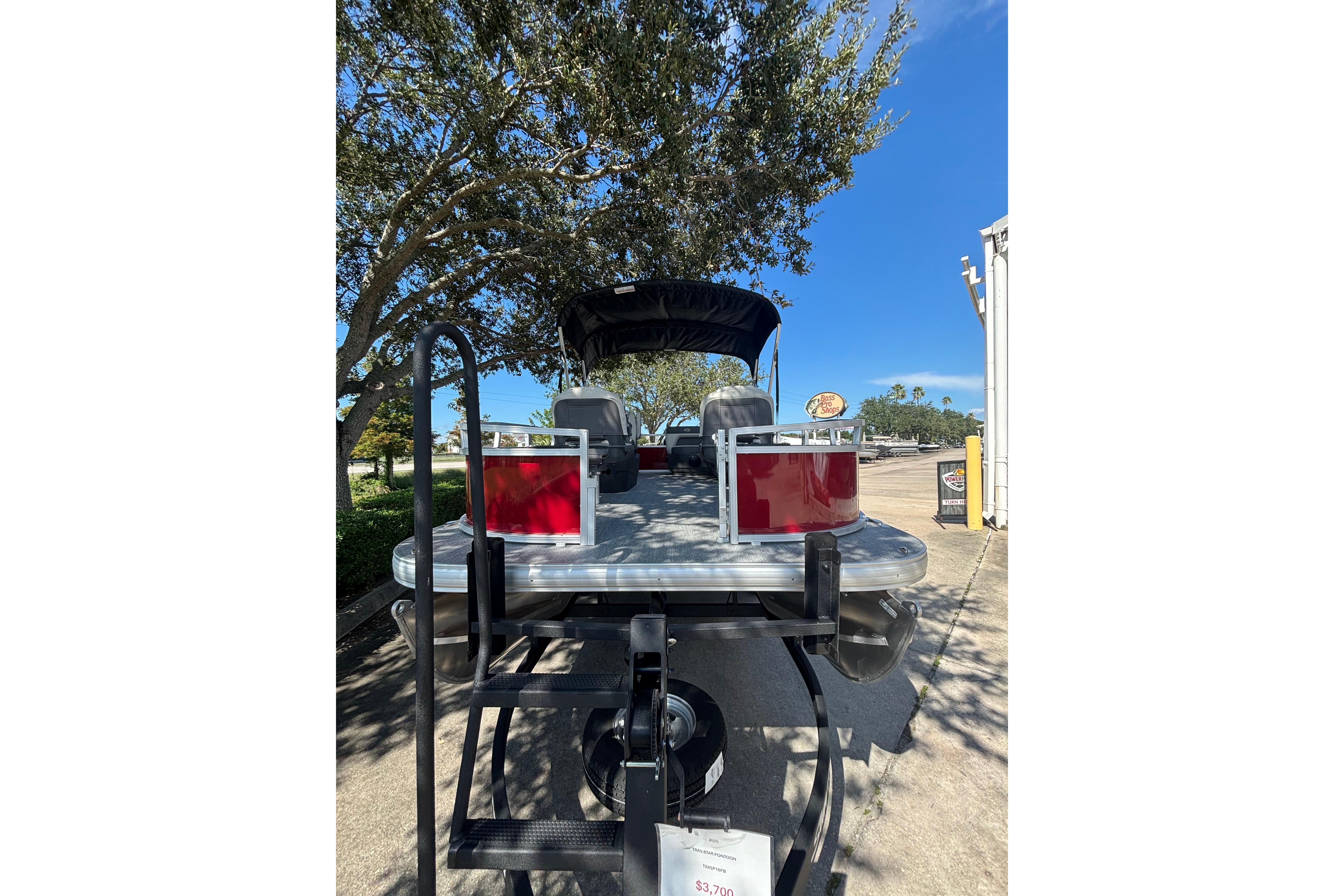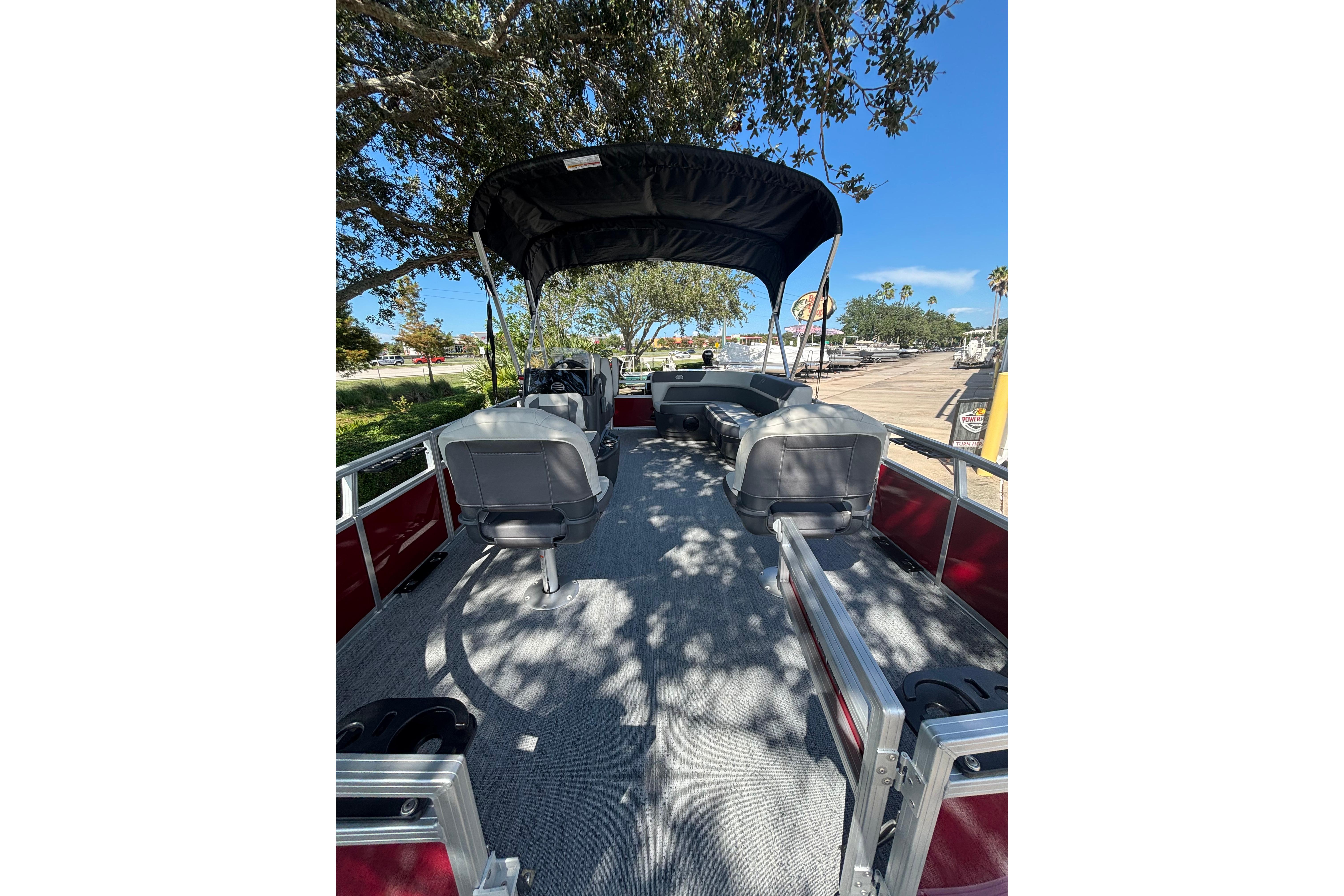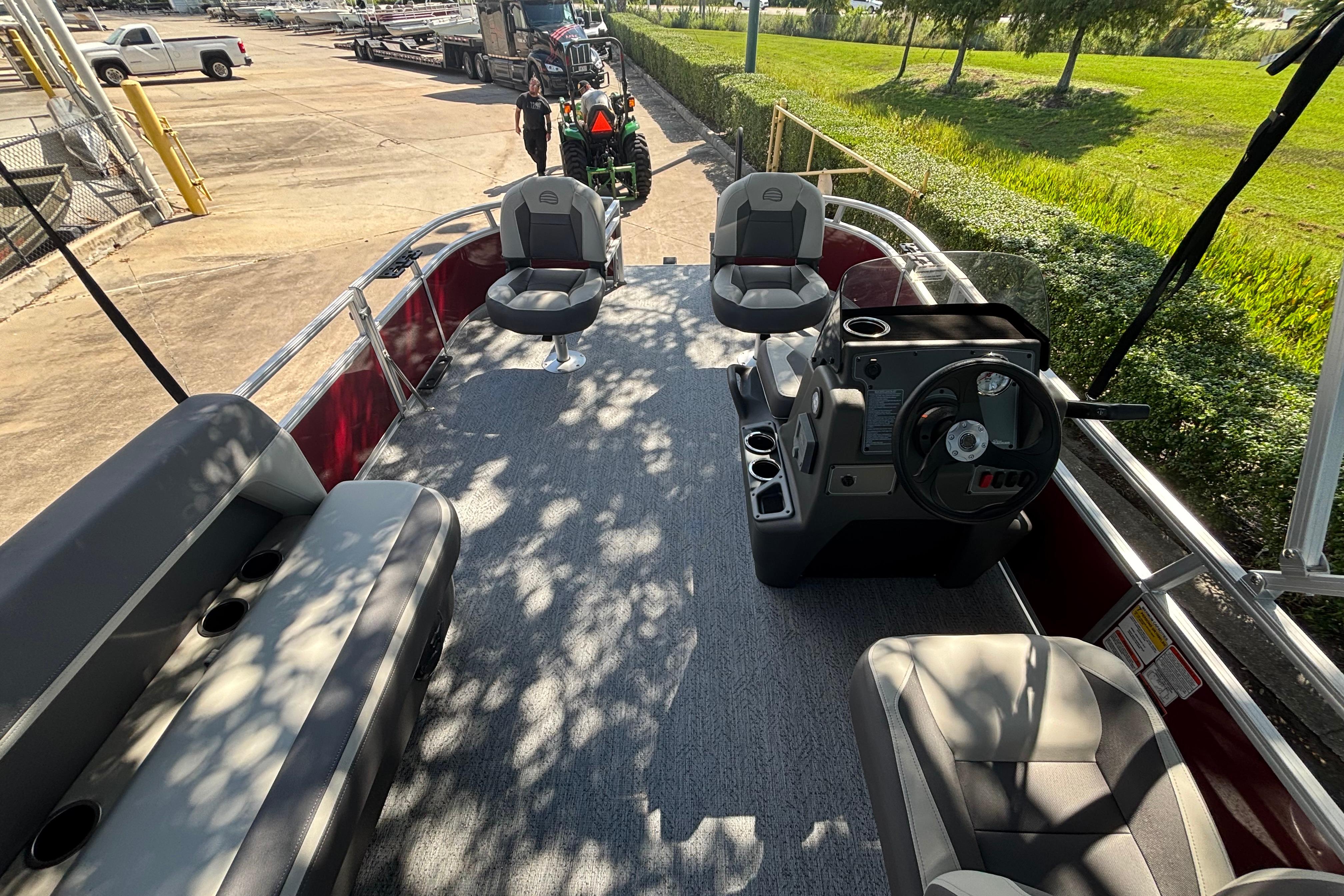 This seven-passenger fishing pontoon hits the water with new console and lounge designs. Get three extra cubic feet of storage thanks to clever backrest cut-outs. The redesign also adds a seat in front of the driver console, phone compartments, and four more cupholders. Cast from the shade of a standard 7' bimini top in one of the two folding fishing seats. Find your spot on the lake from the decked-out driver console, which comes with its own rod holder.