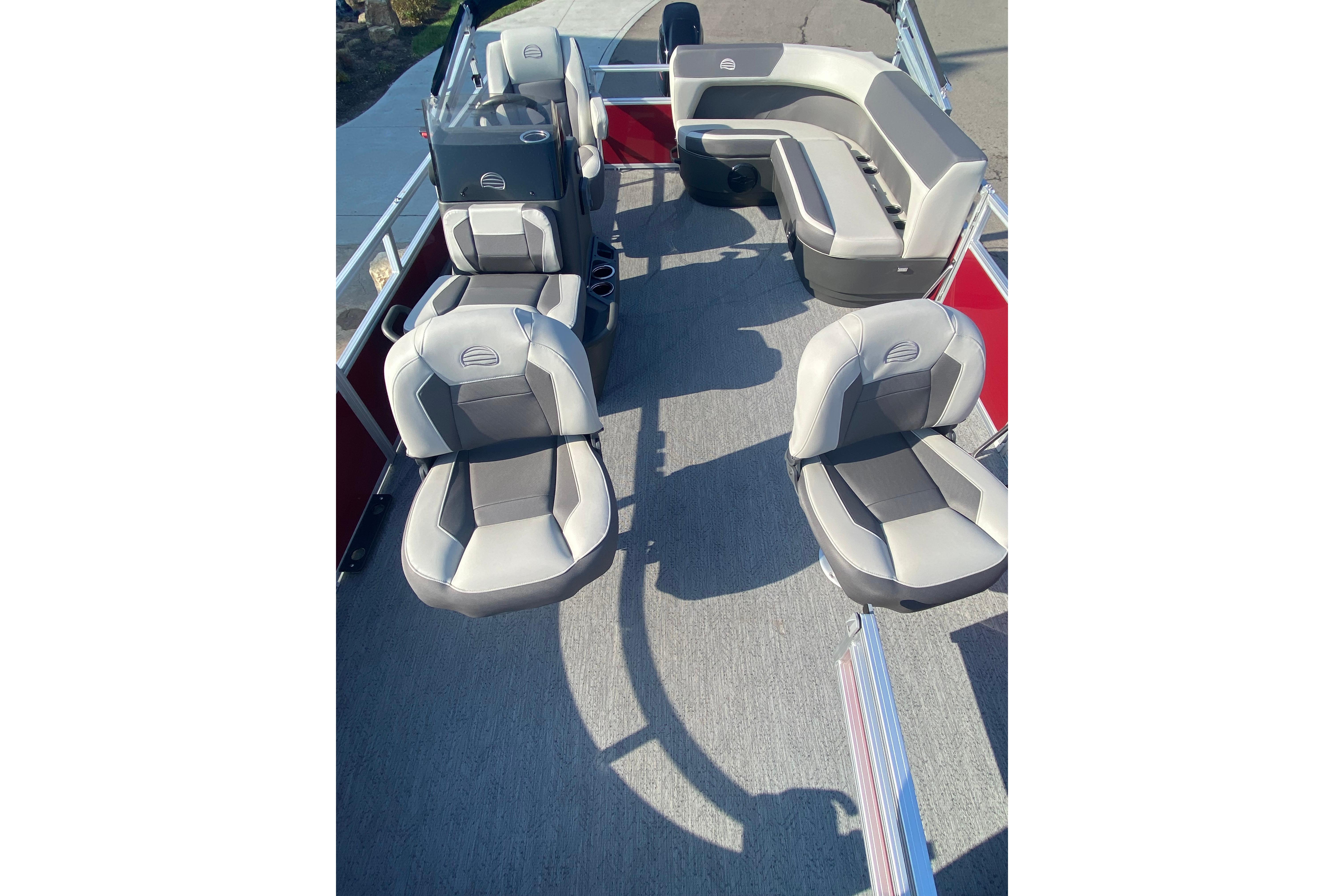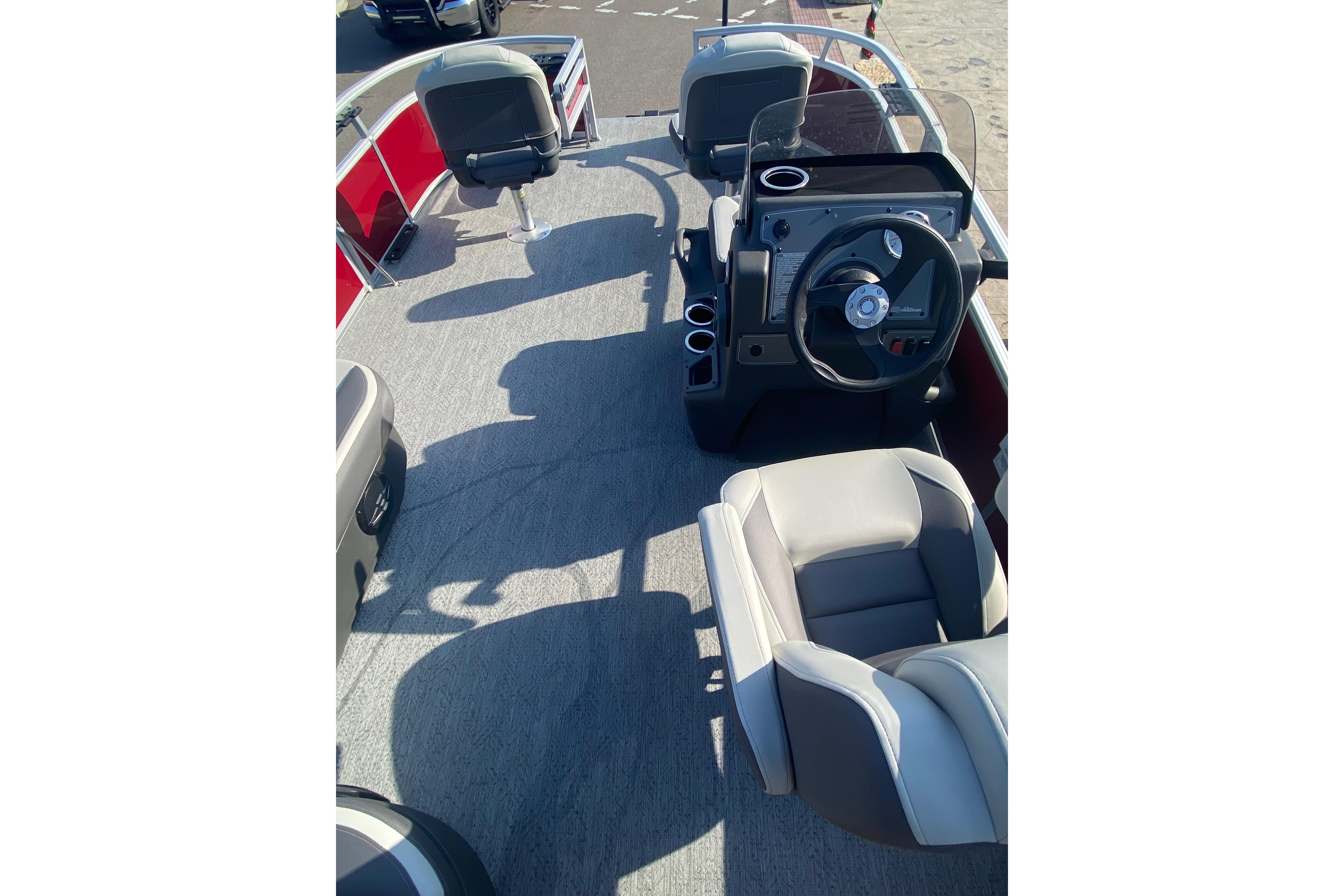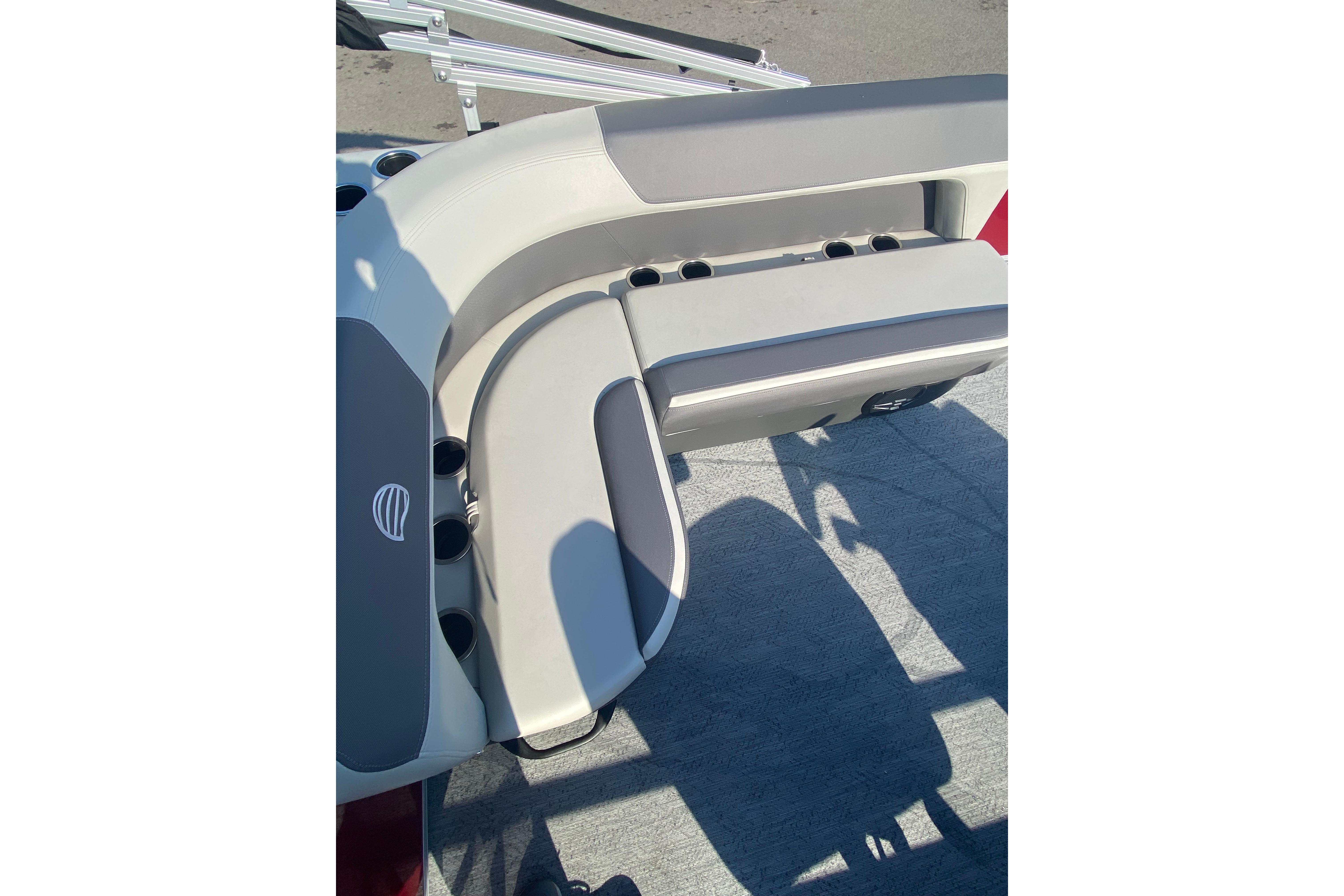 This seven-passenger fishing pontoon hits the water with new console and lounge designs. Get three extra cubic feet of storage thanks to clever backrest cut-outs. The redesign also adds a seat in front of the driver console, phone compartments, and four more cupholders. Cast from the shade of a standard 7' bimini top in one of the two folding fishing seats. Find your spot on the lake from the decked-out driver console, which comes with its own rod holder.