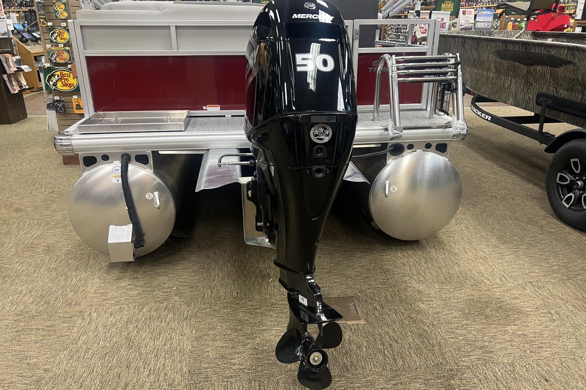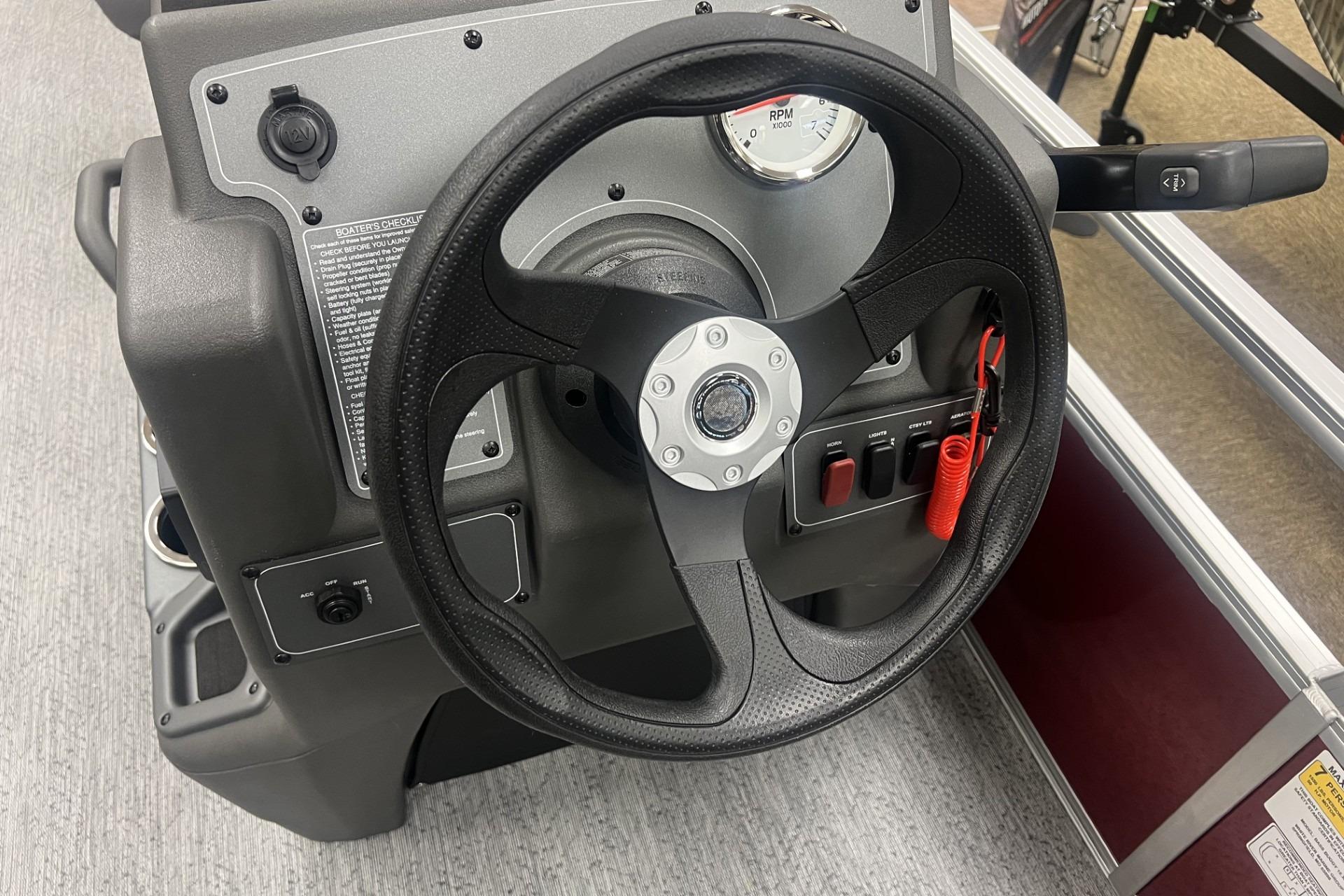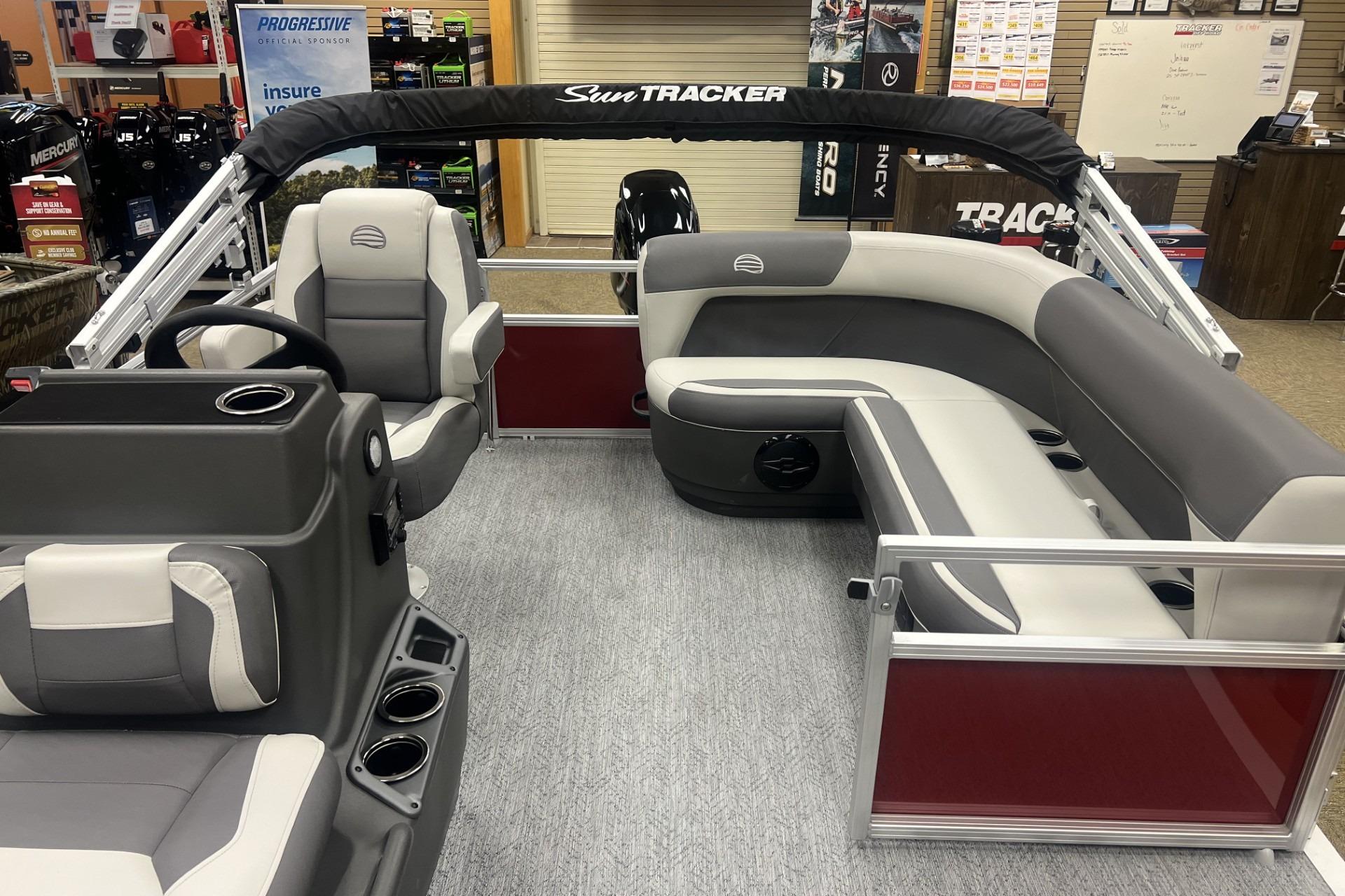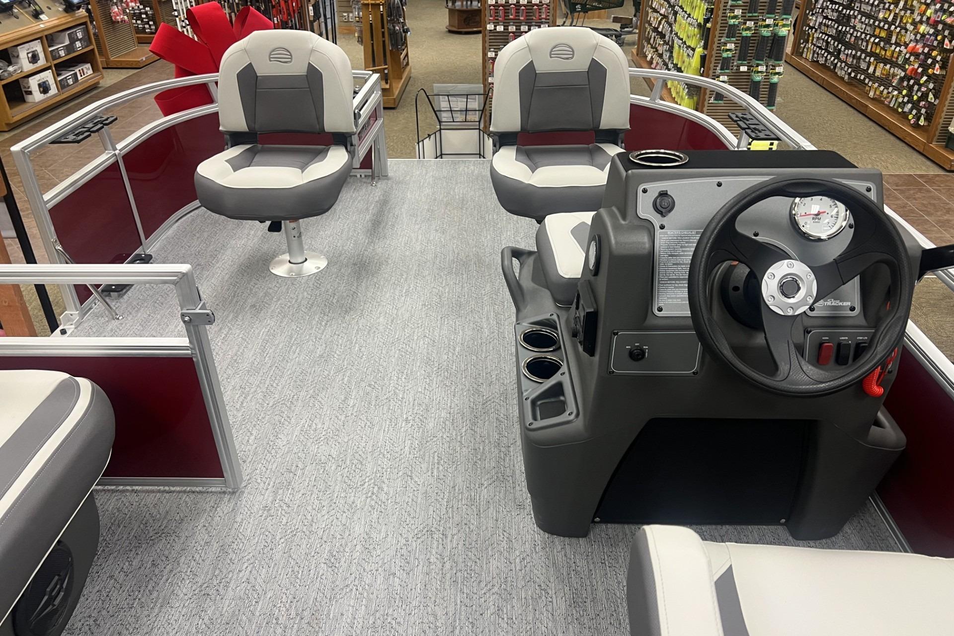 This seven-passenger fishing pontoon hits the water with new console and lounge designs. Get three extra cubic feet of storage thanks to clever backrest cut-outs. The redesign also adds a seat in front of the driver console, phone compartments, and four more cupholders. Cast from the shade of a standard 7' bimini top in one of the two folding fishing seats. Find your spot on the lake from the decked-out driver console, which comes with its own rod holder.
